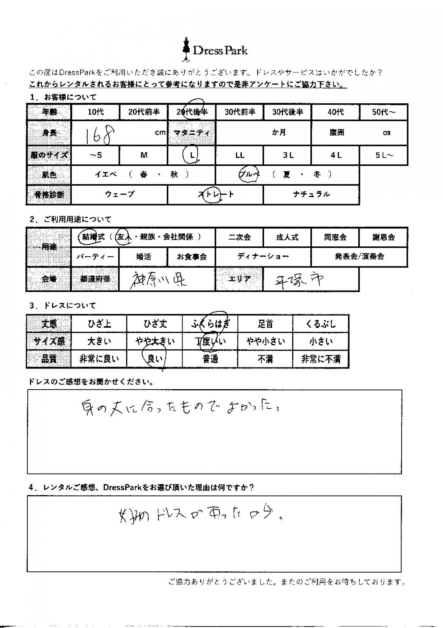 神奈川県 N.T様168㎝ Lサイズ #20代#M/L#165~169㎝#結婚式(友人)#神奈川県 ◆レンタルしたドレスはこちら ◆レンタルしたサイズは:L ◆レンタルした日付:2025/10/25 ドレスの着用感 ◆点数: (4点) ◆丈感:ふくらはぎ ◆サイズ感:丁度いい ◆品質:良い ◆肌色:ブルべ ◆骨格診断:ストレート ドレスの感想 身の丈に合ったものでよかった。 レンタルのご感想、DressParkをお選び頂いた理由 好みのドレスがあったから。 CUSTOMER REVIEWS お客様の声 気になるカテゴリー別にご利用の感想をチェック! ◆AGE 年代で見る 10代 20代 30代 40代 50代~ ◆SIZE サイズで見る SS/S M/L 大きいサイズLL~ ◆HIGHT 身長で見る 140~149㎝ 150~154㎝ 155~159㎝ 160~164㎝ 165~169㎝ 170㎝以上 ◆マタニティ ~3か月 4~6か月 7~8か月 9~10か月 ◆肌色 イエベ ブルべ ◆骨格診断 ウェーブ ストレート ナチュラル ◆利用シーン 結婚式(友人) 結婚式(親族) 結婚式(会社関係) 二次会 成人式 謝恩会 パーティー その他 CUSTOMER REVIEWS都道府県別お客様の声 都道府県別にのお客様の声をチェック! 北海道 青森県 岩手県 宮城県 秋田県 山形県 福島県 茨城県 栃木県 群馬県 埼玉県 千葉県 東京都 神奈川県 新潟県 富山県 石川県 福井県 山梨県 長野県 岐阜県 静岡県 愛知県 三重県 滋賀県 京都府 大阪府 兵庫県 奈良県 和歌山県 鳥取県 島根県 岡山県 広島県 山口県 徳島県 香川県 愛媛県 高知県 福岡県 佐賀県 長崎県 熊本県 大分県 宮崎県 鹿児島県 沖縄県 CUSTOMER REVIEWSエリア別お客様の声 都道府県別にのお客様の声をチェック! 札幌 仙台 名古屋 軽井沢 金沢 神戸・芦屋 博多 那覇 梅田・新大阪 難波・心斎橋 鎌倉・湘南 横浜・みなとみらい 舞浜・浦安・幕張 大宮・浦和 青山・表参道 六本木・麻布 渋谷・恵比寿 新宿 池袋 銀座・丸の内 お台場・汐留 鹿児島市 郡山市 福島市 東予 甲府・石和 LINEでお問い合わせ このサイトではJavaScriptを使用しています
