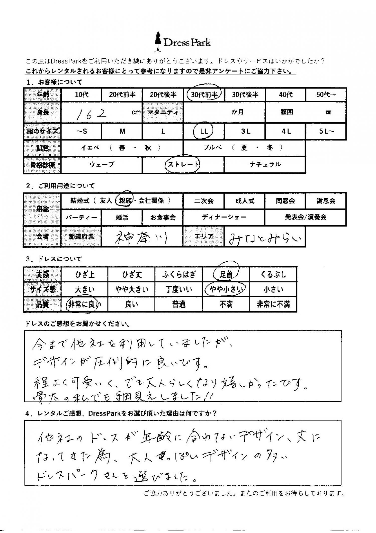 神奈川県 M.K様162㎝ LLサイズ横浜・みなとみらい #30代#大きいサイズLL~#160~164㎝#結婚式(親族)#神奈川県#横浜・みなとみらい ◆レンタルしたドレスはこちら ◆レンタルしたサイズは:L ◆レンタルした日付:2025/10/25 ドレスの着用感 ◆点数: (5点) ◆丈感:足首 ◆サイズ感:やや小さい ◆品質:非常に良い ◆骨格診断:ストレート ドレスの感想 今まで他社を利用していましたが、デザインが圧倒的に良いです。ほどよく可愛く、でも大人らしくなり嬉しかったです。骨太の私でも細見えしました! レンタルのご感想、DressParkをお選び頂いた理由 他社のドレスが年齢に合わないデザイン、丈になってきたため、大人っぽいデザインの多いドレスパークさんを選びました。 CUSTOMER REVIEWS お客様の声 気になるカテゴリー別にご利用の感想をチェック! ◆AGE 年代で見る 10代 20代 30代 40代 50代~ ◆SIZE サイズで見る SS/S M/L 大きいサイズLL~ ◆HIGHT 身長で見る 140~149㎝ 150~154㎝ 155~159㎝ 160~164㎝ 165~169㎝ 170㎝以上 ◆マタニティ ~3か月 4~6か月 7~8か月 9~10か月 ◆肌色 イエベ ブルべ ◆骨格診断 ウェーブ ストレート ナチュラル ◆利用シーン 結婚式(友人) 結婚式(親族) 結婚式(会社関係) 二次会 成人式 謝恩会 パーティー その他 CUSTOMER REVIEWS都道府県別お客様の声 都道府県別にのお客様の声をチェック! 北海道 青森県 岩手県 宮城県 秋田県 山形県 福島県 茨城県 栃木県 群馬県 埼玉県 千葉県 東京都 神奈川県 新潟県 富山県 石川県 福井県 山梨県 長野県 岐阜県 静岡県 愛知県 三重県 滋賀県 京都府 大阪府 兵庫県 奈良県 和歌山県 鳥取県 島根県 岡山県 広島県 山口県 徳島県 香川県 愛媛県 高知県 福岡県 佐賀県 長崎県 熊本県 大分県 宮崎県 鹿児島県 沖縄県 CUSTOMER REVIEWSエリア別お客様の声 都道府県別にのお客様の声をチェック! 札幌 仙台 名古屋 軽井沢 金沢 神戸・芦屋 博多 那覇 梅田・新大阪 難波・心斎橋 鎌倉・湘南 横浜・みなとみらい 舞浜・浦安・幕張 大宮・浦和 青山・表参道 六本木・麻布 渋谷・恵比寿 新宿 池袋 銀座・丸の内 お台場・汐留 鹿児島市 郡山市 福島市 東予 甲府・石和 LINEでお問い合わせ このサイトではJavaScriptを使用しています
