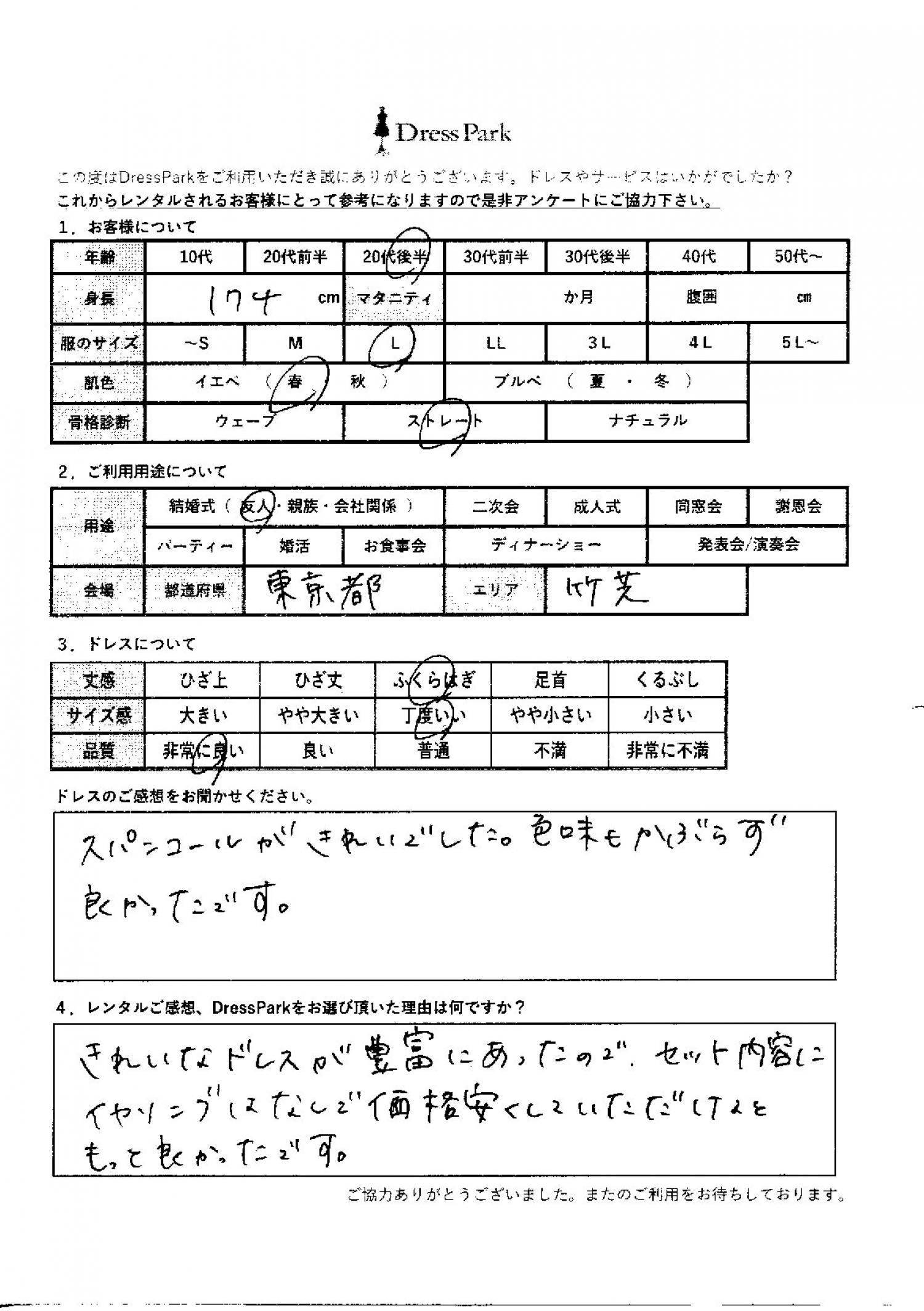 スパンコールが綺麗でした。色味もかぶらず良かったです。レンタルのご感想、