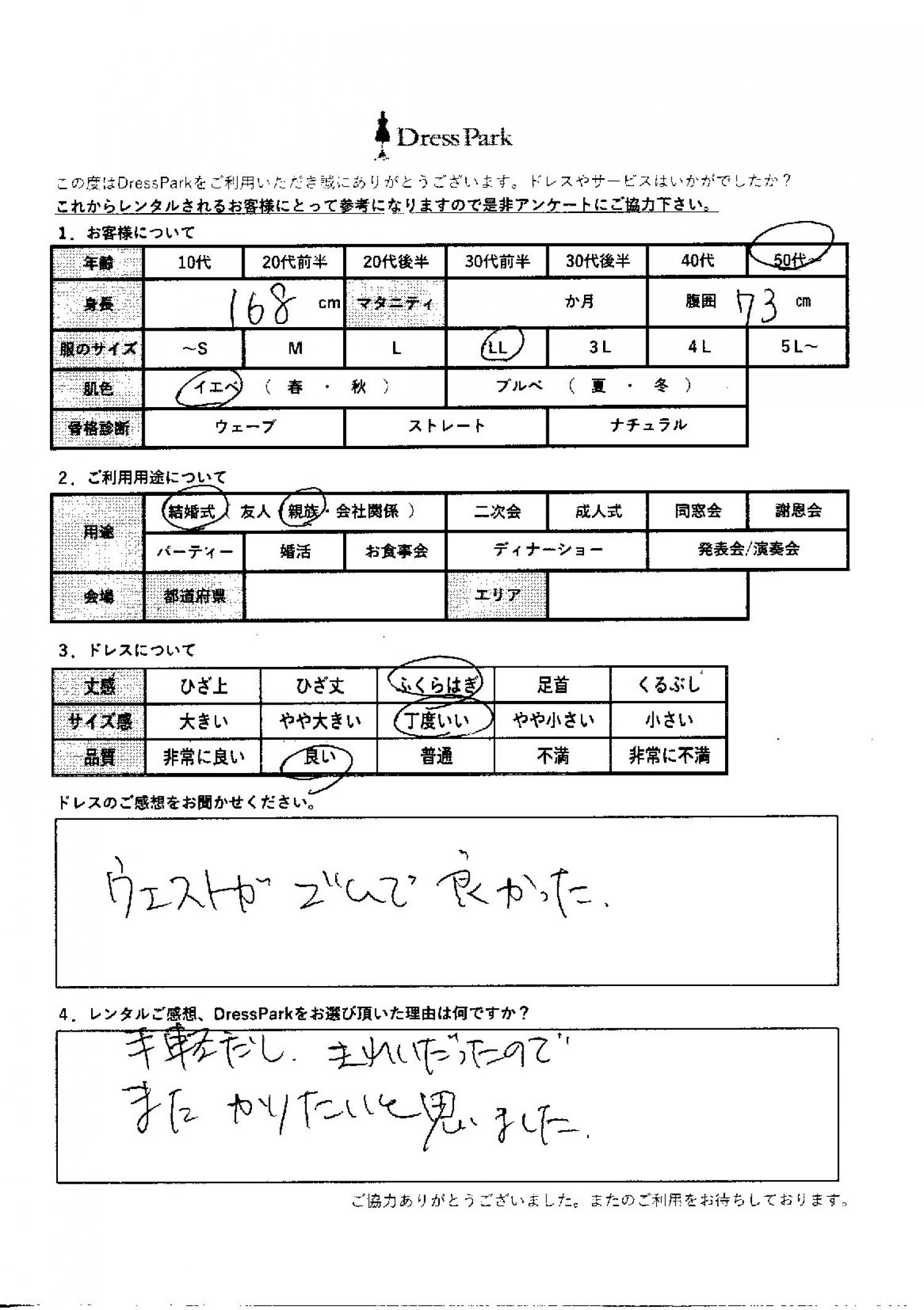 奈良県 M.S様168㎝ LLサイズ #50代~#大きいサイズLL~#165~169㎝#結婚式(親族)#奈良県 ◆レンタルしたドレスはこちら ◆レンタルしたサイズは:L ◆レンタルした日付:2025/10/25 ドレスの着用感 ◆点数: (4点) ◆丈感:ふくらはぎ ◆サイズ感:丁度いい ◆品質:良い ◆肌色:イエベ ドレスの感想 ウエストがゴムで良かった。 レンタルのご感想、DressParkをお選び頂いた理由 手軽だし、きれいだったので、また借りたいと思いました。 CUSTOMER REVIEWS お客様の声 気になるカテゴリー別にご利用の感想をチェック! ◆AGE 年代で見る 10代 20代 30代 40代 50代~ ◆SIZE サイズで見る SS/S M/L 大きいサイズLL~ ◆HIGHT 身長で見る 140~149㎝ 150~154㎝ 155~159㎝ 160~164㎝ 165~169㎝ 170㎝以上 ◆マタニティ ~3か月 4~6か月 7~8か月 9~10か月 ◆肌色 イエベ ブルべ ◆骨格診断 ウェーブ ストレート ナチュラル ◆利用シーン 結婚式(友人) 結婚式(親族) 結婚式(会社関係) 二次会 成人式 謝恩会 パーティー その他 CUSTOMER REVIEWS都道府県別お客様の声 都道府県別にのお客様の声をチェック! 北海道 青森県 岩手県 宮城県 秋田県 山形県 福島県 茨城県 栃木県 群馬県 埼玉県 千葉県 東京都 神奈川県 新潟県 富山県 石川県 福井県 山梨県 長野県 岐阜県 静岡県 愛知県 三重県 滋賀県 京都府 大阪府 兵庫県 奈良県 和歌山県 鳥取県 島根県 岡山県 広島県 山口県 徳島県 香川県 愛媛県 高知県 福岡県 佐賀県 長崎県 熊本県 大分県 宮崎県 鹿児島県 沖縄県 CUSTOMER REVIEWSエリア別お客様の声 都道府県別にのお客様の声をチェック! 札幌 仙台 名古屋 軽井沢 金沢 神戸・芦屋 博多 那覇 梅田・新大阪 難波・心斎橋 鎌倉・湘南 横浜・みなとみらい 舞浜・浦安・幕張 大宮・浦和 青山・表参道 六本木・麻布 渋谷・恵比寿 新宿 池袋 銀座・丸の内 お台場・汐留 鹿児島市 郡山市 福島市 東予 甲府・石和 LINEでお問い合わせ このサイトではJavaScriptを使用しています