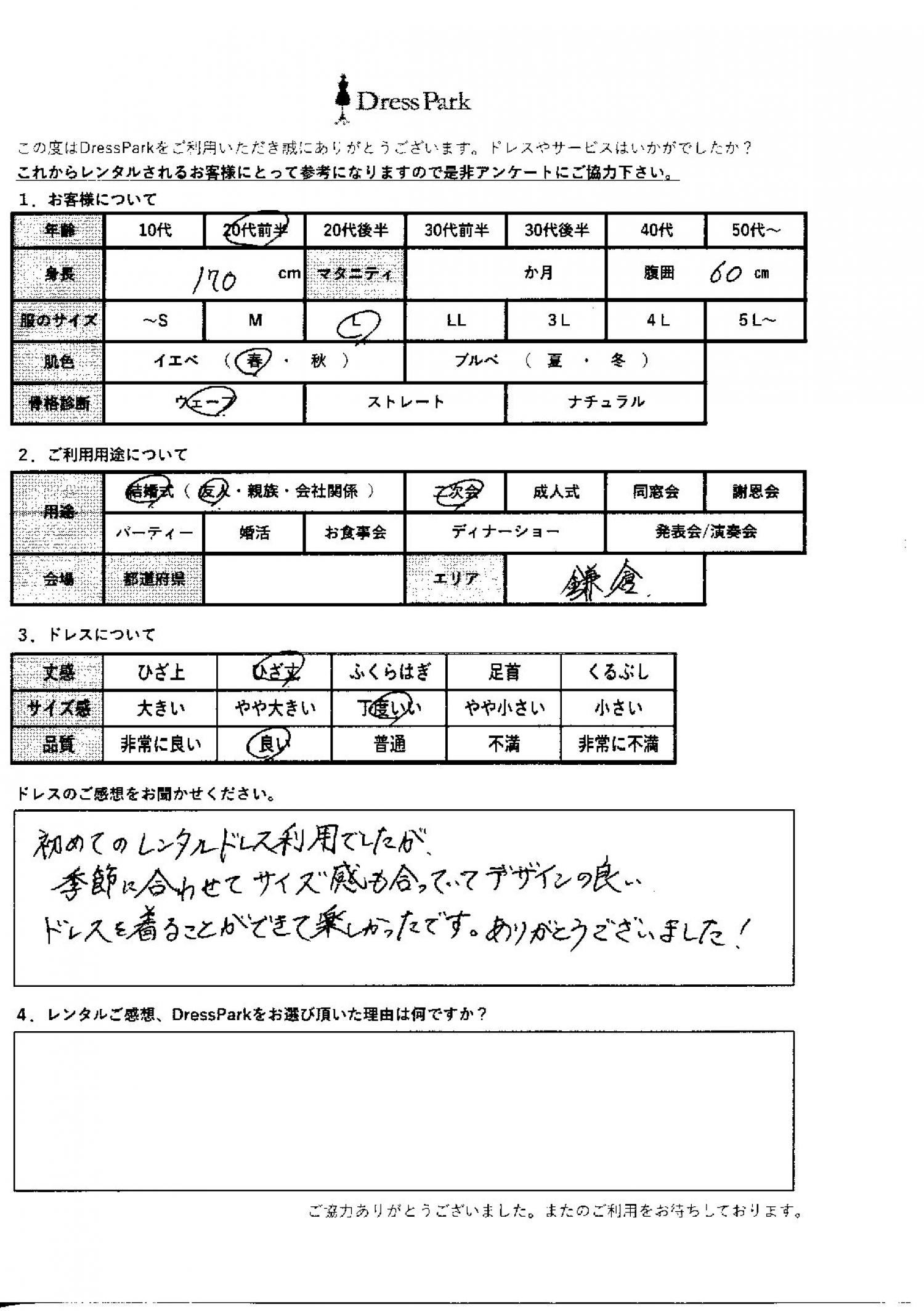 神奈川県 M.T様170㎝ Lサイズ鎌倉・湘南 #20代#M/L#170㎝以上#結婚式(友人)#神奈川県#鎌倉・湘南 ◆レンタルしたドレスはこちら ◆レンタルしたサイズは:L ◆レンタルした日付:2025/10/25 ドレスの着用感 ◆点数: (4点) ◆丈感:ひざ丈 ◆サイズ感:丁度いい ◆品質:良い ◆肌色:イエベ ◆骨格診断:ウェーブ ドレスの感想 はじめてのレンタルドレス利用でしたが、季節に合わせてサイズ感も合っていて、デザインの良いドレスを着ることができて楽しかったです。ありがとうございました! CUSTOMER REVIEWS お客様の声 気になるカテゴリー別にご利用の感想をチェック! ◆AGE 年代で見る 10代 20代 30代 40代 50代~ ◆SIZE サイズで見る SS/S M/L 大きいサイズLL~ ◆HIGHT 身長で見る 140~149㎝ 150~154㎝ 155~159㎝ 160~164㎝ 165~169㎝ 170㎝以上 ◆マタニティ ~3か月 4~6か月 7~8か月 9~10か月 ◆肌色 イエベ ブルべ ◆骨格診断 ウェーブ ストレート ナチュラル ◆利用シーン 結婚式(友人) 結婚式(親族) 結婚式(会社関係) 二次会 成人式 謝恩会 パーティー その他 CUSTOMER REVIEWS都道府県別お客様の声 都道府県別にのお客様の声をチェック! 北海道 青森県 岩手県 宮城県 秋田県 山形県 福島県 茨城県 栃木県 群馬県 埼玉県 千葉県 東京都 神奈川県 新潟県 富山県 石川県 福井県 山梨県 長野県 岐阜県 静岡県 愛知県 三重県 滋賀県 京都府 大阪府 兵庫県 奈良県 和歌山県 鳥取県 島根県 岡山県 広島県 山口県 徳島県 香川県 愛媛県 高知県 福岡県 佐賀県 長崎県 熊本県 大分県 宮崎県 鹿児島県 沖縄県 CUSTOMER REVIEWSエリア別お客様の声 都道府県別にのお客様の声をチェック! 札幌 仙台 名古屋 軽井沢 金沢 神戸・芦屋 博多 那覇 梅田・新大阪 難波・心斎橋 鎌倉・湘南 横浜・みなとみらい 舞浜・浦安・幕張 大宮・浦和 青山・表参道 六本木・麻布 渋谷・恵比寿 新宿 池袋 銀座・丸の内 お台場・汐留 鹿児島市 郡山市 福島市 東予 甲府・石和 LINEでお問い合わせ このサイトではJavaScriptを使用しています