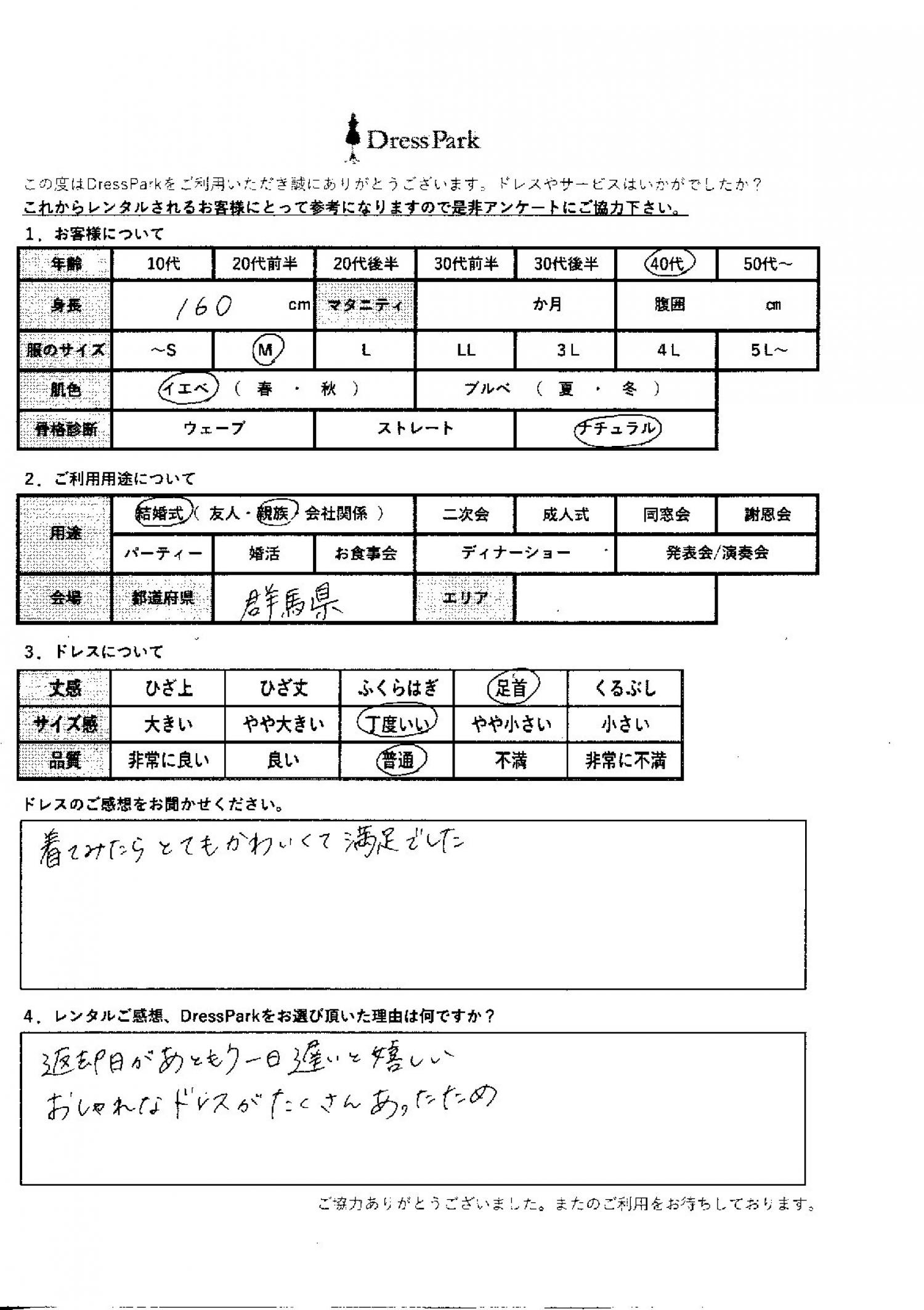 群馬県 C.M様160㎝ Mサイズ #40代#M/L#160~164㎝#結婚式(親族)#群馬県 ◆レンタルしたドレスはこちら ◆レンタルしたサイズは:M ◆レンタルした日付:2025/10/26 ドレスの着用感 ◆点数: (4点) ◆丈感:足首 ◆サイズ感:丁度いい ◆品質:普通 ◆肌色:イエベ ◆骨格診断:ナチュラル ドレスの感想 着てみたらとても可愛くて満足でした。 レンタルのご感想、DressParkをお選び頂いた理由 返却日があともう1日遅いと嬉しい。おしゃれなドレスがたくさんあったため。 CUSTOMER REVIEWS お客様の声 気になるカテゴリー別にご利用の感想をチェック! ◆AGE 年代で見る 10代 20代 30代 40代 50代~ ◆SIZE サイズで見る SS/S M/L 大きいサイズLL~ ◆HIGHT 身長で見る 140~149㎝ 150~154㎝ 155~159㎝ 160~164㎝ 165~169㎝ 170㎝以上 ◆マタニティ ~3か月 4~6か月 7~8か月 9~10か月 ◆肌色 イエベ ブルべ ◆骨格診断 ウェーブ ストレート ナチュラル ◆利用シーン 結婚式(友人) 結婚式(親族) 結婚式(会社関係) 二次会 成人式 謝恩会 パーティー その他 CUSTOMER REVIEWS都道府県別お客様の声 都道府県別にのお客様の声をチェック! 北海道 青森県 岩手県 宮城県 秋田県 山形県 福島県 茨城県 栃木県 群馬県 埼玉県 千葉県 東京都 神奈川県 新潟県 富山県 石川県 福井県 山梨県 長野県 岐阜県 静岡県 愛知県 三重県 滋賀県 京都府 大阪府 兵庫県 奈良県 和歌山県 鳥取県 島根県 岡山県 広島県 山口県 徳島県 香川県 愛媛県 高知県 福岡県 佐賀県 長崎県 熊本県 大分県 宮崎県 鹿児島県 沖縄県 CUSTOMER REVIEWSエリア別お客様の声 都道府県別にのお客様の声をチェック! 札幌 仙台 名古屋 軽井沢 金沢 神戸・芦屋 博多 那覇 梅田・新大阪 難波・心斎橋 鎌倉・湘南 横浜・みなとみらい 舞浜・浦安・幕張 大宮・浦和 青山・表参道 六本木・麻布 渋谷・恵比寿 新宿 池袋 銀座・丸の内 お台場・汐留 鹿児島市 郡山市 福島市 東予 甲府・石和 LINEでお問い合わせ このサイトではJavaScriptを使用しています