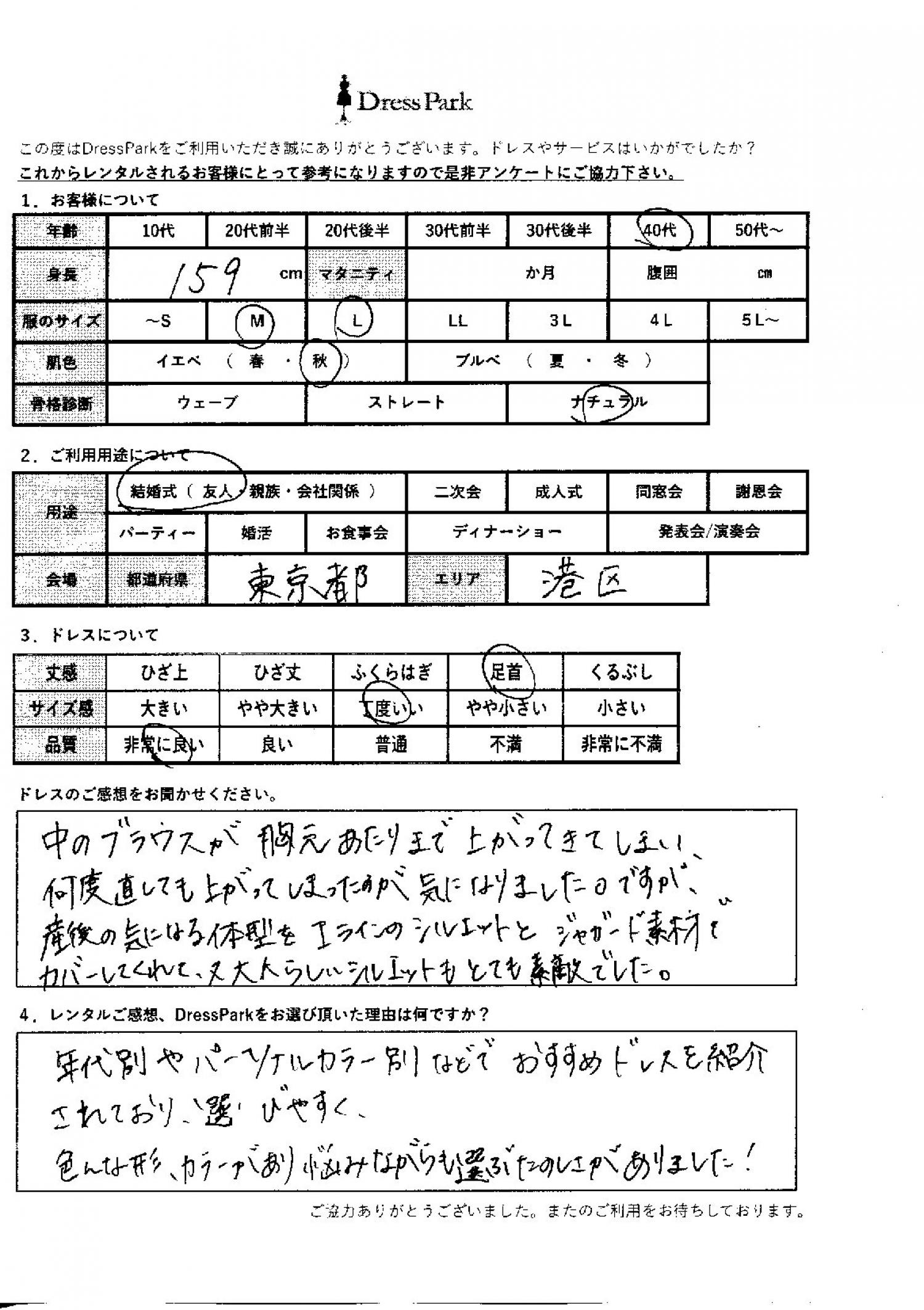 東京都 S.Y様159㎝ Lサイズ六本木・麻布 #40代#M/L#155~159㎝#結婚式(友人)#東京都#六本木・麻布 ◆レンタルしたドレスはこちら ◆レンタルしたサイズは:L ◆レンタルした日付:2025/10/26 ドレスの着用感 ◆点数: (5点) ◆丈感:足首 ◆サイズ感:丁度いい ◆品質:非常に良い ◆肌色:イエベ ◆骨格診断:ナチュラル ドレスの感想 中のブラウスが胸元あたりまで上がってきてしまい、何度直しても上がってきてしまったのが気になりました。ですが、産後の気になる体型をアイラインのシルエットとジャガード素材でカバーしてくれて、まだ大人らしいシルエットもとても素敵でした。 レンタルのご感想、DressParkをお選び頂いた理由 年代別やパーソナルカラー別などで、オススメドレスを紹介されており、選びやすく、いろんな形、カラーがあり、悩みながらも選ぶ楽しさがありました! CUSTOMER REVIEWS お客様の声 気になるカテゴリー別にご利用の感想をチェック! ◆AGE 年代で見る 10代 20代 30代 40代 50代~ ◆SIZE サイズで見る SS/S M/L 大きいサイズLL~ ◆HIGHT 身長で見る 140~149㎝ 150~154㎝ 155~159㎝ 160~164㎝ 165~169㎝ 170㎝以上 ◆マタニティ ~3か月 4~6か月 7~8か月 9~10か月 ◆肌色 イエベ ブルべ ◆骨格診断 ウェーブ ストレート ナチュラル ◆利用シーン 結婚式(友人) 結婚式(親族) 結婚式(会社関係) 二次会 成人式 謝恩会 パーティー その他 CUSTOMER REVIEWS都道府県別お客様の声 都道府県別にのお客様の声をチェック! 北海道 青森県 岩手県 宮城県 秋田県 山形県 福島県 茨城県 栃木県 群馬県 埼玉県 千葉県 東京都 神奈川県 新潟県 富山県 石川県 福井県 山梨県 長野県 岐阜県 静岡県 愛知県 三重県 滋賀県 京都府 大阪府 兵庫県 奈良県 和歌山県 鳥取県 島根県 岡山県 広島県 山口県 徳島県 香川県 愛媛県 高知県 福岡県 佐賀県 長崎県 熊本県 大分県 宮崎県 鹿児島県 沖縄県 CUSTOMER REVIEWSエリア別お客様の声 都道府県別にのお客様の声をチェック! 札幌 仙台 名古屋 軽井沢 金沢 神戸・芦屋 博多 那覇 梅田・新大阪 難波・心斎橋 鎌倉・湘南 横浜・みなとみらい 舞浜・浦安・幕張 大宮・浦和 青山・表参道 六本木・麻布 渋谷・恵比寿 新宿 池袋 銀座・丸の内 お台場・汐留 鹿児島市 郡山市 福島市 東予 甲府・石和 LINEでお問い合わせ このサイトではJavaScriptを使用しています