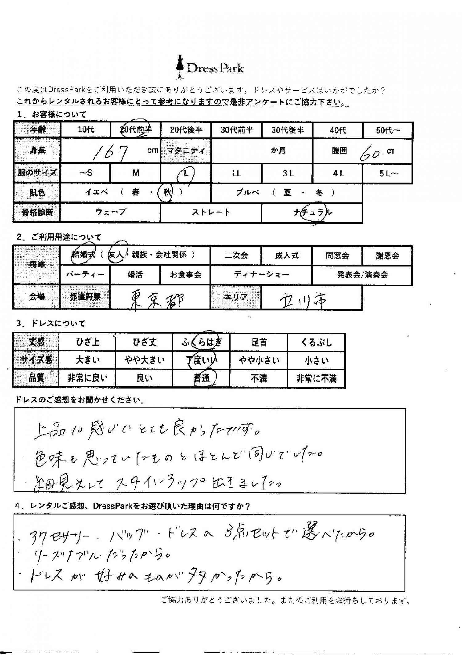 東京都 M.Y様167㎝ Lサイズ #20代#M/L#165~169㎝#結婚式(友人)#東京都 ◆レンタルしたドレスはこちら ◆レンタルしたサイズは:L ◆レンタルした日付:2025/10/26 ドレスの着用感 ◆点数: (4点) ◆丈感:ふくらはぎ ◆サイズ感:丁度いい ◆品質:普通 ◆肌色:イエベ ◆骨格診断:ナチュラル ドレスの感想 上品な感じでとても良かったです。色味も思っていたものとほとんど同じでした。細見えしてスタイルアップできました。 レンタルのご感想、DressParkをお選び頂いた理由 アクセサリー、バッグ、ドレスの3点セットで選べたから。リーズナブルだったから。ドレスが好みのものが多かったから。 CUSTOMER REVIEWS お客様の声 気になるカテゴリー別にご利用の感想をチェック! ◆AGE 年代で見る 10代 20代 30代 40代 50代~ ◆SIZE サイズで見る SS/S M/L 大きいサイズLL~ ◆HIGHT 身長で見る 140~149㎝ 150~154㎝ 155~159㎝ 160~164㎝ 165~169㎝ 170㎝以上 ◆マタニティ ~3か月 4~6か月 7~8か月 9~10か月 ◆肌色 イエベ ブルべ ◆骨格診断 ウェーブ ストレート ナチュラル ◆利用シーン 結婚式(友人) 結婚式(親族) 結婚式(会社関係) 二次会 成人式 謝恩会 パーティー その他 CUSTOMER REVIEWS都道府県別お客様の声 都道府県別にのお客様の声をチェック! 北海道 青森県 岩手県 宮城県 秋田県 山形県 福島県 茨城県 栃木県 群馬県 埼玉県 千葉県 東京都 神奈川県 新潟県 富山県 石川県 福井県 山梨県 長野県 岐阜県 静岡県 愛知県 三重県 滋賀県 京都府 大阪府 兵庫県 奈良県 和歌山県 鳥取県 島根県 岡山県 広島県 山口県 徳島県 香川県 愛媛県 高知県 福岡県 佐賀県 長崎県 熊本県 大分県 宮崎県 鹿児島県 沖縄県 CUSTOMER REVIEWSエリア別お客様の声 都道府県別にのお客様の声をチェック! 札幌 仙台 名古屋 軽井沢 金沢 神戸・芦屋 博多 那覇 梅田・新大阪 難波・心斎橋 鎌倉・湘南 横浜・みなとみらい 舞浜・浦安・幕張 大宮・浦和 青山・表参道 六本木・麻布 渋谷・恵比寿 新宿 池袋 銀座・丸の内 お台場・汐留 鹿児島市 郡山市 福島市 東予 甲府・石和 LINEでお問い合わせ このサイトではJavaScriptを使用しています