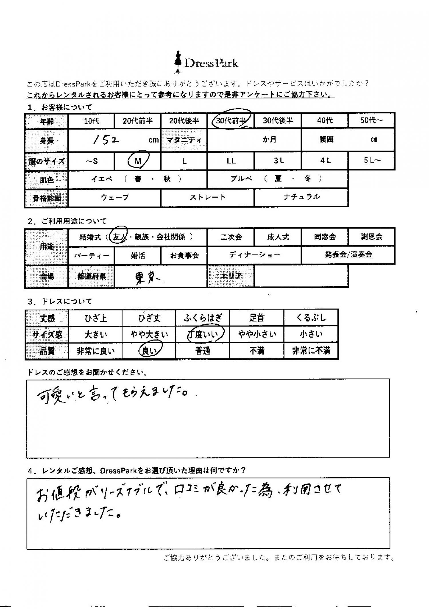 東京都 N.A様152㎝ Mサイズ #30代#M/L#150~154㎝#結婚式(友人)#東京都 ◆レンタルしたドレスはこちら ◆レンタルしたサイズは:M ◆レンタルした日付:2025/10/26 ドレスの着用感 ◆点数: (4点) ◆丈感:くるぶし ◆サイズ感:丁度いい ◆品質:良い ドレスの感想 かわいいと言ってもらえました。 レンタルのご感想、DressParkをお選び頂いた理由 お値段がリーズナブルで、口コミが良かったため、利用させていただきました。 CUSTOMER REVIEWS お客様の声 気になるカテゴリー別にご利用の感想をチェック! ◆AGE 年代で見る 10代 20代 30代 40代 50代~ ◆SIZE サイズで見る SS/S M/L 大きいサイズLL~ ◆HIGHT 身長で見る 140~149㎝ 150~154㎝ 155~159㎝ 160~164㎝ 165~169㎝ 170㎝以上 ◆マタニティ ~3か月 4~6か月 7~8か月 9~10か月 ◆肌色 イエベ ブルべ ◆骨格診断 ウェーブ ストレート ナチュラル ◆利用シーン 結婚式(友人) 結婚式(親族) 結婚式(会社関係) 二次会 成人式 謝恩会 パーティー その他 CUSTOMER REVIEWS都道府県別お客様の声 都道府県別にのお客様の声をチェック! 北海道 青森県 岩手県 宮城県 秋田県 山形県 福島県 茨城県 栃木県 群馬県 埼玉県 千葉県 東京都 神奈川県 新潟県 富山県 石川県 福井県 山梨県 長野県 岐阜県 静岡県 愛知県 三重県 滋賀県 京都府 大阪府 兵庫県 奈良県 和歌山県 鳥取県 島根県 岡山県 広島県 山口県 徳島県 香川県 愛媛県 高知県 福岡県 佐賀県 長崎県 熊本県 大分県 宮崎県 鹿児島県 沖縄県 CUSTOMER REVIEWSエリア別お客様の声 都道府県別にのお客様の声をチェック! 札幌 仙台 名古屋 軽井沢 金沢 神戸・芦屋 博多 那覇 梅田・新大阪 難波・心斎橋 鎌倉・湘南 横浜・みなとみらい 舞浜・浦安・幕張 大宮・浦和 青山・表参道 六本木・麻布 渋谷・恵比寿 新宿 池袋 銀座・丸の内 お台場・汐留 鹿児島市 郡山市 福島市 東予 甲府・石和 LINEでお問い合わせ このサイトではJavaScriptを使用しています