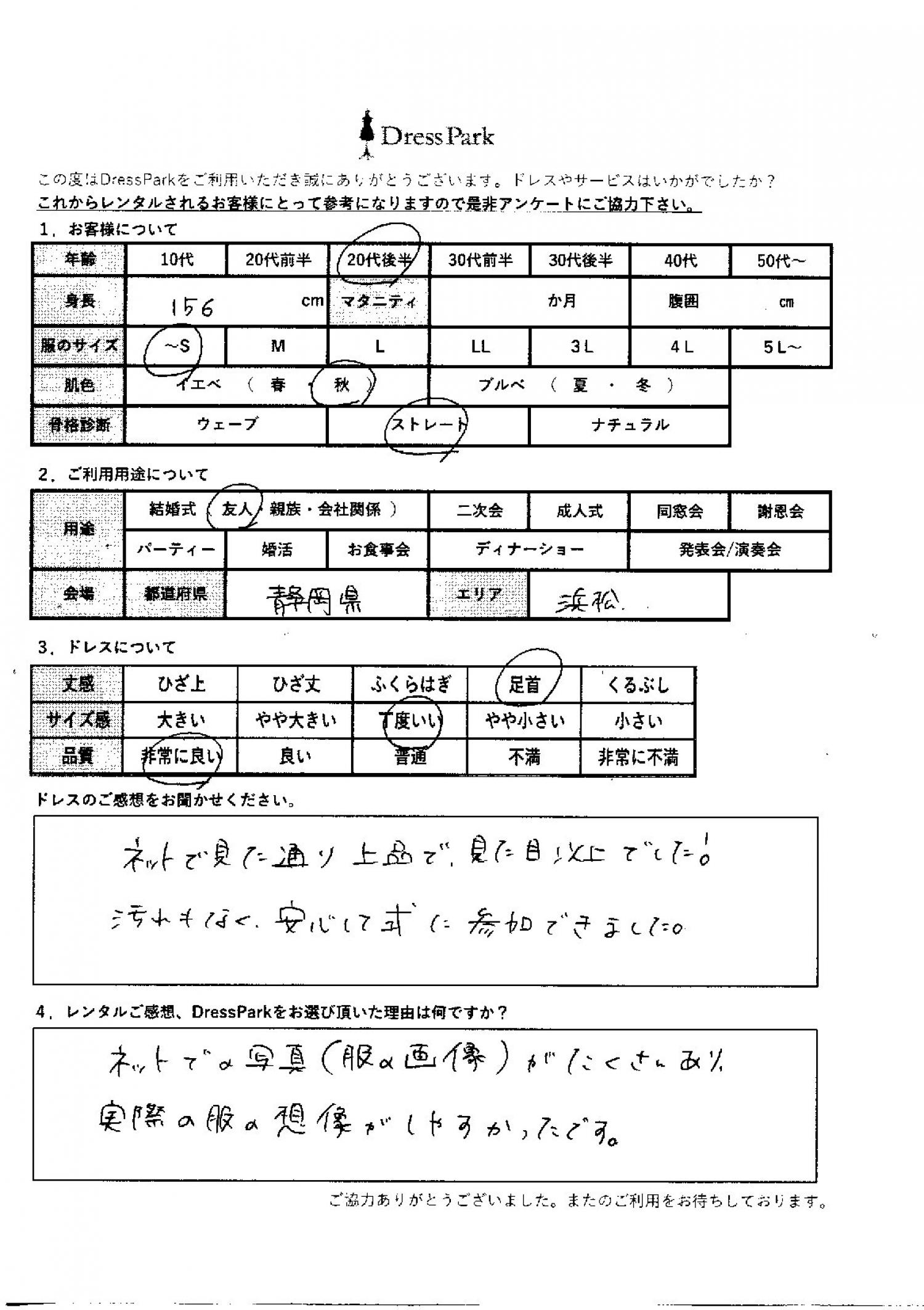 静岡県 M.A様156㎝ ~Sサイズ #20代#SS/S#155~159㎝#結婚式(友人)#静岡県 ◆レンタルしたドレスはこちら ◆レンタルしたサイズは:M ◆レンタルした日付:2025/10/26 ドレスの着用感 ◆点数: (5点) ◆丈感:足首 ◆サイズ感:丁度いい ◆品質:非常に良い ◆肌色:イエベ ◆骨格診断:ストレート ドレスの感想 ネットで見た通り、上品で見た目以上でした!汚れもなく安心して色に参加できました。 レンタルのご感想、DressParkをお選び頂いた理由 ネットでの写真(服の画像)がたくさんあり、実際の服の想像がしやすかったです。 CUSTOMER REVIEWS お客様の声 気になるカテゴリー別にご利用の感想をチェック! ◆AGE 年代で見る 10代 20代 30代 40代 50代~ ◆SIZE サイズで見る SS/S M/L 大きいサイズLL~ ◆HIGHT 身長で見る 140~149㎝ 150~154㎝ 155~159㎝ 160~164㎝ 165~169㎝ 170㎝以上 ◆マタニティ ~3か月 4~6か月 7~8か月 9~10か月 ◆肌色 イエベ ブルべ ◆骨格診断 ウェーブ ストレート ナチュラル ◆利用シーン 結婚式(友人) 結婚式(親族) 結婚式(会社関係) 二次会 成人式 謝恩会 パーティー その他 CUSTOMER REVIEWS都道府県別お客様の声 都道府県別にのお客様の声をチェック! 北海道 青森県 岩手県 宮城県 秋田県 山形県 福島県 茨城県 栃木県 群馬県 埼玉県 千葉県 東京都 神奈川県 新潟県 富山県 石川県 福井県 山梨県 長野県 岐阜県 静岡県 愛知県 三重県 滋賀県 京都府 大阪府 兵庫県 奈良県 和歌山県 鳥取県 島根県 岡山県 広島県 山口県 徳島県 香川県 愛媛県 高知県 福岡県 佐賀県 長崎県 熊本県 大分県 宮崎県 鹿児島県 沖縄県 CUSTOMER REVIEWSエリア別お客様の声 都道府県別にのお客様の声をチェック! 札幌 仙台 名古屋 軽井沢 金沢 神戸・芦屋 博多 那覇 梅田・新大阪 難波・心斎橋 鎌倉・湘南 横浜・みなとみらい 舞浜・浦安・幕張 大宮・浦和 青山・表参道 六本木・麻布 渋谷・恵比寿 新宿 池袋 銀座・丸の内 お台場・汐留 鹿児島市 郡山市 福島市 東予 甲府・石和 LINEでお問い合わせ このサイトではJavaScriptを使用しています