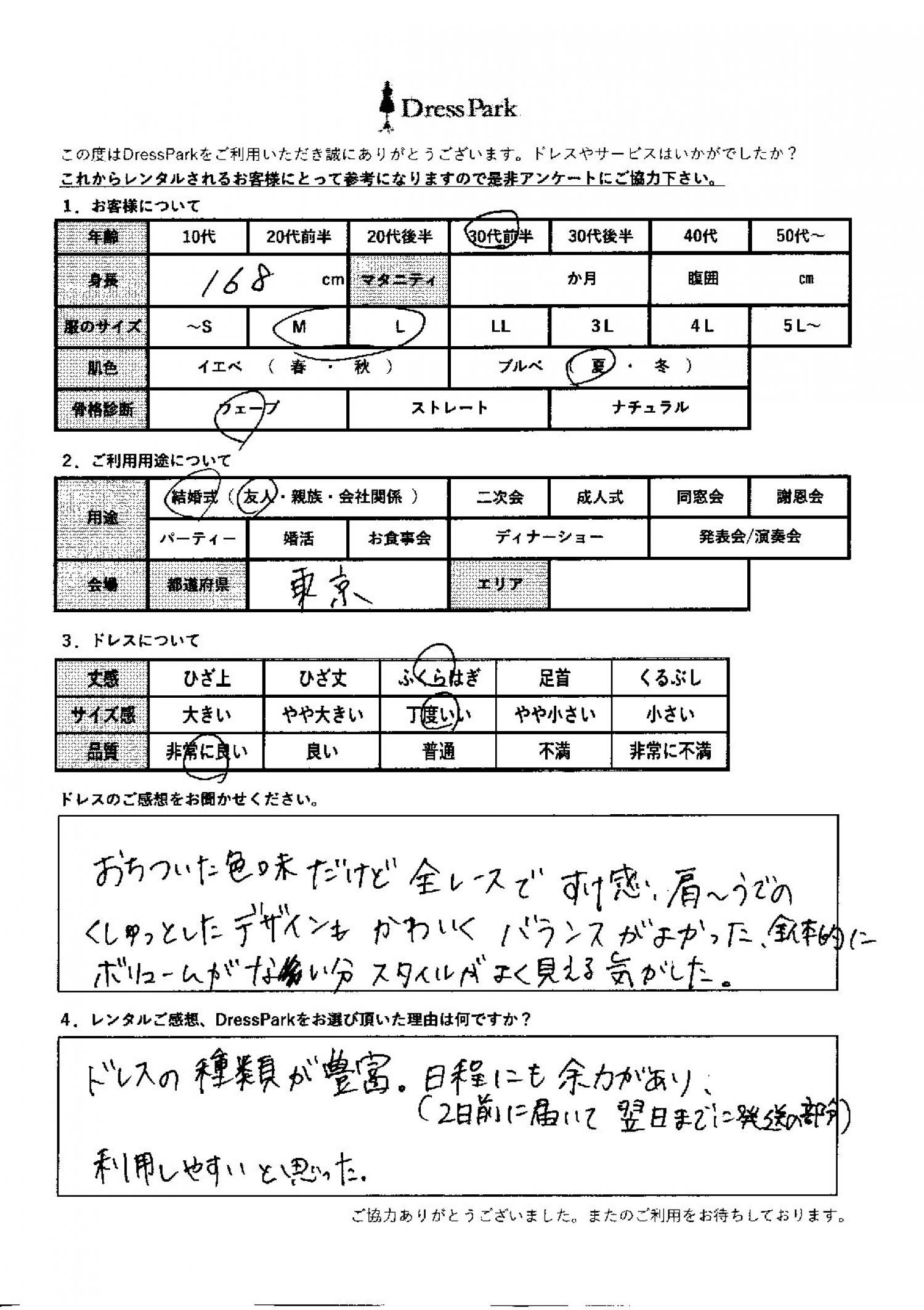 東京都 S.T様168㎝ Mサイズ #30代#M/L#165~169㎝#結婚式(友人)#東京都 ◆レンタルしたドレスはこちら ◆レンタルしたサイズは:M ◆レンタルした日付:2025/10/26 ドレスの着用感 ◆点数: (5点) ◆丈感:ふくらはぎ ◆サイズ感:丁度いい ◆品質:非常に良い ◆肌色:ブルべ ◆骨格診断:ウェーブ ドレスの感想 落ち着いた色味だけど、全レースで透け感、肩から腕のくしゅっとしたデザインも可愛く、バランスが良かった。全体的にボリュームがない分スタイルがよく見える気がした。 レンタルのご感想、DressParkをお選び頂いた理由 ドレスの種類が豊富。日程にも余裕があり、利用しやすいと思った。 CUSTOMER REVIEWS お客様の声 気になるカテゴリー別にご利用の感想をチェック! ◆AGE 年代で見る 10代 20代 30代 40代 50代~ ◆SIZE サイズで見る SS/S M/L 大きいサイズLL~ ◆HIGHT 身長で見る 140~149㎝ 150~154㎝ 155~159㎝ 160~164㎝ 165~169㎝ 170㎝以上 ◆マタニティ ~3か月 4~6か月 7~8か月 9~10か月 ◆肌色 イエベ ブルべ ◆骨格診断 ウェーブ ストレート ナチュラル ◆利用シーン 結婚式(友人) 結婚式(親族) 結婚式(会社関係) 二次会 成人式 謝恩会 パーティー その他 CUSTOMER REVIEWS都道府県別お客様の声 都道府県別にのお客様の声をチェック! 北海道 青森県 岩手県 宮城県 秋田県 山形県 福島県 茨城県 栃木県 群馬県 埼玉県 千葉県 東京都 神奈川県 新潟県 富山県 石川県 福井県 山梨県 長野県 岐阜県 静岡県 愛知県 三重県 滋賀県 京都府 大阪府 兵庫県 奈良県 和歌山県 鳥取県 島根県 岡山県 広島県 山口県 徳島県 香川県 愛媛県 高知県 福岡県 佐賀県 長崎県 熊本県 大分県 宮崎県 鹿児島県 沖縄県 CUSTOMER REVIEWSエリア別お客様の声 都道府県別にのお客様の声をチェック! 札幌 仙台 名古屋 軽井沢 金沢 神戸・芦屋 博多 那覇 梅田・新大阪 難波・心斎橋 鎌倉・湘南 横浜・みなとみらい 舞浜・浦安・幕張 大宮・浦和 青山・表参道 六本木・麻布 渋谷・恵比寿 新宿 池袋 銀座・丸の内 お台場・汐留 鹿児島市 郡山市 福島市 東予 甲府・石和 LINEでお問い合わせ このサイトではJavaScriptを使用しています
