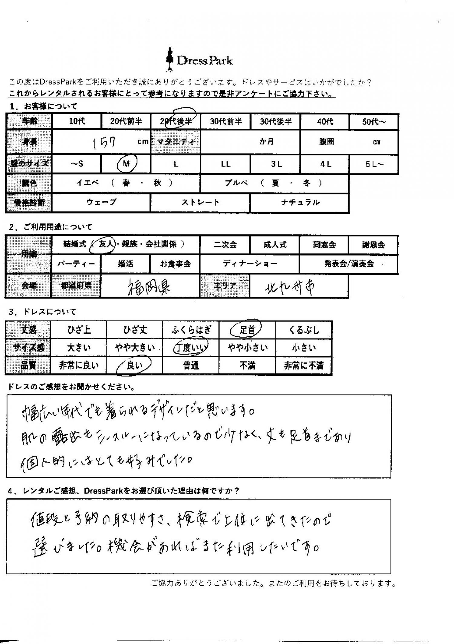 福岡県 H.T様157㎝ Mサイズ #20代#M/L#155~159㎝#結婚式(友人)#福岡県 ◆レンタルしたドレスはこちら ◆レンタルしたサイズは:M ◆レンタルした日付:2025/10/25 ドレスの着用感 ◆点数: (4点) ◆丈感:足首 ◆サイズ感:丁度いい ◆品質:良い ドレスの感想 幅広い年代でも着られるデザインだと思います。肌の露出もシースルーになっているので少なく、丈も足首まであり、個人的にはとても好みでした。 レンタルのご感想、DressParkをお選び頂いた理由 値段と予約の取りやすさ、検索で上位に出てきたので選びました。機会があればまた利用したいです。 CUSTOMER REVIEWS お客様の声 気になるカテゴリー別にご利用の感想をチェック! ◆AGE 年代で見る 10代 20代 30代 40代 50代~ ◆SIZE サイズで見る SS/S M/L 大きいサイズLL~ ◆HIGHT 身長で見る 140~149㎝ 150~154㎝ 155~159㎝ 160~164㎝ 165~169㎝ 170㎝以上 ◆マタニティ ~3か月 4~6か月 7~8か月 9~10か月 ◆肌色 イエベ ブルべ ◆骨格診断 ウェーブ ストレート ナチュラル ◆利用シーン 結婚式(友人) 結婚式(親族) 結婚式(会社関係) 二次会 成人式 謝恩会 パーティー その他 CUSTOMER REVIEWS都道府県別お客様の声 都道府県別にのお客様の声をチェック! 北海道 青森県 岩手県 宮城県 秋田県 山形県 福島県 茨城県 栃木県 群馬県 埼玉県 千葉県 東京都 神奈川県 新潟県 富山県 石川県 福井県 山梨県 長野県 岐阜県 静岡県 愛知県 三重県 滋賀県 京都府 大阪府 兵庫県 奈良県 和歌山県 鳥取県 島根県 岡山県 広島県 山口県 徳島県 香川県 愛媛県 高知県 福岡県 佐賀県 長崎県 熊本県 大分県 宮崎県 鹿児島県 沖縄県 CUSTOMER REVIEWSエリア別お客様の声 都道府県別にのお客様の声をチェック! 札幌 仙台 名古屋 軽井沢 金沢 神戸・芦屋 博多 那覇 梅田・新大阪 難波・心斎橋 鎌倉・湘南 横浜・みなとみらい 舞浜・浦安・幕張 大宮・浦和 青山・表参道 六本木・麻布 渋谷・恵比寿 新宿 池袋 銀座・丸の内 お台場・汐留 鹿児島市 郡山市 福島市 東予 甲府・石和 LINEでお問い合わせ このサイトではJavaScriptを使用しています