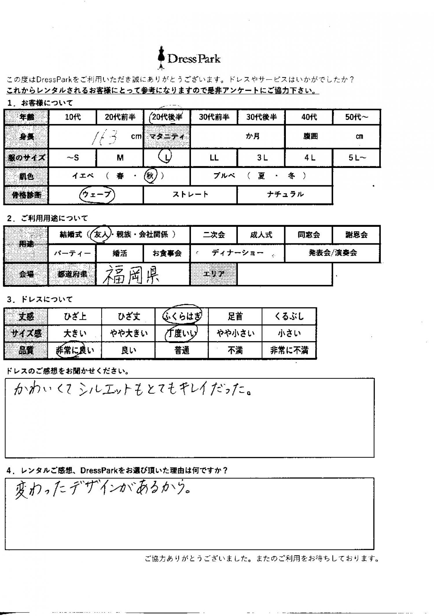 福岡県 N.O様163㎝ Lサイズ #20代#M/L#160~164㎝#結婚式(友人)#福岡県 ◆レンタルしたドレスはこちら ◆レンタルしたサイズは:L ◆レンタルした日付:2025/10/25 ドレスの着用感 ◆点数: (5点) ◆丈感:ふくらはぎ ◆サイズ感:丁度いい ◆品質:非常に良い ◆肌色:イエベ ◆骨格診断:ウェーブ ドレスの感想 可愛くてシルエットもとても綺麗だった。 レンタルのご感想、DressParkをお選び頂いた理由 変わったデザインがあるから。 CUSTOMER REVIEWS お客様の声 気になるカテゴリー別にご利用の感想をチェック! ◆AGE 年代で見る 10代 20代 30代 40代 50代~ ◆SIZE サイズで見る SS/S M/L 大きいサイズLL~ ◆HIGHT 身長で見る 140~149㎝ 150~154㎝ 155~159㎝ 160~164㎝ 165~169㎝ 170㎝以上 ◆マタニティ ~3か月 4~6か月 7~8か月 9~10か月 ◆肌色 イエベ ブルべ ◆骨格診断 ウェーブ ストレート ナチュラル ◆利用シーン 結婚式(友人) 結婚式(親族) 結婚式(会社関係) 二次会 成人式 謝恩会 パーティー その他 CUSTOMER REVIEWS都道府県別お客様の声 都道府県別にのお客様の声をチェック! 北海道 青森県 岩手県 宮城県 秋田県 山形県 福島県 茨城県 栃木県 群馬県 埼玉県 千葉県 東京都 神奈川県 新潟県 富山県 石川県 福井県 山梨県 長野県 岐阜県 静岡県 愛知県 三重県 滋賀県 京都府 大阪府 兵庫県 奈良県 和歌山県 鳥取県 島根県 岡山県 広島県 山口県 徳島県 香川県 愛媛県 高知県 福岡県 佐賀県 長崎県 熊本県 大分県 宮崎県 鹿児島県 沖縄県 CUSTOMER REVIEWSエリア別お客様の声 都道府県別にのお客様の声をチェック! 札幌 仙台 名古屋 軽井沢 金沢 神戸・芦屋 博多 那覇 梅田・新大阪 難波・心斎橋 鎌倉・湘南 横浜・みなとみらい 舞浜・浦安・幕張 大宮・浦和 青山・表参道 六本木・麻布 渋谷・恵比寿 新宿 池袋 銀座・丸の内 お台場・汐留 鹿児島市 郡山市 福島市 東予 甲府・石和 LINEでお問い合わせ このサイトではJavaScriptを使用しています