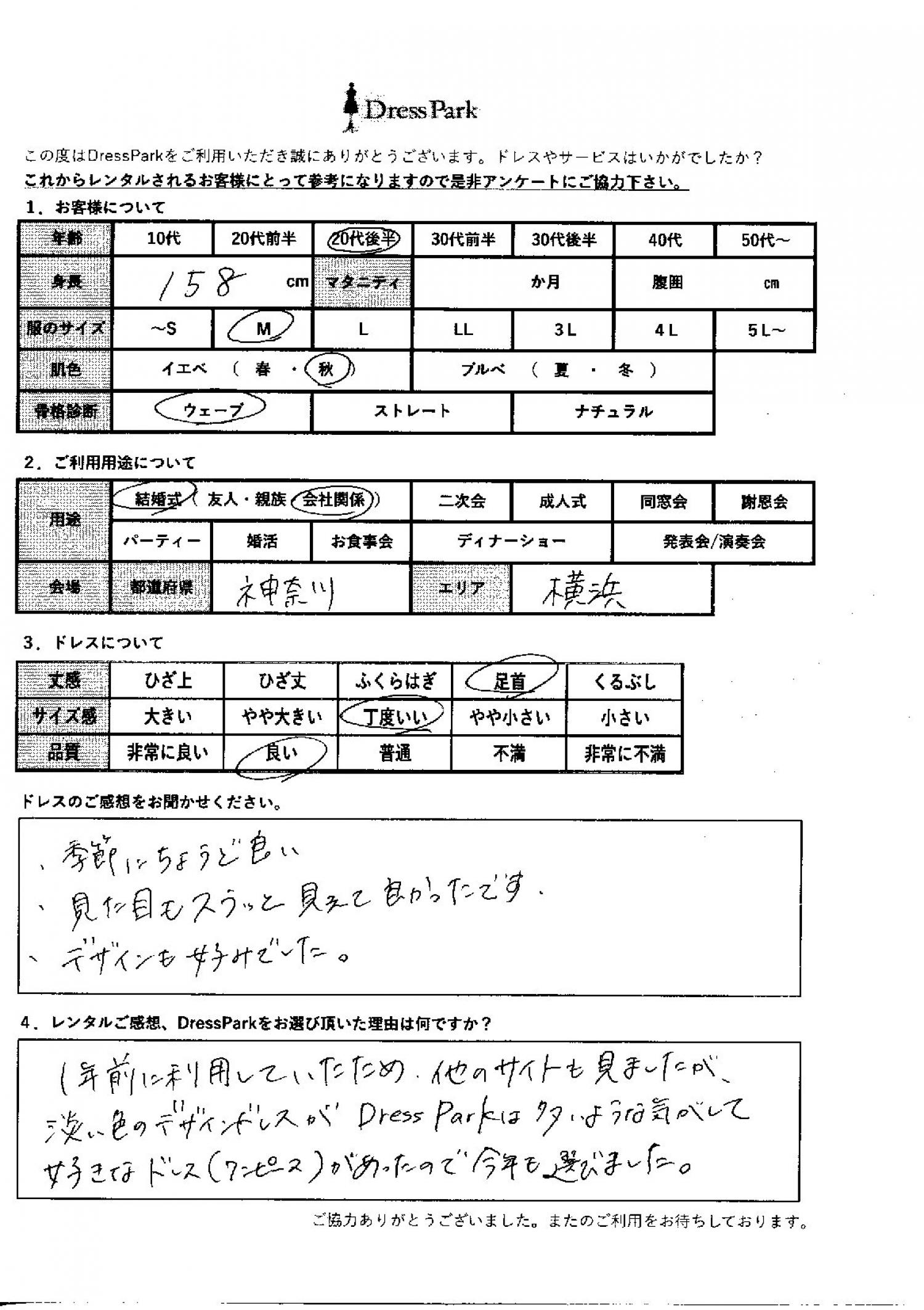 神奈川県 M.T様158㎝ Mサイズ横浜・みなとみらい #20代#M/L#155~159㎝#結婚式(会社関係)#神奈川県#横浜・みなとみらい ◆レンタルしたドレスはこちら ◆レンタルしたサイズは:M ◆レンタルした日付:2025/11/01 ドレスの着用感 ◆点数: (4点) ◆丈感:足首 ◆サイズ感:丁度いい ◆品質:良い ◆肌色:イエベ ◆骨格診断:ウェーブ ドレスの感想 季節にちょうど良い。見た目もスラッと見えて良かったです。デザインも好みでした。 レンタルのご感想、DressParkをお選び頂いた理由 1年前に利用していたため、他のサイトも見ましたが、淡い色のデザインドレスがドレスパークは多いような気がして、好きなドレスがあったので、今年も選びました。 CUSTOMER REVIEWS お客様の声 気になるカテゴリー別にご利用の感想をチェック! ◆AGE 年代で見る 10代 20代 30代 40代 50代~ ◆SIZE サイズで見る SS/S M/L 大きいサイズLL~ ◆HIGHT 身長で見る 140~149㎝ 150~154㎝ 155~159㎝ 160~164㎝ 165~169㎝ 170㎝以上 ◆マタニティ ~3か月 4~6か月 7~8か月 9~10か月 ◆肌色 イエベ ブルべ ◆骨格診断 ウェーブ ストレート ナチュラル ◆利用シーン 結婚式(友人) 結婚式(親族) 結婚式(会社関係) 二次会 成人式 謝恩会 パーティー その他 CUSTOMER REVIEWS都道府県別お客様の声 都道府県別にのお客様の声をチェック! 北海道 青森県 岩手県 宮城県 秋田県 山形県 福島県 茨城県 栃木県 群馬県 埼玉県 千葉県 東京都 神奈川県 新潟県 富山県 石川県 福井県 山梨県 長野県 岐阜県 静岡県 愛知県 三重県 滋賀県 京都府 大阪府 兵庫県 奈良県 和歌山県 鳥取県 島根県 岡山県 広島県 山口県 徳島県 香川県 愛媛県 高知県 福岡県 佐賀県 長崎県 熊本県 大分県 宮崎県 鹿児島県 沖縄県 CUSTOMER REVIEWSエリア別お客様の声 都道府県別にのお客様の声をチェック! 札幌 仙台 名古屋 軽井沢 金沢 神戸・芦屋 博多 那覇 梅田・新大阪 難波・心斎橋 鎌倉・湘南 横浜・みなとみらい 舞浜・浦安・幕張 大宮・浦和 青山・表参道 六本木・麻布 渋谷・恵比寿 新宿 池袋 銀座・丸の内 お台場・汐留 鹿児島市 郡山市 福島市 東予 甲府・石和 LINEでお問い合わせ このサイトではJavaScriptを使用しています