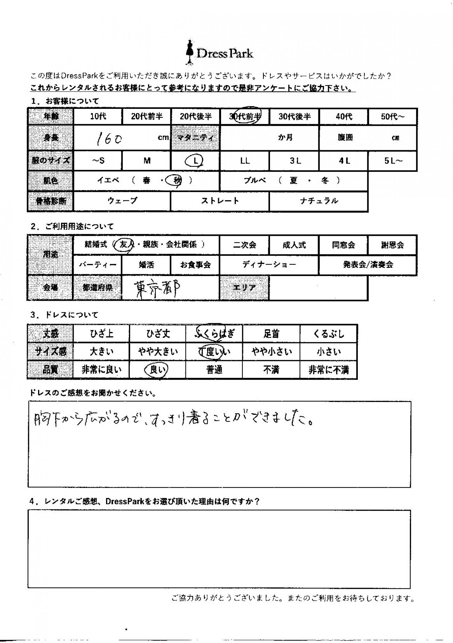 東京都 S.F様160㎝ Lサイズ #30代#M/L#160~164㎝#結婚式(友人)#東京都 ◆レンタルしたドレスはこちら ◆レンタルしたサイズは:L ◆レンタルした日付:2025/11/01 ドレスの着用感 ◆点数: (4点) ◆丈感:ふくらはぎ ◆サイズ感:丁度いい ◆品質:良い ◆肌色:イエベ ドレスの感想 胸下から広がるので、スッキリ着ることができました。 CUSTOMER REVIEWS お客様の声 気になるカテゴリー別にご利用の感想をチェック! ◆AGE 年代で見る 10代 20代 30代 40代 50代~ ◆SIZE サイズで見る SS/S M/L 大きいサイズLL~ ◆HIGHT 身長で見る 140~149㎝ 150~154㎝ 155~159㎝ 160~164㎝ 165~169㎝ 170㎝以上 ◆マタニティ ~3か月 4~6か月 7~8か月 9~10か月 ◆肌色 イエベ ブルべ ◆骨格診断 ウェーブ ストレート ナチュラル ◆利用シーン 結婚式(友人) 結婚式(親族) 結婚式(会社関係) 二次会 成人式 謝恩会 パーティー その他 CUSTOMER REVIEWS都道府県別お客様の声 都道府県別にのお客様の声をチェック! 北海道 青森県 岩手県 宮城県 秋田県 山形県 福島県 茨城県 栃木県 群馬県 埼玉県 千葉県 東京都 神奈川県 新潟県 富山県 石川県 福井県 山梨県 長野県 岐阜県 静岡県 愛知県 三重県 滋賀県 京都府 大阪府 兵庫県 奈良県 和歌山県 鳥取県 島根県 岡山県 広島県 山口県 徳島県 香川県 愛媛県 高知県 福岡県 佐賀県 長崎県 熊本県 大分県 宮崎県 鹿児島県 沖縄県 CUSTOMER REVIEWSエリア別お客様の声 都道府県別にのお客様の声をチェック! 札幌 仙台 名古屋 軽井沢 金沢 神戸・芦屋 博多 那覇 梅田・新大阪 難波・心斎橋 鎌倉・湘南 横浜・みなとみらい 舞浜・浦安・幕張 大宮・浦和 青山・表参道 六本木・麻布 渋谷・恵比寿 新宿 池袋 銀座・丸の内 お台場・汐留 鹿児島市 郡山市 福島市 東予 甲府・石和 LINEでお問い合わせ このサイトではJavaScriptを使用しています
