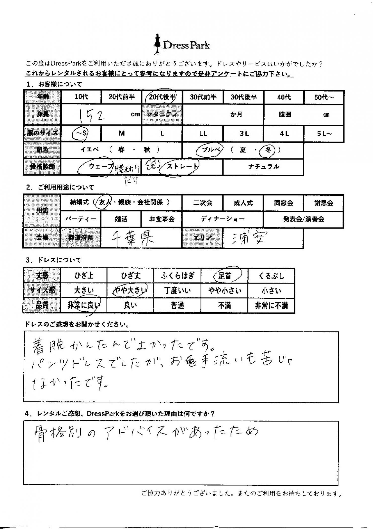 千葉県 A.O様152㎝ ~Sサイズ舞浜・浦安・幕張 #20代#SS/S#150~154㎝#結婚式(友人)#千葉県#舞浜・浦安・幕張 ◆レンタルしたドレスはこちら ◆レンタルしたサイズは:M ◆レンタルした日付:2025/11/01 ドレスの着用感 ◆点数: (5点) ◆丈感:足首 ◆サイズ感:やや大きい ◆品質:非常に良い ◆肌色:ブルべ ◆骨格診断:ストレート ドレスの感想 着脱簡単でよかったです。パンツドレスでしたが、お手洗いもじゃなかったです。 レンタルのご感想、DressParkをお選び頂いた理由 骨格別のアドバイスがあったため。 CUSTOMER REVIEWS お客様の声 気になるカテゴリー別にご利用の感想をチェック! ◆AGE 年代で見る 10代 20代 30代 40代 50代~ ◆SIZE サイズで見る SS/S M/L 大きいサイズLL~ ◆HIGHT 身長で見る 140~149㎝ 150~154㎝ 155~159㎝ 160~164㎝ 165~169㎝ 170㎝以上 ◆マタニティ ~3か月 4~6か月 7~8か月 9~10か月 ◆肌色 イエベ ブルべ ◆骨格診断 ウェーブ ストレート ナチュラル ◆利用シーン 結婚式(友人) 結婚式(親族) 結婚式(会社関係) 二次会 成人式 謝恩会 パーティー その他 CUSTOMER REVIEWS都道府県別お客様の声 都道府県別にのお客様の声をチェック! 北海道 青森県 岩手県 宮城県 秋田県 山形県 福島県 茨城県 栃木県 群馬県 埼玉県 千葉県 東京都 神奈川県 新潟県 富山県 石川県 福井県 山梨県 長野県 岐阜県 静岡県 愛知県 三重県 滋賀県 京都府 大阪府 兵庫県 奈良県 和歌山県 鳥取県 島根県 岡山県 広島県 山口県 徳島県 香川県 愛媛県 高知県 福岡県 佐賀県 長崎県 熊本県 大分県 宮崎県 鹿児島県 沖縄県 CUSTOMER REVIEWSエリア別お客様の声 都道府県別にのお客様の声をチェック! 札幌 仙台 名古屋 軽井沢 金沢 神戸・芦屋 博多 那覇 梅田・新大阪 難波・心斎橋 鎌倉・湘南 横浜・みなとみらい 舞浜・浦安・幕張 大宮・浦和 青山・表参道 六本木・麻布 渋谷・恵比寿 新宿 池袋 銀座・丸の内 お台場・汐留 鹿児島市 郡山市 福島市 東予 甲府・石和 LINEでお問い合わせ このサイトではJavaScriptを使用しています