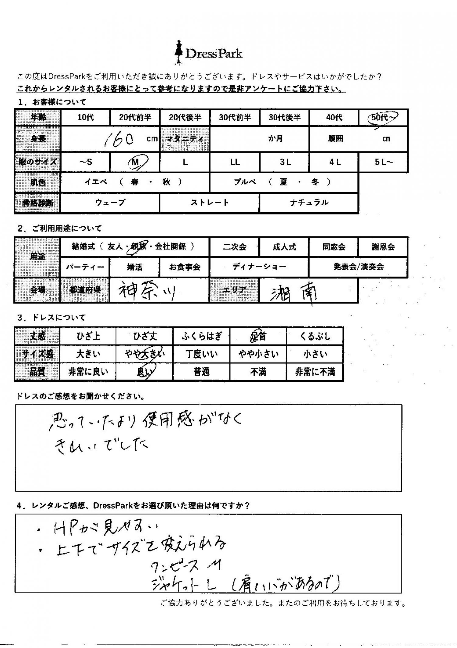 神奈川県 H.H様160㎝ Mサイズ鎌倉・湘南 #50代~#M/L#160~164㎝#結婚式(親族)#神奈川県#鎌倉・湘南 ◆レンタルしたドレスはこちら ◆レンタルしたサイズは:M ◆レンタルした日付:2025/11/01 ドレスの着用感 ◆点数: (4点) ◆丈感:足首 ◆サイズ感:やや大きい ◆品質:良い ドレスの感想 思っていたより使用感がなく綺麗でした。 レンタルのご感想、DressParkをお選び頂いた理由 ホームページが見やすい。上下でサイズを変えられる。ワンピースM、ジャケットL(肩幅があるので) CUSTOMER REVIEWS お客様の声 気になるカテゴリー別にご利用の感想をチェック! ◆AGE 年代で見る 10代 20代 30代 40代 50代~ ◆SIZE サイズで見る SS/S M/L 大きいサイズLL~ ◆HIGHT 身長で見る 140~149㎝ 150~154㎝ 155~159㎝ 160~164㎝ 165~169㎝ 170㎝以上 ◆マタニティ ~3か月 4~6か月 7~8か月 9~10か月 ◆肌色 イエベ ブルべ ◆骨格診断 ウェーブ ストレート ナチュラル ◆利用シーン 結婚式(友人) 結婚式(親族) 結婚式(会社関係) 二次会 成人式 謝恩会 パーティー その他 CUSTOMER REVIEWS都道府県別お客様の声 都道府県別にのお客様の声をチェック! 北海道 青森県 岩手県 宮城県 秋田県 山形県 福島県 茨城県 栃木県 群馬県 埼玉県 千葉県 東京都 神奈川県 新潟県 富山県 石川県 福井県 山梨県 長野県 岐阜県 静岡県 愛知県 三重県 滋賀県 京都府 大阪府 兵庫県 奈良県 和歌山県 鳥取県 島根県 岡山県 広島県 山口県 徳島県 香川県 愛媛県 高知県 福岡県 佐賀県 長崎県 熊本県 大分県 宮崎県 鹿児島県 沖縄県 CUSTOMER REVIEWSエリア別お客様の声 都道府県別にのお客様の声をチェック! 札幌 仙台 名古屋 軽井沢 金沢 神戸・芦屋 博多 那覇 梅田・新大阪 難波・心斎橋 鎌倉・湘南 横浜・みなとみらい 舞浜・浦安・幕張 大宮・浦和 青山・表参道 六本木・麻布 渋谷・恵比寿 新宿 池袋 銀座・丸の内 お台場・汐留 鹿児島市 郡山市 福島市 東予 甲府・石和 LINEでお問い合わせ このサイトではJavaScriptを使用しています