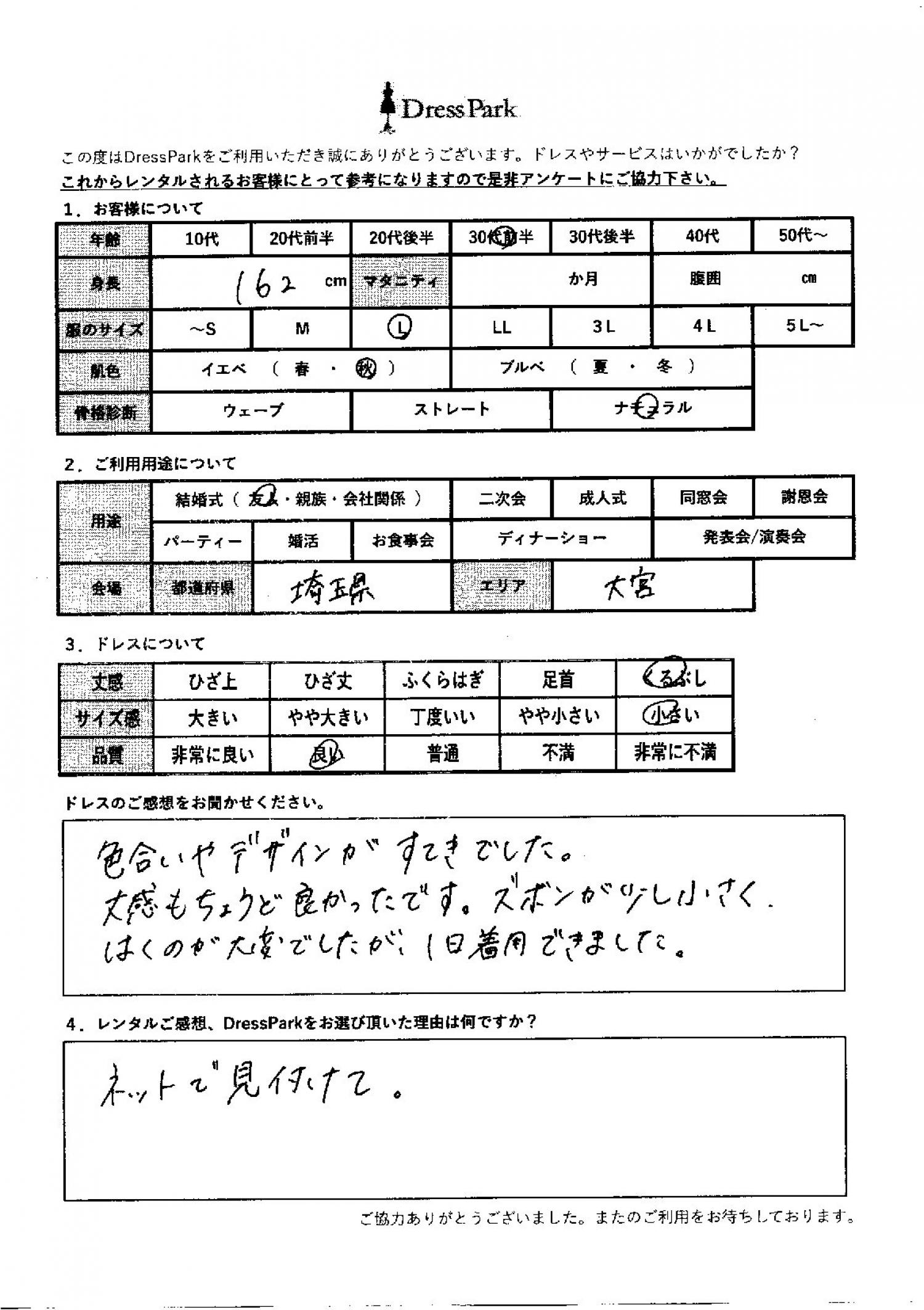 埼玉県 Y.K様162㎝ Lサイズ大宮・浦和 #30代#M/L#160~164㎝#結婚式(友人)#埼玉県#大宮・浦和 ◆レンタルしたドレスはこちら ◆レンタルしたサイズは:L ◆レンタルした日付:2025/11/01 ドレスの着用感 ◆点数: (4点) ◆丈感:くるぶし ◆サイズ感:小さい ◆品質:良い ◆肌色:イエベ ◆骨格診断:ナチュラル ドレスの感想 色合いやデザインが素敵でした。丈感もちょうど良かったです。ズボンが少し小さく、履くのが大変でしたが、1日着用できました。 レンタルのご感想、DressParkをお選び頂いた理由 ネットで見つけた。 CUSTOMER REVIEWS お客様の声 気になるカテゴリー別にご利用の感想をチェック! ◆AGE 年代で見る 10代 20代 30代 40代 50代~ ◆SIZE サイズで見る SS/S M/L 大きいサイズLL~ ◆HIGHT 身長で見る 140~149㎝ 150~154㎝ 155~159㎝ 160~164㎝ 165~169㎝ 170㎝以上 ◆マタニティ ~3か月 4~6か月 7~8か月 9~10か月 ◆肌色 イエベ ブルべ ◆骨格診断 ウェーブ ストレート ナチュラル ◆利用シーン 結婚式(友人) 結婚式(親族) 結婚式(会社関係) 二次会 成人式 謝恩会 パーティー その他 CUSTOMER REVIEWS都道府県別お客様の声 都道府県別にのお客様の声をチェック! 北海道 青森県 岩手県 宮城県 秋田県 山形県 福島県 茨城県 栃木県 群馬県 埼玉県 千葉県 東京都 神奈川県 新潟県 富山県 石川県 福井県 山梨県 長野県 岐阜県 静岡県 愛知県 三重県 滋賀県 京都府 大阪府 兵庫県 奈良県 和歌山県 鳥取県 島根県 岡山県 広島県 山口県 徳島県 香川県 愛媛県 高知県 福岡県 佐賀県 長崎県 熊本県 大分県 宮崎県 鹿児島県 沖縄県 CUSTOMER REVIEWSエリア別お客様の声 都道府県別にのお客様の声をチェック! 札幌 仙台 名古屋 軽井沢 金沢 神戸・芦屋 博多 那覇 梅田・新大阪 難波・心斎橋 鎌倉・湘南 横浜・みなとみらい 舞浜・浦安・幕張 大宮・浦和 青山・表参道 六本木・麻布 渋谷・恵比寿 新宿 池袋 銀座・丸の内 お台場・汐留 鹿児島市 郡山市 福島市 東予 甲府・石和 LINEでお問い合わせ このサイトではJavaScriptを使用しています