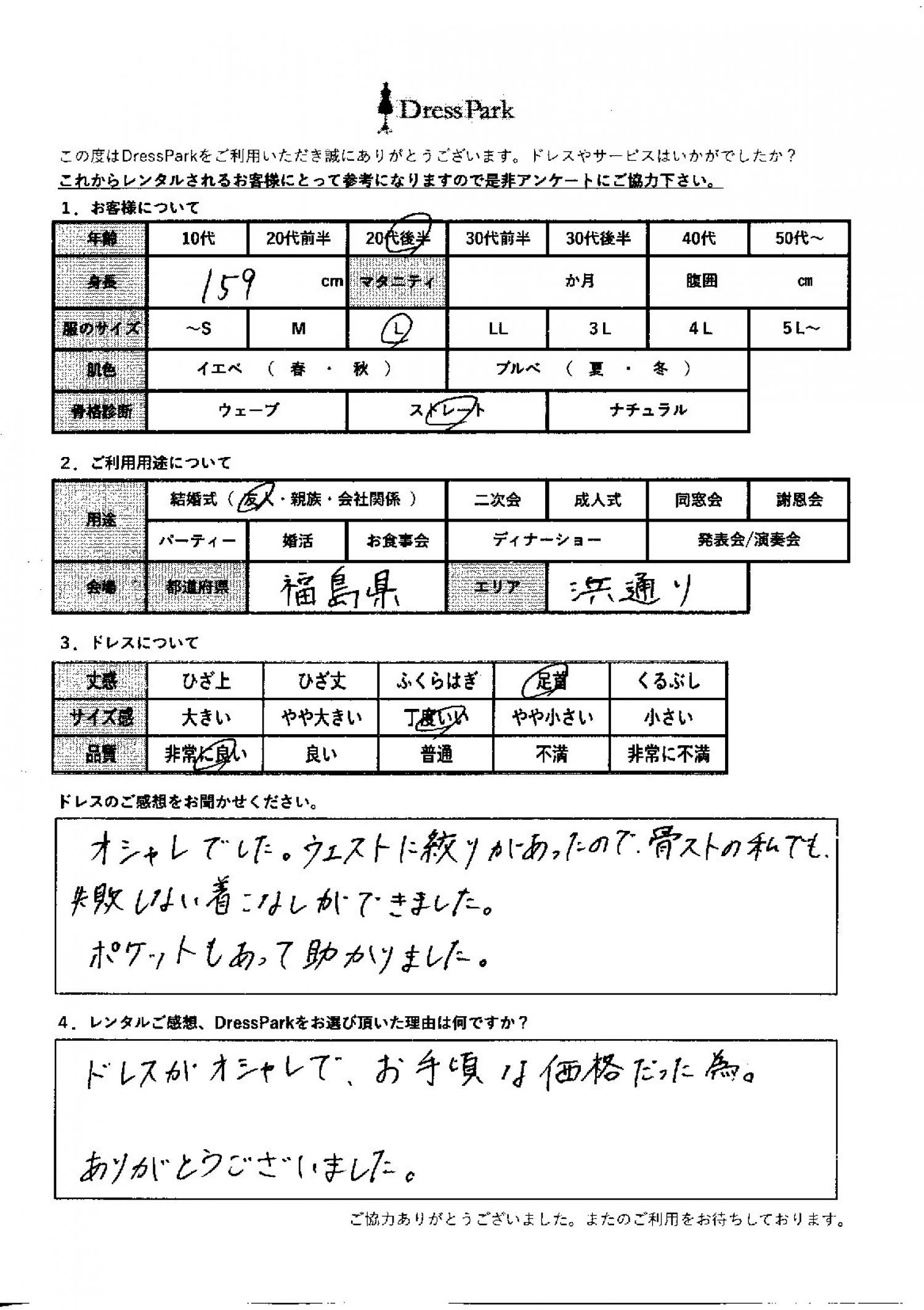 福島県 R.A様159㎝ Lサイズ #20代#M/L#155~159㎝#結婚式(友人)#福島県 ◆レンタルしたドレスはこちら ◆レンタルしたサイズは:M ◆レンタルした日付:2025/11/01 ドレスの着用感 ◆点数: (5点) ◆丈感:足首 ◆サイズ感:丁度いい ◆品質:非常に良い ◆骨格診断:ストレート ドレスの感想 おしゃれでした。ウエストに絞りがあったので、骨格ストレートの私でも失敗しない着こなしができました。ポケットもあって助かりました。 レンタルのご感想、DressParkをお選び頂いた理由 ドレスがおしゃれで、お手頃な価格だったため。ありがとうございました。 CUSTOMER REVIEWS お客様の声 気になるカテゴリー別にご利用の感想をチェック! ◆AGE 年代で見る 10代 20代 30代 40代 50代~ ◆SIZE サイズで見る SS/S M/L 大きいサイズLL~ ◆HIGHT 身長で見る 140~149㎝ 150~154㎝ 155~159㎝ 160~164㎝ 165~169㎝ 170㎝以上 ◆マタニティ ~3か月 4~6か月 7~8か月 9~10か月 ◆肌色 イエベ ブルべ ◆骨格診断 ウェーブ ストレート ナチュラル ◆利用シーン 結婚式(友人) 結婚式(親族) 結婚式(会社関係) 二次会 成人式 謝恩会 パーティー その他 CUSTOMER REVIEWS都道府県別お客様の声 都道府県別にのお客様の声をチェック! 北海道 青森県 岩手県 宮城県 秋田県 山形県 福島県 茨城県 栃木県 群馬県 埼玉県 千葉県 東京都 神奈川県 新潟県 富山県 石川県 福井県 山梨県 長野県 岐阜県 静岡県 愛知県 三重県 滋賀県 京都府 大阪府 兵庫県 奈良県 和歌山県 鳥取県 島根県 岡山県 広島県 山口県 徳島県 香川県 愛媛県 高知県 福岡県 佐賀県 長崎県 熊本県 大分県 宮崎県 鹿児島県 沖縄県 CUSTOMER REVIEWSエリア別お客様の声 都道府県別にのお客様の声をチェック! 札幌 仙台 名古屋 軽井沢 金沢 神戸・芦屋 博多 那覇 梅田・新大阪 難波・心斎橋 鎌倉・湘南 横浜・みなとみらい 舞浜・浦安・幕張 大宮・浦和 青山・表参道 六本木・麻布 渋谷・恵比寿 新宿 池袋 銀座・丸の内 お台場・汐留 鹿児島市 郡山市 福島市 東予 甲府・石和 LINEでお問い合わせ このサイトではJavaScriptを使用しています