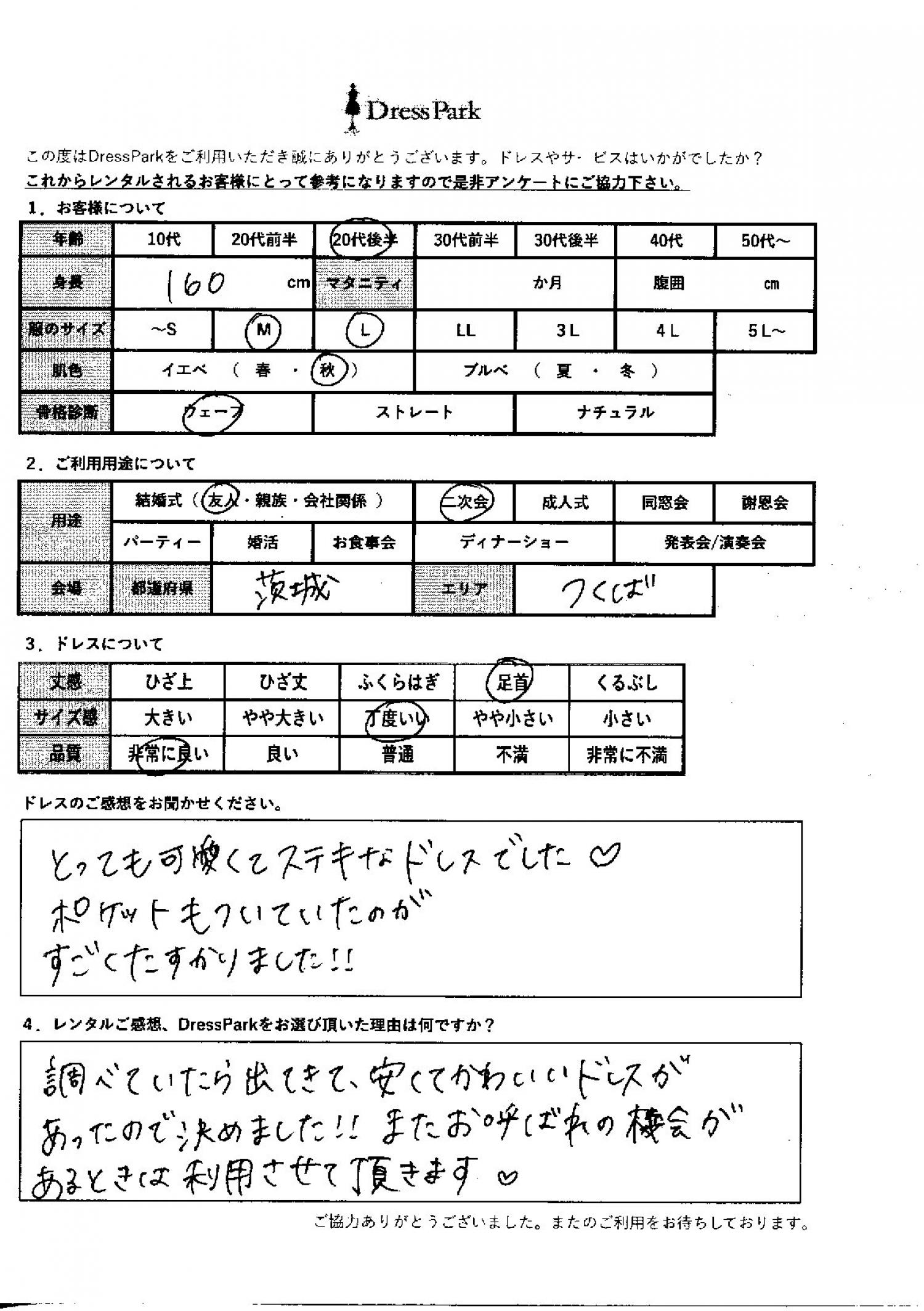 茨城県 A.M様160㎝ Mサイズ #20代#M/L#160~164㎝#結婚式(友人)#茨城県 ◆レンタルしたドレスはこちら ◆レンタルしたサイズは:M ◆レンタルした日付:2025/11/01 ドレスの着用感 ◆点数: (5点) ◆丈感:足首 ◆サイズ感:丁度いい ◆品質:非常に良い ◆肌色:イエベ ◆骨格診断:ウェーブ ドレスの感想 とても可愛くて素敵なドレスでした♡ポケットも付いていたのがすごく助かりました! レンタルのご感想、DressParkをお選び頂いた理由 調べていたら出てきて、安くてかわいいドレスがあったので、決めました!またお呼ばれの機会があるときは利用させていただきます♡ CUSTOMER REVIEWS お客様の声 気になるカテゴリー別にご利用の感想をチェック! ◆AGE 年代で見る 10代 20代 30代 40代 50代~ ◆SIZE サイズで見る SS/S M/L 大きいサイズLL~ ◆HIGHT 身長で見る 140~149㎝ 150~154㎝ 155~159㎝ 160~164㎝ 165~169㎝ 170㎝以上 ◆マタニティ ~3か月 4~6か月 7~8か月 9~10か月 ◆肌色 イエベ ブルべ ◆骨格診断 ウェーブ ストレート ナチュラル ◆利用シーン 結婚式(友人) 結婚式(親族) 結婚式(会社関係) 二次会 成人式 謝恩会 パーティー その他 CUSTOMER REVIEWS都道府県別お客様の声 都道府県別にのお客様の声をチェック! 北海道 青森県 岩手県 宮城県 秋田県 山形県 福島県 茨城県 栃木県 群馬県 埼玉県 千葉県 東京都 神奈川県 新潟県 富山県 石川県 福井県 山梨県 長野県 岐阜県 静岡県 愛知県 三重県 滋賀県 京都府 大阪府 兵庫県 奈良県 和歌山県 鳥取県 島根県 岡山県 広島県 山口県 徳島県 香川県 愛媛県 高知県 福岡県 佐賀県 長崎県 熊本県 大分県 宮崎県 鹿児島県 沖縄県 CUSTOMER REVIEWSエリア別お客様の声 都道府県別にのお客様の声をチェック! 札幌 仙台 名古屋 軽井沢 金沢 神戸・芦屋 博多 那覇 梅田・新大阪 難波・心斎橋 鎌倉・湘南 横浜・みなとみらい 舞浜・浦安・幕張 大宮・浦和 青山・表参道 六本木・麻布 渋谷・恵比寿 新宿 池袋 銀座・丸の内 お台場・汐留 鹿児島市 郡山市 福島市 東予 甲府・石和 LINEでお問い合わせ このサイトではJavaScriptを使用しています