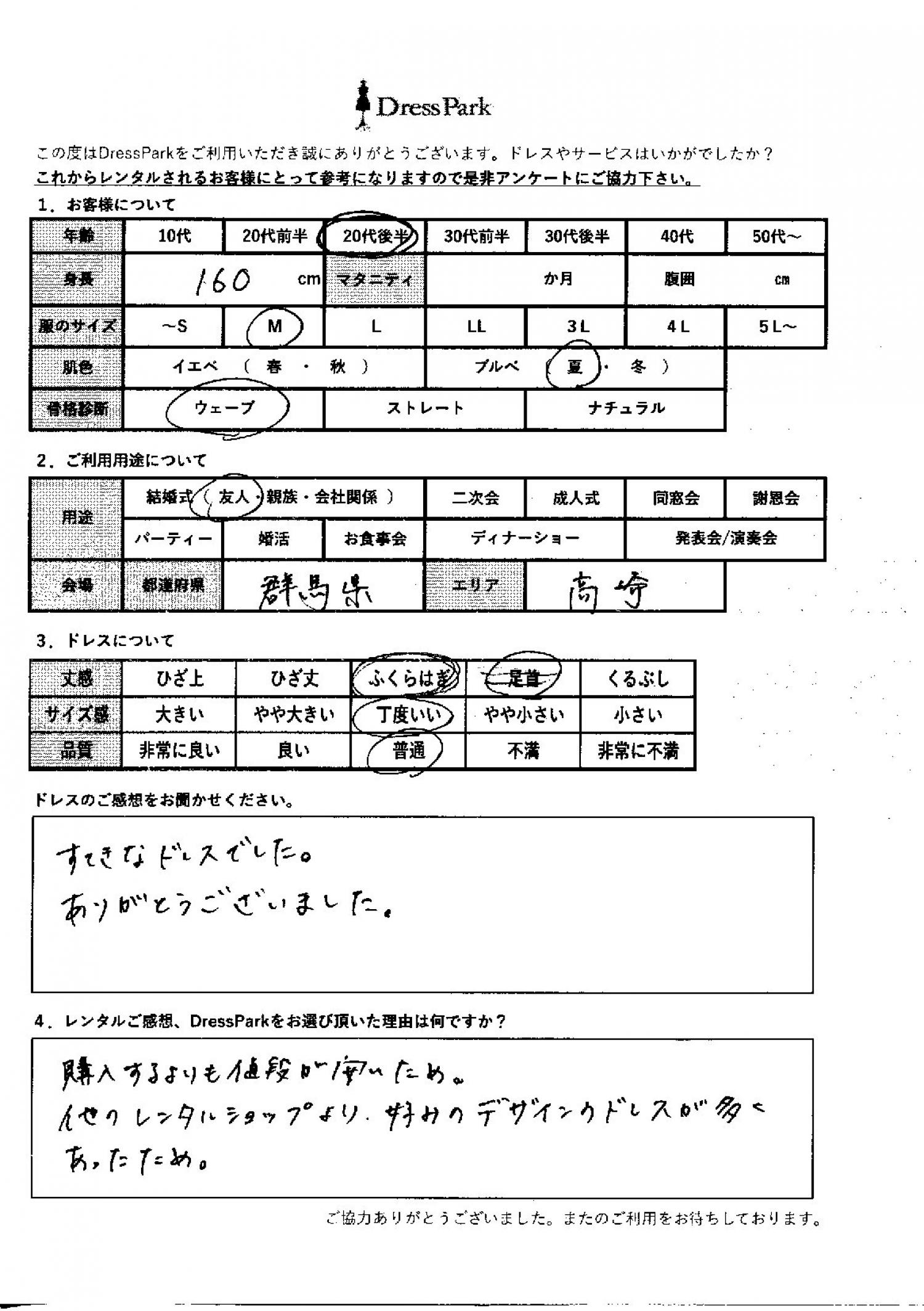 群馬県 Y.U様160㎝ Mサイズ #20代#M/L#160~164㎝#結婚式(友人)#群馬県 ◆レンタルしたドレスはこちら ◆レンタルしたサイズは:M ◆レンタルした日付:2025/11/01 ドレスの着用感 ◆点数: (4点) ◆丈感:ふくらはぎ ◆サイズ感:丁度いい ◆品質:普通 ◆肌色:ブルべ ◆骨格診断:ウェーブ ドレスの感想 素敵なドレスでした。ありがとうございました。 レンタルのご感想、DressParkをお選び頂いた理由 購入するよりも値段が安いため。他のレンタルショップより好みのデザインのドレスが多くあったため。 CUSTOMER REVIEWS お客様の声 気になるカテゴリー別にご利用の感想をチェック! ◆AGE 年代で見る 10代 20代 30代 40代 50代~ ◆SIZE サイズで見る SS/S M/L 大きいサイズLL~ ◆HIGHT 身長で見る 140~149㎝ 150~154㎝ 155~159㎝ 160~164㎝ 165~169㎝ 170㎝以上 ◆マタニティ ~3か月 4~6か月 7~8か月 9~10か月 ◆肌色 イエベ ブルべ ◆骨格診断 ウェーブ ストレート ナチュラル ◆利用シーン 結婚式(友人) 結婚式(親族) 結婚式(会社関係) 二次会 成人式 謝恩会 パーティー その他 CUSTOMER REVIEWS都道府県別お客様の声 都道府県別にのお客様の声をチェック! 北海道 青森県 岩手県 宮城県 秋田県 山形県 福島県 茨城県 栃木県 群馬県 埼玉県 千葉県 東京都 神奈川県 新潟県 富山県 石川県 福井県 山梨県 長野県 岐阜県 静岡県 愛知県 三重県 滋賀県 京都府 大阪府 兵庫県 奈良県 和歌山県 鳥取県 島根県 岡山県 広島県 山口県 徳島県 香川県 愛媛県 高知県 福岡県 佐賀県 長崎県 熊本県 大分県 宮崎県 鹿児島県 沖縄県 CUSTOMER REVIEWSエリア別お客様の声 都道府県別にのお客様の声をチェック! 札幌 仙台 名古屋 軽井沢 金沢 神戸・芦屋 博多 那覇 梅田・新大阪 難波・心斎橋 鎌倉・湘南 横浜・みなとみらい 舞浜・浦安・幕張 大宮・浦和 青山・表参道 六本木・麻布 渋谷・恵比寿 新宿 池袋 銀座・丸の内 お台場・汐留 鹿児島市 郡山市 福島市 東予 甲府・石和 LINEでお問い合わせ このサイトではJavaScriptを使用しています