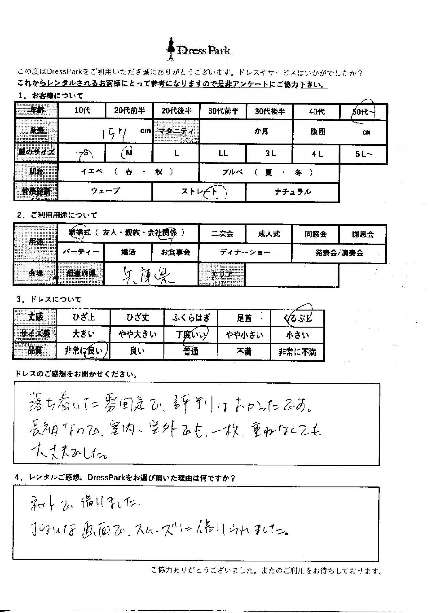兵庫県 N.K様157㎝ Mサイズ #50代~#M/L#155~159㎝#結婚式(会社関係)#兵庫県 ◆レンタルしたドレスはこちら ◆レンタルしたサイズは:M ◆レンタルした日付:2025/11/01 ドレスの着用感 ◆点数: (5点) ◆丈感:くるぶし ◆サイズ感:丁度いい ◆品質:非常に良い ◆骨格診断:ストレート ドレスの感想 落ち着いた雰囲気で、評判は良かったです。長袖なので、室内屋外でも1枚重ねなくても大丈夫でした。 レンタルのご感想、DressParkをお選び頂いた理由 ネットで借りました。丁寧な画面でスムーズに借りられました。 CUSTOMER REVIEWS お客様の声 気になるカテゴリー別にご利用の感想をチェック! ◆AGE 年代で見る 10代 20代 30代 40代 50代~ ◆SIZE サイズで見る SS/S M/L 大きいサイズLL~ ◆HIGHT 身長で見る 140~149㎝ 150~154㎝ 155~159㎝ 160~164㎝ 165~169㎝ 170㎝以上 ◆マタニティ ~3か月 4~6か月 7~8か月 9~10か月 ◆肌色 イエベ ブルべ ◆骨格診断 ウェーブ ストレート ナチュラル ◆利用シーン 結婚式(友人) 結婚式(親族) 結婚式(会社関係) 二次会 成人式 謝恩会 パーティー その他 CUSTOMER REVIEWS都道府県別お客様の声 都道府県別にのお客様の声をチェック! 北海道 青森県 岩手県 宮城県 秋田県 山形県 福島県 茨城県 栃木県 群馬県 埼玉県 千葉県 東京都 神奈川県 新潟県 富山県 石川県 福井県 山梨県 長野県 岐阜県 静岡県 愛知県 三重県 滋賀県 京都府 大阪府 兵庫県 奈良県 和歌山県 鳥取県 島根県 岡山県 広島県 山口県 徳島県 香川県 愛媛県 高知県 福岡県 佐賀県 長崎県 熊本県 大分県 宮崎県 鹿児島県 沖縄県 CUSTOMER REVIEWSエリア別お客様の声 都道府県別にのお客様の声をチェック! 札幌 仙台 名古屋 軽井沢 金沢 神戸・芦屋 博多 那覇 梅田・新大阪 難波・心斎橋 鎌倉・湘南 横浜・みなとみらい 舞浜・浦安・幕張 大宮・浦和 青山・表参道 六本木・麻布 渋谷・恵比寿 新宿 池袋 銀座・丸の内 お台場・汐留 鹿児島市 郡山市 福島市 東予 甲府・石和 LINEでお問い合わせ このサイトではJavaScriptを使用しています