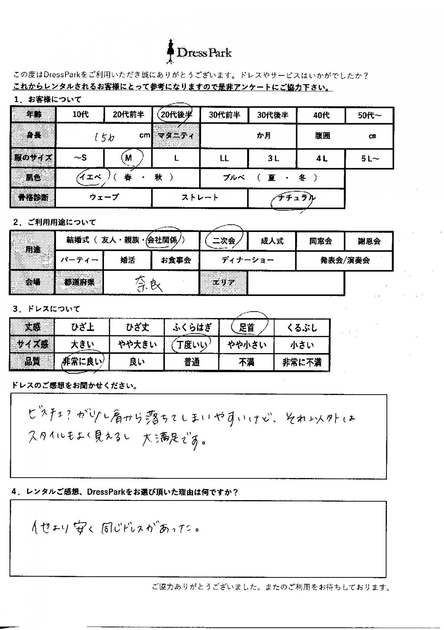 奈良県 C.M様156㎝ Mサイズ #20代#M/L#155~159㎝#結婚式(会社関係)#奈良県 ◆レンタルしたドレスはこちら ◆レンタルしたサイズは:M ◆レンタルした日付:2025/11/01 ドレスの着用感 ◆点数: (5点) ◆丈感:足首 ◆サイズ感:丁度いい ◆品質:非常に良い ◆肌色:イエベ ◆骨格診断:ナチュラル ドレスの感想 ビスチェが少し肩から落ちてきしまいやすいけど、それ以外はスタイルもよく見えるし大満足です。 レンタルのご感想、DressParkをお選び頂いた理由 他より安く同じドレスがあった。 CUSTOMER REVIEWS お客様の声 気になるカテゴリー別にご利用の感想をチェック! ◆AGE 年代で見る 10代 20代 30代 40代 50代~ ◆SIZE サイズで見る SS/S M/L 大きいサイズLL~ ◆HIGHT 身長で見る 140~149㎝ 150~154㎝ 155~159㎝ 160~164㎝ 165~169㎝ 170㎝以上 ◆マタニティ ~3か月 4~6か月 7~8か月 9~10か月 ◆肌色 イエベ ブルべ ◆骨格診断 ウェーブ ストレート ナチュラル ◆利用シーン 結婚式(友人) 結婚式(親族) 結婚式(会社関係) 二次会 成人式 謝恩会 パーティー その他 CUSTOMER REVIEWS都道府県別お客様の声 都道府県別にのお客様の声をチェック! 北海道 青森県 岩手県 宮城県 秋田県 山形県 福島県 茨城県 栃木県 群馬県 埼玉県 千葉県 東京都 神奈川県 新潟県 富山県 石川県 福井県 山梨県 長野県 岐阜県 静岡県 愛知県 三重県 滋賀県 京都府 大阪府 兵庫県 奈良県 和歌山県 鳥取県 島根県 岡山県 広島県 山口県 徳島県 香川県 愛媛県 高知県 福岡県 佐賀県 長崎県 熊本県 大分県 宮崎県 鹿児島県 沖縄県 CUSTOMER REVIEWSエリア別お客様の声 都道府県別にのお客様の声をチェック! 札幌 仙台 名古屋 軽井沢 金沢 神戸・芦屋 博多 那覇 梅田・新大阪 難波・心斎橋 鎌倉・湘南 横浜・みなとみらい 舞浜・浦安・幕張 大宮・浦和 青山・表参道 六本木・麻布 渋谷・恵比寿 新宿 池袋 銀座・丸の内 お台場・汐留 鹿児島市 郡山市 福島市 東予 甲府・石和 LINEでお問い合わせ このサイトではJavaScriptを使用しています