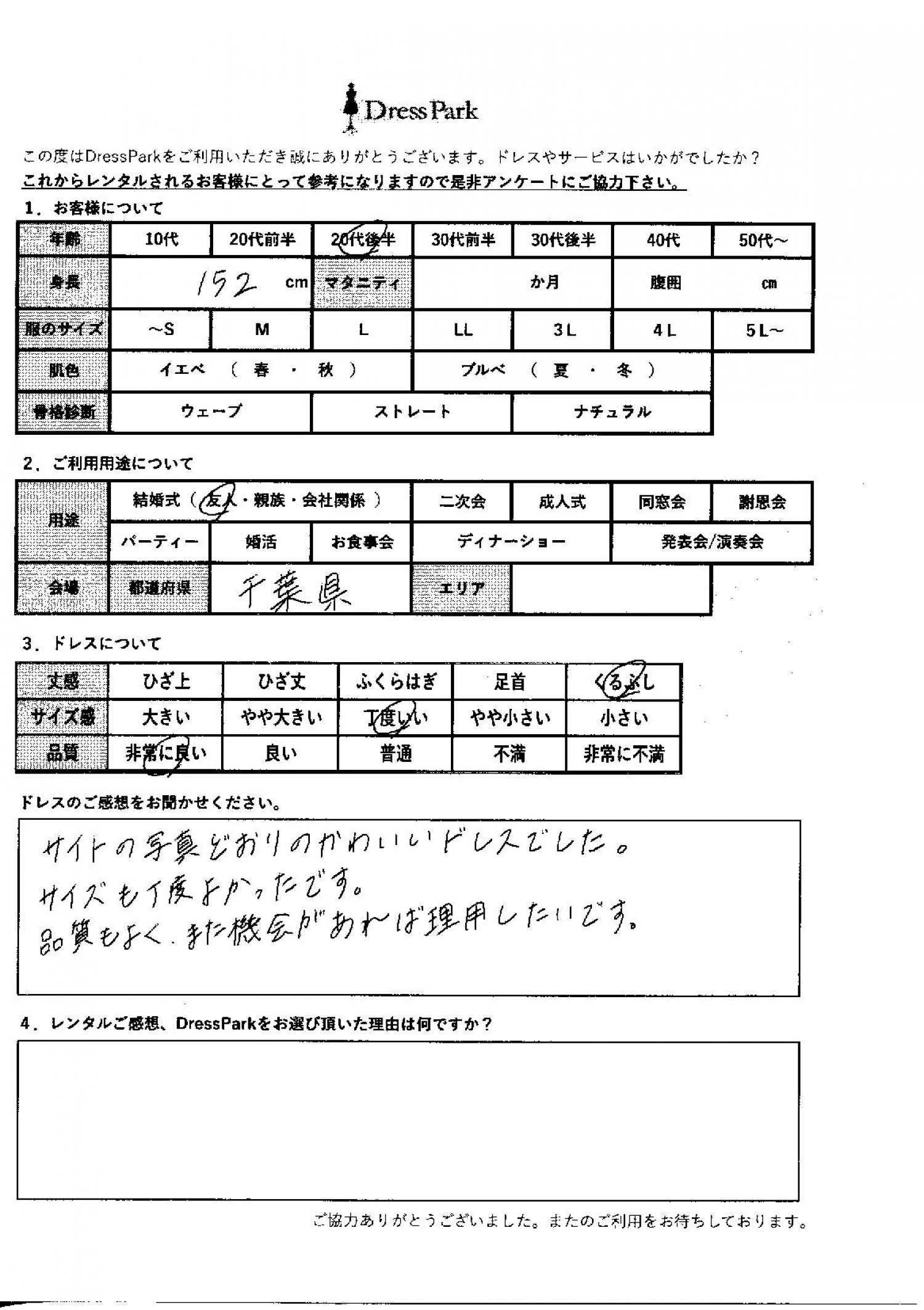 千葉県 H.S様152㎝ Mサイズ #20代#M/L#150~154㎝#結婚式(友人)#千葉県 ◆レンタルしたドレスはこちら ◆レンタルしたサイズは:M ◆レンタルした日付:2025/11/01 ドレスの着用感 ◆点数: (5点) ◆丈感:くるぶし ◆サイズ感:丁度いい ◆品質:非常に良い ドレスの感想 サイトの写真通りのかわいいドレスでした。サイズもちょうど良かったです。品質も良く、また機会があれば利用したいです。 CUSTOMER REVIEWS お客様の声 気になるカテゴリー別にご利用の感想をチェック! ◆AGE 年代で見る 10代 20代 30代 40代 50代~ ◆SIZE サイズで見る SS/S M/L 大きいサイズLL~ ◆HIGHT 身長で見る 140~149㎝ 150~154㎝ 155~159㎝ 160~164㎝ 165~169㎝ 170㎝以上 ◆マタニティ ~3か月 4~6か月 7~8か月 9~10か月 ◆肌色 イエベ ブルべ ◆骨格診断 ウェーブ ストレート ナチュラル ◆利用シーン 結婚式(友人) 結婚式(親族) 結婚式(会社関係) 二次会 成人式 謝恩会 パーティー その他 CUSTOMER REVIEWS都道府県別お客様の声 都道府県別にのお客様の声をチェック! 北海道 青森県 岩手県 宮城県 秋田県 山形県 福島県 茨城県 栃木県 群馬県 埼玉県 千葉県 東京都 神奈川県 新潟県 富山県 石川県 福井県 山梨県 長野県 岐阜県 静岡県 愛知県 三重県 滋賀県 京都府 大阪府 兵庫県 奈良県 和歌山県 鳥取県 島根県 岡山県 広島県 山口県 徳島県 香川県 愛媛県 高知県 福岡県 佐賀県 長崎県 熊本県 大分県 宮崎県 鹿児島県 沖縄県 CUSTOMER REVIEWSエリア別お客様の声 都道府県別にのお客様の声をチェック! 札幌 仙台 名古屋 軽井沢 金沢 神戸・芦屋 博多 那覇 梅田・新大阪 難波・心斎橋 鎌倉・湘南 横浜・みなとみらい 舞浜・浦安・幕張 大宮・浦和 青山・表参道 六本木・麻布 渋谷・恵比寿 新宿 池袋 銀座・丸の内 お台場・汐留 鹿児島市 郡山市 福島市 東予 甲府・石和 LINEでお問い合わせ このサイトではJavaScriptを使用しています