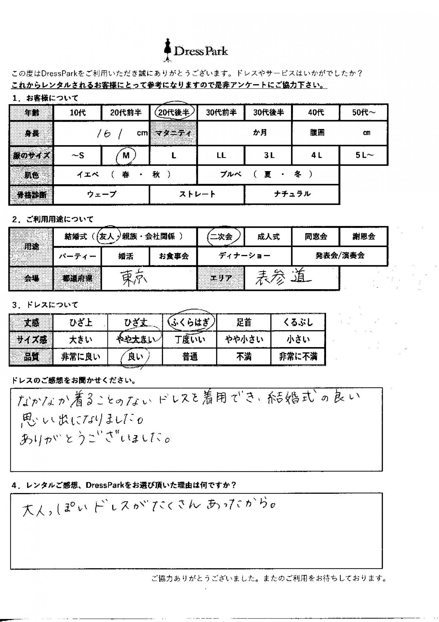 東京都 A.I様161㎝ Mサイズ青山・表参道 #20代#M/L#160~164㎝#結婚式(友人)#東京都#青山・表参道 ◆レンタルしたドレスはこちら ◆レンタルしたサイズは:M ◆レンタルした日付:2025/11/01 ドレスの着用感 ◆点数: (4点) ◆丈感:ふくらはぎ ◆サイズ感:やや大きい ◆品質:良い ドレスの感想 なかなか着ることのないドレスを着用でき、結婚式の良い思い出になりました。ありがとうございました。 レンタルのご感想、DressParkをお選び頂いた理由 大人っぽいドレスがたくさんあったから。 CUSTOMER REVIEWS お客様の声 気になるカテゴリー別にご利用の感想をチェック! ◆AGE 年代で見る 10代 20代 30代 40代 50代~ ◆SIZE サイズで見る SS/S M/L 大きいサイズLL~ ◆HIGHT 身長で見る 140~149㎝ 150~154㎝ 155~159㎝ 160~164㎝ 165~169㎝ 170㎝以上 ◆マタニティ ~3か月 4~6か月 7~8か月 9~10か月 ◆肌色 イエベ ブルべ ◆骨格診断 ウェーブ ストレート ナチュラル ◆利用シーン 結婚式(友人) 結婚式(親族) 結婚式(会社関係) 二次会 成人式 謝恩会 パーティー その他 CUSTOMER REVIEWS都道府県別お客様の声 都道府県別にのお客様の声をチェック! 北海道 青森県 岩手県 宮城県 秋田県 山形県 福島県 茨城県 栃木県 群馬県 埼玉県 千葉県 東京都 神奈川県 新潟県 富山県 石川県 福井県 山梨県 長野県 岐阜県 静岡県 愛知県 三重県 滋賀県 京都府 大阪府 兵庫県 奈良県 和歌山県 鳥取県 島根県 岡山県 広島県 山口県 徳島県 香川県 愛媛県 高知県 福岡県 佐賀県 長崎県 熊本県 大分県 宮崎県 鹿児島県 沖縄県 CUSTOMER REVIEWSエリア別お客様の声 都道府県別にのお客様の声をチェック! 札幌 仙台 名古屋 軽井沢 金沢 神戸・芦屋 博多 那覇 梅田・新大阪 難波・心斎橋 鎌倉・湘南 横浜・みなとみらい 舞浜・浦安・幕張 大宮・浦和 青山・表参道 六本木・麻布 渋谷・恵比寿 新宿 池袋 銀座・丸の内 お台場・汐留 鹿児島市 郡山市 福島市 東予 甲府・石和 LINEでお問い合わせ このサイトではJavaScriptを使用しています