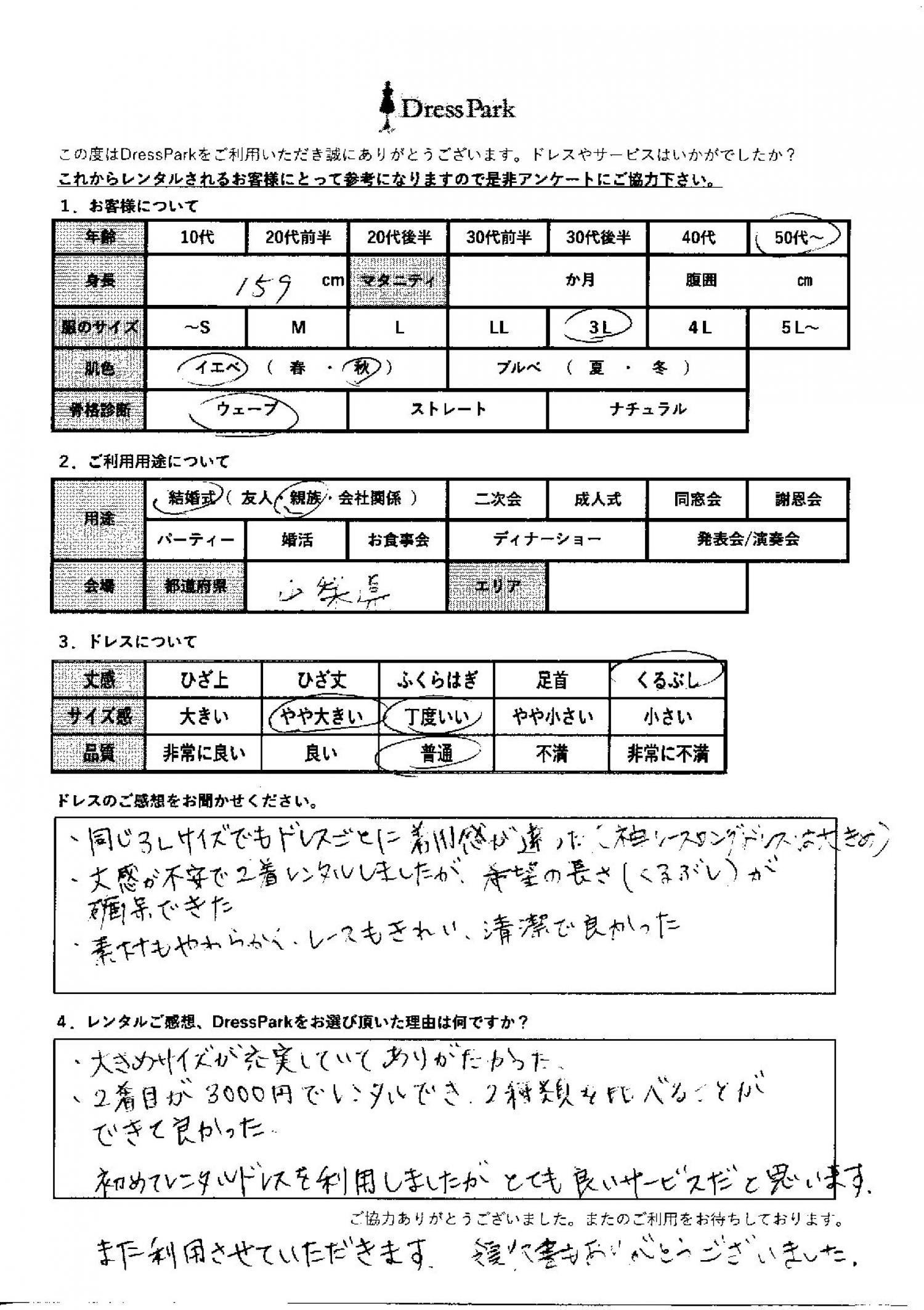 山梨県 E.H様159㎝ 3Lサイズ #50代~#大きいサイズLL~#155~159㎝#結婚式(親族)#山梨県 ◆レンタルしたドレスはこちら ◆レンタルしたサイズは:3L ◆レンタルした日付:2025/11/02 ドレスの着用感 ◆点数: (4点) ◆丈感:くるぶし ◆サイズ感:丁度いい ◆品質:普通 ◆肌色:イエベ ◆骨格診断:ウェーブ ドレスの感想 同じ3 Lサイズでもドレスごとに着用感が違った。(袖レースロングドレスは大きめ)丈感が不安で2着レンタルしましたが、希望の長さ(くるぶし)が確保できた。素材も柔らかく、レースもきれい。清潔で良かった。 レンタルのご感想、DressParkをお選び頂いた理由 大きめサイズが充実していてありがたかった。2着目が3000円でレンタルでき、2種類を選べることができてよかった。初めてレンタルドレスを利用しましたが、とても良いサービスだと思います。また利用させていただきます。領収書もありがとうございました。 CUSTOMER REVIEWS お客様の声 気になるカテゴリー別にご利用の感想をチェック! ◆AGE 年代で見る 10代 20代 30代 40代 50代~ ◆SIZE サイズで見る SS/S M/L 大きいサイズLL~ ◆HIGHT 身長で見る 140~149㎝ 150~154㎝ 155~159㎝ 160~164㎝ 165~169㎝ 170㎝以上 ◆マタニティ ~3か月 4~6か月 7~8か月 9~10か月 ◆肌色 イエベ ブルべ ◆骨格診断 ウェーブ ストレート ナチュラル ◆利用シーン 結婚式(友人) 結婚式(親族) 結婚式(会社関係) 二次会 成人式 謝恩会 パーティー その他 CUSTOMER REVIEWS都道府県別お客様の声 都道府県別にのお客様の声をチェック! 北海道 青森県 岩手県 宮城県 秋田県 山形県 福島県 茨城県 栃木県 群馬県 埼玉県 千葉県 東京都 神奈川県 新潟県 富山県 石川県 福井県 山梨県 長野県 岐阜県 静岡県 愛知県 三重県 滋賀県 京都府 大阪府 兵庫県 奈良県 和歌山県 鳥取県 島根県 岡山県 広島県 山口県 徳島県 香川県 愛媛県 高知県 福岡県 佐賀県 長崎県 熊本県 大分県 宮崎県 鹿児島県 沖縄県 CUSTOMER REVIEWSエリア別お客様の声 都道府県別にのお客様の声をチェック! 札幌 仙台 名古屋 軽井沢 金沢 神戸・芦屋 博多 那覇 梅田・新大阪 難波・心斎橋 鎌倉・湘南 横浜・みなとみらい 舞浜・浦安・幕張 大宮・浦和 青山・表参道 六本木・麻布 渋谷・恵比寿 新宿 池袋 銀座・丸の内 お台場・汐留 鹿児島市 郡山市 福島市 東予 甲府・石和 LINEでお問い合わせ このサイトではJavaScriptを使用しています