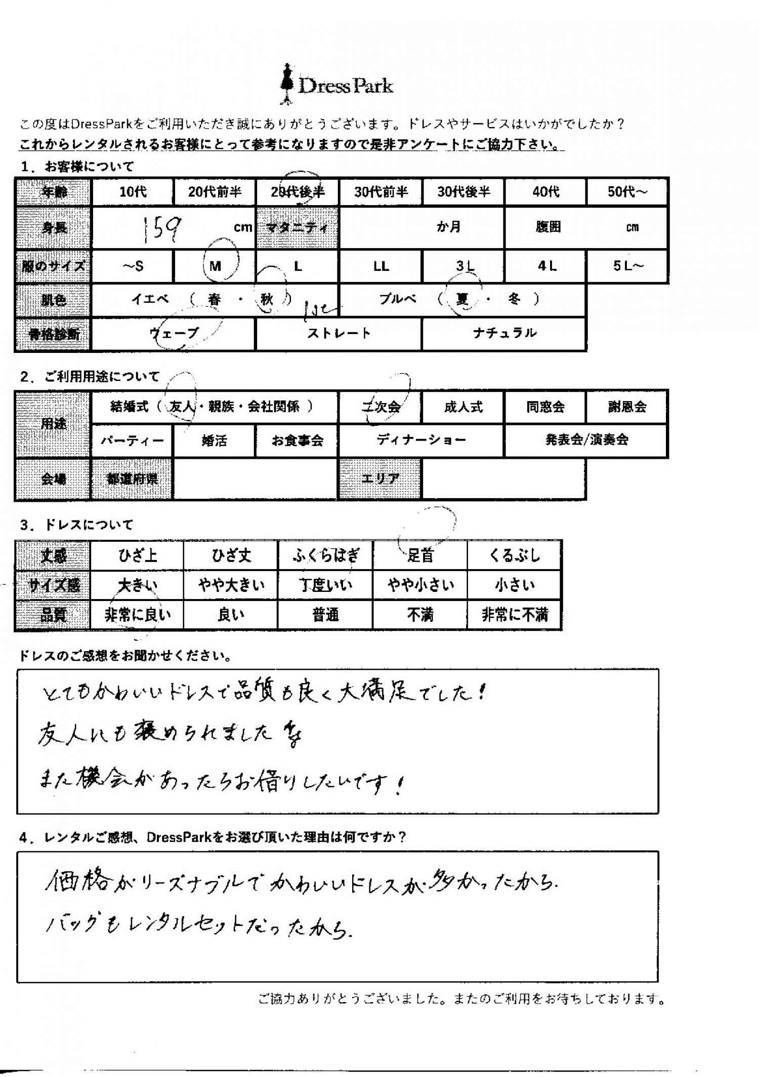東京都 C.N様159㎝ Mサイズ #20代#M/L#155~159㎝#結婚式(友人)#東京都 ◆レンタルしたドレスはこちら ◆レンタルしたサイズは:M ◆レンタルした日付:2025/11/02 ドレスの着用感 ◆点数: (5点) ◆丈感:足首 ◆サイズ感:丁度いい ◆品質:非常に良い ◆肌色:イエベ ◆骨格診断:ウェーブ ドレスの感想 とても可愛いドレスで、品質も良く大満足でした!友人にも褒められました。また機会があったらお借りしたいです! レンタルのご感想、DressParkをお選び頂いた理由 価格がリーズナブルでかわいいドレスが多かったから。バックもレンタルセットだったから。 CUSTOMER REVIEWS お客様の声 気になるカテゴリー別にご利用の感想をチェック! ◆AGE 年代で見る 10代 20代 30代 40代 50代~ ◆SIZE サイズで見る SS/S M/L 大きいサイズLL~ ◆HIGHT 身長で見る 140~149㎝ 150~154㎝ 155~159㎝ 160~164㎝ 165~169㎝ 170㎝以上 ◆マタニティ ~3か月 4~6か月 7~8か月 9~10か月 ◆肌色 イエベ ブルべ ◆骨格診断 ウェーブ ストレート ナチュラル ◆利用シーン 結婚式(友人) 結婚式(親族) 結婚式(会社関係) 二次会 成人式 謝恩会 パーティー その他 CUSTOMER REVIEWS都道府県別お客様の声 都道府県別にのお客様の声をチェック! 北海道 青森県 岩手県 宮城県 秋田県 山形県 福島県 茨城県 栃木県 群馬県 埼玉県 千葉県 東京都 神奈川県 新潟県 富山県 石川県 福井県 山梨県 長野県 岐阜県 静岡県 愛知県 三重県 滋賀県 京都府 大阪府 兵庫県 奈良県 和歌山県 鳥取県 島根県 岡山県 広島県 山口県 徳島県 香川県 愛媛県 高知県 福岡県 佐賀県 長崎県 熊本県 大分県 宮崎県 鹿児島県 沖縄県 CUSTOMER REVIEWSエリア別お客様の声 都道府県別にのお客様の声をチェック! 札幌 仙台 名古屋 軽井沢 金沢 神戸・芦屋 博多 那覇 梅田・新大阪 難波・心斎橋 鎌倉・湘南 横浜・みなとみらい 舞浜・浦安・幕張 大宮・浦和 青山・表参道 六本木・麻布 渋谷・恵比寿 新宿 池袋 銀座・丸の内 お台場・汐留 鹿児島市 郡山市 福島市 東予 甲府・石和 LINEでお問い合わせ このサイトではJavaScriptを使用しています