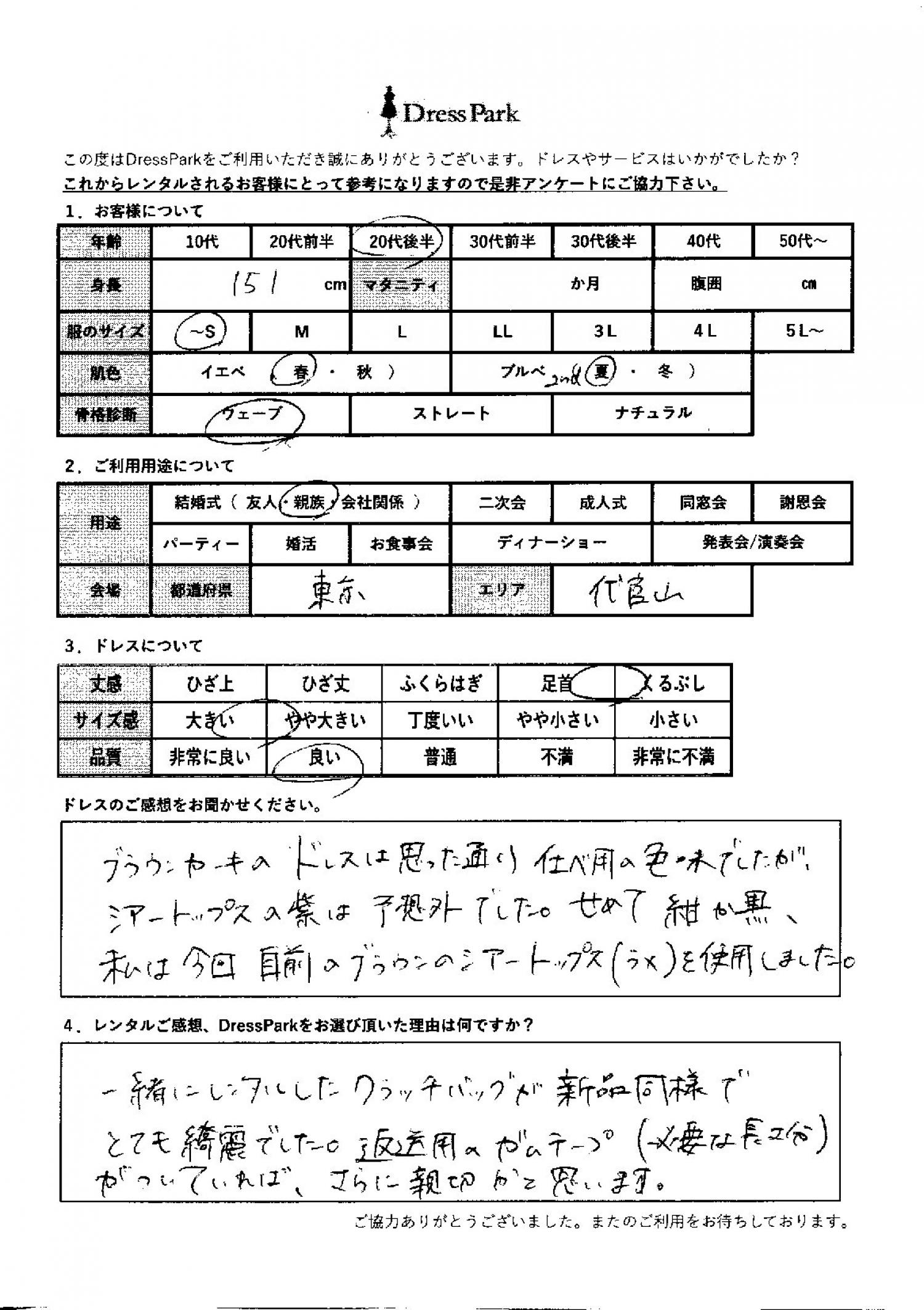 一緒にレンタルしたクラッチバッグが新品同様でとても綺麗でした。返送用のガムテープ(必要な長さ分)がついていれば、さらに親切かと思います。