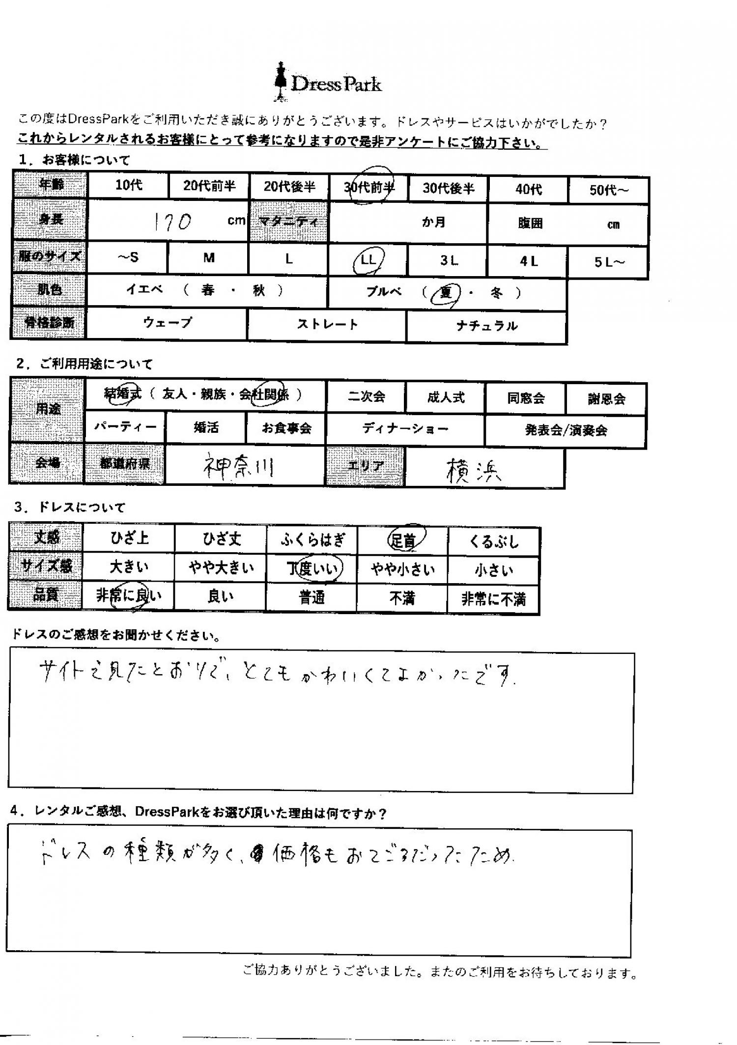 神奈川県 E.O様170㎝ LLサイズ横浜・みなとみらい #30代#M/L#170㎝以上#結婚式(会社関係)#神奈川県#横浜・みなとみらい ◆レンタルしたドレスはこちら ◆レンタルしたサイズは:L ◆レンタルした日付:2025/11/2 ドレスの着用感 ◆点数: (5点) ◆丈感:足首 ◆サイズ感:丁度いい ◆品質:非常に良い ◆肌色:ブルべ ドレスの感想 サイトで見たとおりで、とてもかわいくよかったです。 レンタルのご感想、DressParkをお選び頂いた理由 ドレスの種類が多く価格もおてごろだったため CUSTOMER REVIEWS お客様の声 気になるカテゴリー別にご利用の感想をチェック! ◆AGE 年代で見る 10代 20代 30代 40代 50代~ ◆SIZE サイズで見る SS/S M/L 大きいサイズLL~ ◆HIGHT 身長で見る 140~149㎝ 150~154㎝ 155~159㎝ 160~164㎝ 165~169㎝ 170㎝以上 ◆マタニティ ~3か月 4~6か月 7~8か月 9~10か月 ◆肌色 イエベ ブルべ ◆骨格診断 ウェーブ ストレート ナチュラル ◆利用シーン 結婚式(友人) 結婚式(親族) 結婚式(会社関係) 二次会 成人式 謝恩会 パーティー その他 CUSTOMER REVIEWS都道府県別お客様の声 都道府県別にのお客様の声をチェック! 北海道 青森県 岩手県 宮城県 秋田県 山形県 福島県 茨城県 栃木県 群馬県 埼玉県 千葉県 東京都 神奈川県 新潟県 富山県 石川県 福井県 山梨県 長野県 岐阜県 静岡県 愛知県 三重県 滋賀県 京都府 大阪府 兵庫県 奈良県 和歌山県 鳥取県 島根県 岡山県 広島県 山口県 徳島県 香川県 愛媛県 高知県 福岡県 佐賀県 長崎県 熊本県 大分県 宮崎県 鹿児島県 沖縄県 CUSTOMER REVIEWSエリア別お客様の声 都道府県別にのお客様の声をチェック! 札幌 仙台 名古屋 軽井沢 金沢 神戸・芦屋 博多 那覇 梅田・新大阪 難波・心斎橋 鎌倉・湘南 横浜・みなとみらい 舞浜・浦安・幕張 大宮・浦和 青山・表参道 六本木・麻布 渋谷・恵比寿 新宿 池袋 銀座・丸の内 お台場・汐留 鹿児島市 郡山市 福島市 東予 甲府・石和 LINEでお問い合わせ このサイトではJavaScriptを使用しています