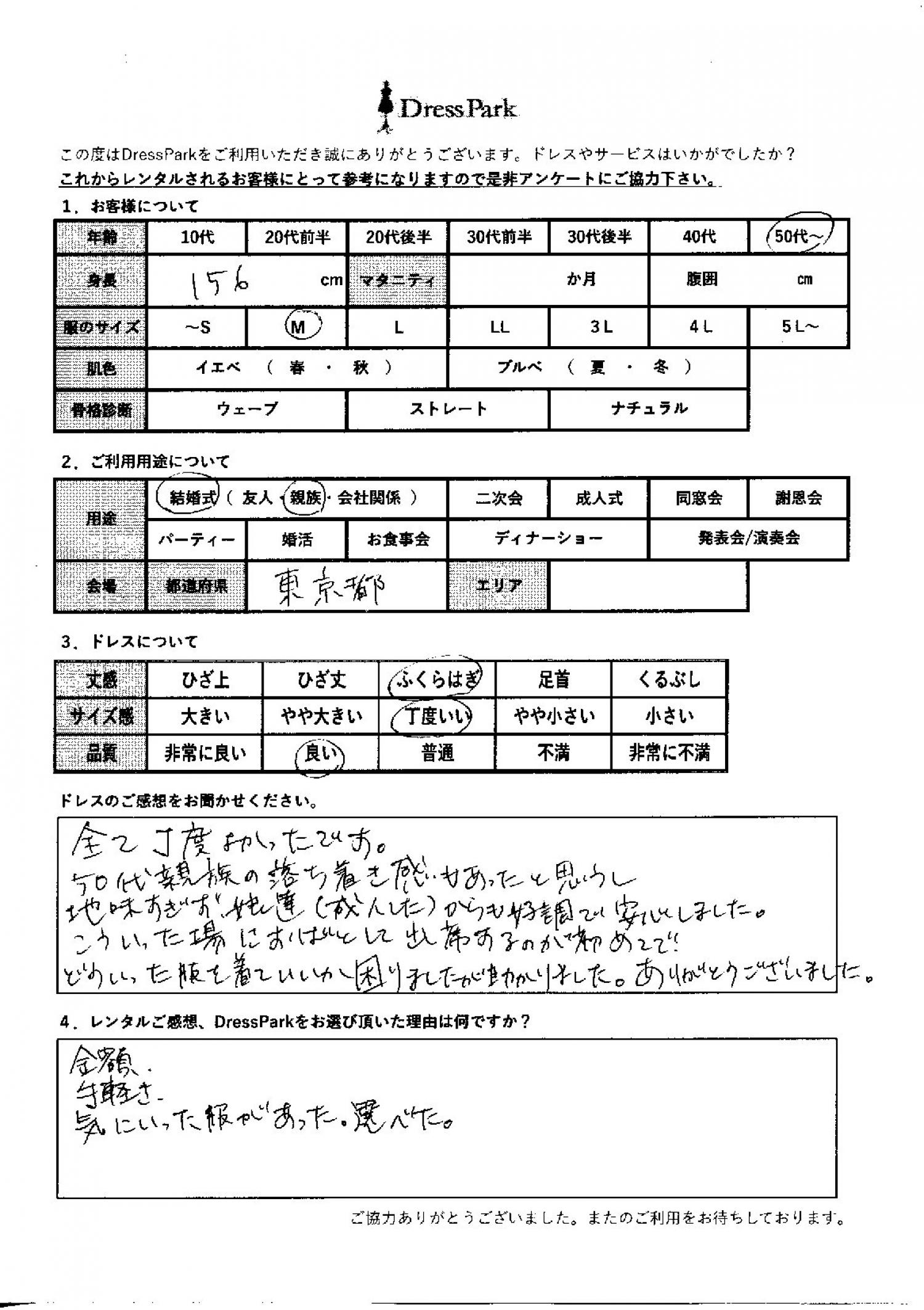 東京都 H.M様156㎝ Mサイズ #50代~#M/L#155~159㎝#結婚式(親族)#東京都 ◆レンタルしたドレスはこちら ◆レンタルしたサイズは:M ◆レンタルした日付:2025/11/02 ドレスの着用感 ◆点数: (4点) ◆丈感:ふくらはぎ ◆サイズ感:丁度いい ◆品質:良い ドレスの感想 全てちょうど良かったです。50代親族の落ち着き感もあったと思うし、地味すぎず、娘たち(成人した)からも好評で安心しました。こういった場に叔母として出席するのが初めてで、どういった服を着ていいか困りましたが、助かりました。ありがとうございました。 レンタルのご感想、DressParkをお選び頂いた理由 金額、手軽さ、気に気に入った服があった。 CUSTOMER REVIEWS お客様の声 気になるカテゴリー別にご利用の感想をチェック! ◆AGE 年代で見る 10代 20代 30代 40代 50代~ ◆SIZE サイズで見る SS/S M/L 大きいサイズLL~ ◆HIGHT 身長で見る 140~149㎝ 150~154㎝ 155~159㎝ 160~164㎝ 165~169㎝ 170㎝以上 ◆マタニティ ~3か月 4~6か月 7~8か月 9~10か月 ◆肌色 イエベ ブルべ ◆骨格診断 ウェーブ ストレート ナチュラル ◆利用シーン 結婚式(友人) 結婚式(親族) 結婚式(会社関係) 二次会 成人式 謝恩会 パーティー その他 CUSTOMER REVIEWS都道府県別お客様の声 都道府県別にのお客様の声をチェック! 北海道 青森県 岩手県 宮城県 秋田県 山形県 福島県 茨城県 栃木県 群馬県 埼玉県 千葉県 東京都 神奈川県 新潟県 富山県 石川県 福井県 山梨県 長野県 岐阜県 静岡県 愛知県 三重県 滋賀県 京都府 大阪府 兵庫県 奈良県 和歌山県 鳥取県 島根県 岡山県 広島県 山口県 徳島県 香川県 愛媛県 高知県 福岡県 佐賀県 長崎県 熊本県 大分県 宮崎県 鹿児島県 沖縄県 CUSTOMER REVIEWSエリア別お客様の声 都道府県別にのお客様の声をチェック! 札幌 仙台 名古屋 軽井沢 金沢 神戸・芦屋 博多 那覇 梅田・新大阪 難波・心斎橋 鎌倉・湘南 横浜・みなとみらい 舞浜・浦安・幕張 大宮・浦和 青山・表参道 六本木・麻布 渋谷・恵比寿 新宿 池袋 銀座・丸の内 お台場・汐留 鹿児島市 郡山市 福島市 東予 甲府・石和 LINEでお問い合わせ このサイトではJavaScriptを使用しています