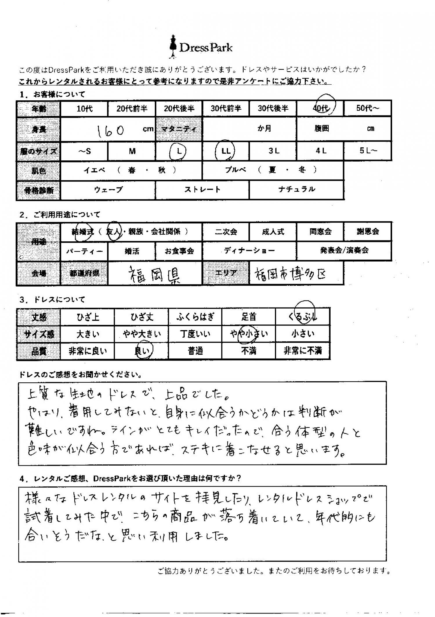 様々なドレスレンタルのサイトを拝見したり、レンタルドレスショップで試着してみた中で、こちらの商品が落ち着いていて、年代的にも合いそうだなと思い利用しました。