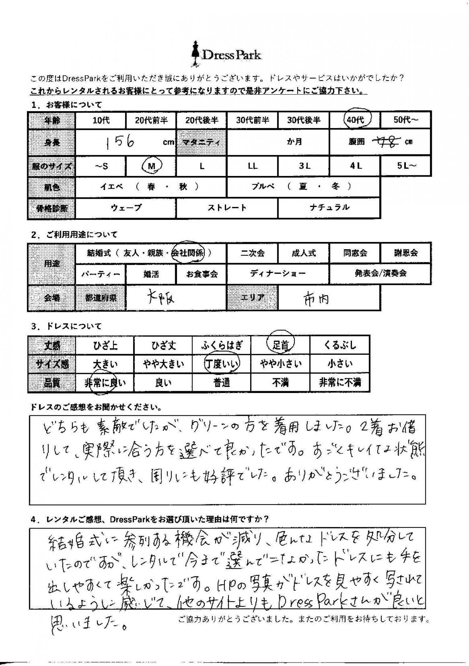 大阪府 S.N様156㎝ Mサイズ #40代#M/L#155~159㎝#結婚式(会社関係)#大阪府 ◆レンタルしたドレスはこちら ◆レンタルしたサイズは:M ◆レンタルした日付:2025/11/02 ドレスの着用感 ◆点数: (5点) ◆丈感:足首 ◆サイズ感:丁度いい ◆品質:非常に良い ドレスの感想 どちらも素敵でしたが、グリーンの方を着用しました。2着お借りして、実際に合う方を選べてよかったです。すごくきれいな状態でレンタルしていただき、周りにも好評でした。ありがとうございました。 レンタルのご感想、DressParkをお選び頂いた理由 結婚式に参列する機会が減り、いろんなドレスを処分していたのですが、レンタルで今まで選んでこなかったドレスにも手を出しやすくて楽しかったです。ホームページの写真がドレスを見やすく映されているように感じて、他のサイトよりもドレスパークさんが良いと思いました。 CUSTOMER REVIEWS お客様の声 気になるカテゴリー別にご利用の感想をチェック! ◆AGE 年代で見る 10代 20代 30代 40代 50代~ ◆SIZE サイズで見る SS/S M/L 大きいサイズLL~ ◆HIGHT 身長で見る 140~149㎝ 150~154㎝ 155~159㎝ 160~164㎝ 165~169㎝ 170㎝以上 ◆マタニティ ~3か月 4~6か月 7~8か月 9~10か月 ◆肌色 イエベ ブルべ ◆骨格診断 ウェーブ ストレート ナチュラル ◆利用シーン 結婚式(友人) 結婚式(親族) 結婚式(会社関係) 二次会 成人式 謝恩会 パーティー その他 CUSTOMER REVIEWS都道府県別お客様の声 都道府県別にのお客様の声をチェック! 北海道 青森県 岩手県 宮城県 秋田県 山形県 福島県 茨城県 栃木県 群馬県 埼玉県 千葉県 東京都 神奈川県 新潟県 富山県 石川県 福井県 山梨県 長野県 岐阜県 静岡県 愛知県 三重県 滋賀県 京都府 大阪府 兵庫県 奈良県 和歌山県 鳥取県 島根県 岡山県 広島県 山口県 徳島県 香川県 愛媛県 高知県 福岡県 佐賀県 長崎県 熊本県 大分県 宮崎県 鹿児島県 沖縄県 CUSTOMER REVIEWSエリア別お客様の声 都道府県別にのお客様の声をチェック! 札幌 仙台 名古屋 軽井沢 金沢 神戸・芦屋 博多 那覇 梅田・新大阪 難波・心斎橋 鎌倉・湘南 横浜・みなとみらい 舞浜・浦安・幕張 大宮・浦和 青山・表参道 六本木・麻布 渋谷・恵比寿 新宿 池袋 銀座・丸の内 お台場・汐留 鹿児島市 郡山市 福島市 東予 甲府・石和 LINEでお問い合わせ このサイトではJavaScriptを使用しています