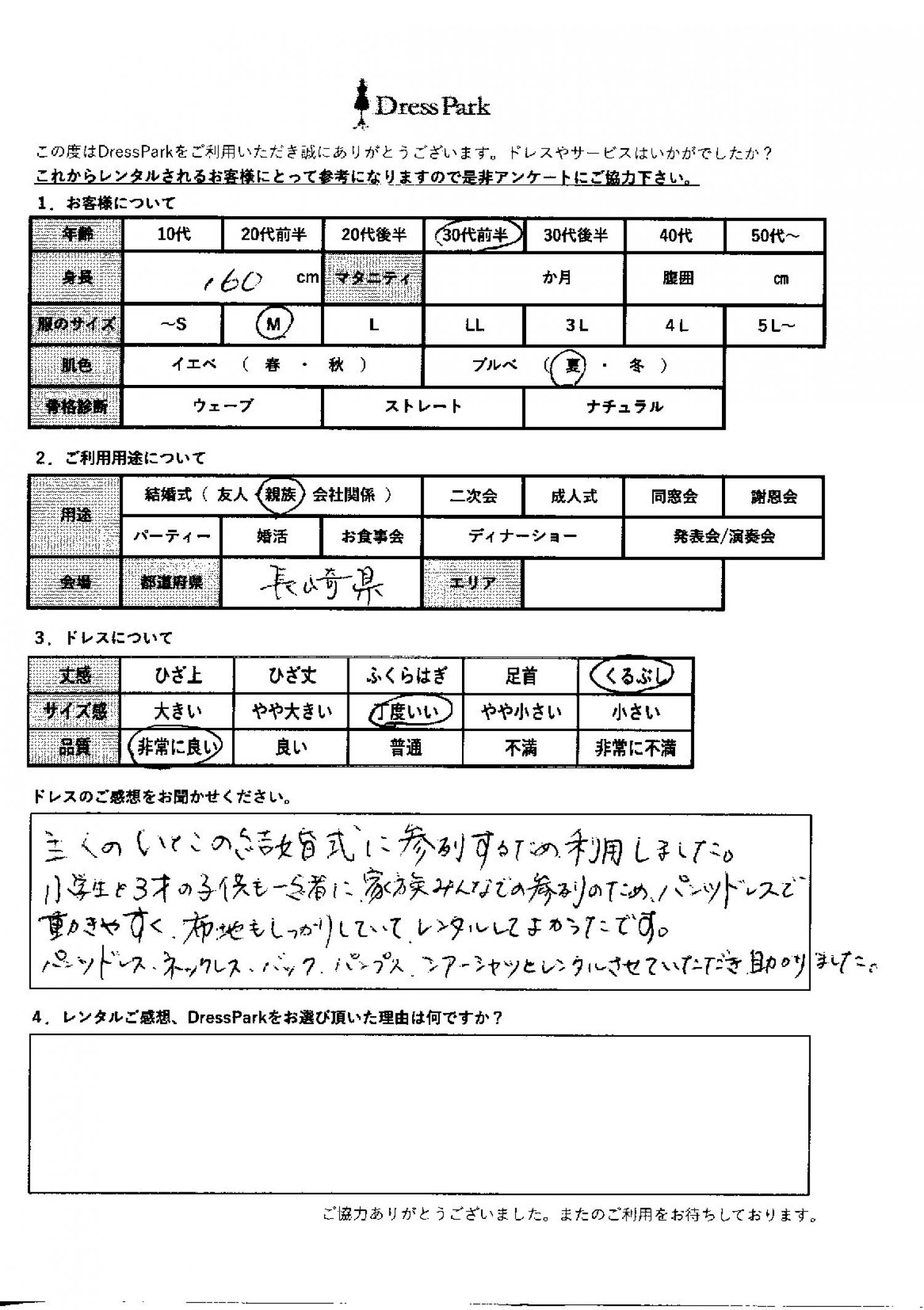 長崎県 N.M様160㎝ Mサイズ #30代#M/L#160~164㎝#結婚式(親族)#長崎県 ◆レンタルしたドレスはこちら ◆レンタルしたサイズは:M ◆レンタルした日付:2025/11/01 ドレスの着用感 ◆点数: (5点) ◆丈感:くるぶし ◆サイズ感:丁度いい ◆品質:非常に良い ◆肌色:ブルべ ドレスの感想 主人のいとこの結婚式に参列するため利用しました。小学生と3歳の子供も一緒に家族みんなでの参列のため、パンツドレスで動きやすく、布地もしっかりしていて、レンタルしてよかったです。パンツドレス、ネックレス、バッグ、パンプス、シアーシャツとレンタルさせていただき助かりました。 CUSTOMER REVIEWS お客様の声 気になるカテゴリー別にご利用の感想をチェック! ◆AGE 年代で見る 10代 20代 30代 40代 50代~ ◆SIZE サイズで見る SS/S M/L 大きいサイズLL~ ◆HIGHT 身長で見る 140~149㎝ 150~154㎝ 155~159㎝ 160~164㎝ 165~169㎝ 170㎝以上 ◆マタニティ ~3か月 4~6か月 7~8か月 9~10か月 ◆肌色 イエベ ブルべ ◆骨格診断 ウェーブ ストレート ナチュラル ◆利用シーン 結婚式(友人) 結婚式(親族) 結婚式(会社関係) 二次会 成人式 謝恩会 パーティー その他 CUSTOMER REVIEWS都道府県別お客様の声 都道府県別にのお客様の声をチェック! 北海道 青森県 岩手県 宮城県 秋田県 山形県 福島県 茨城県 栃木県 群馬県 埼玉県 千葉県 東京都 神奈川県 新潟県 富山県 石川県 福井県 山梨県 長野県 岐阜県 静岡県 愛知県 三重県 滋賀県 京都府 大阪府 兵庫県 奈良県 和歌山県 鳥取県 島根県 岡山県 広島県 山口県 徳島県 香川県 愛媛県 高知県 福岡県 佐賀県 長崎県 熊本県 大分県 宮崎県 鹿児島県 沖縄県 CUSTOMER REVIEWSエリア別お客様の声 都道府県別にのお客様の声をチェック! 札幌 仙台 名古屋 軽井沢 金沢 神戸・芦屋 博多 那覇 梅田・新大阪 難波・心斎橋 鎌倉・湘南 横浜・みなとみらい 舞浜・浦安・幕張 大宮・浦和 青山・表参道 六本木・麻布 渋谷・恵比寿 新宿 池袋 銀座・丸の内 お台場・汐留 鹿児島市 郡山市 福島市 東予 甲府・石和 LINEでお問い合わせ このサイトではJavaScriptを使用しています