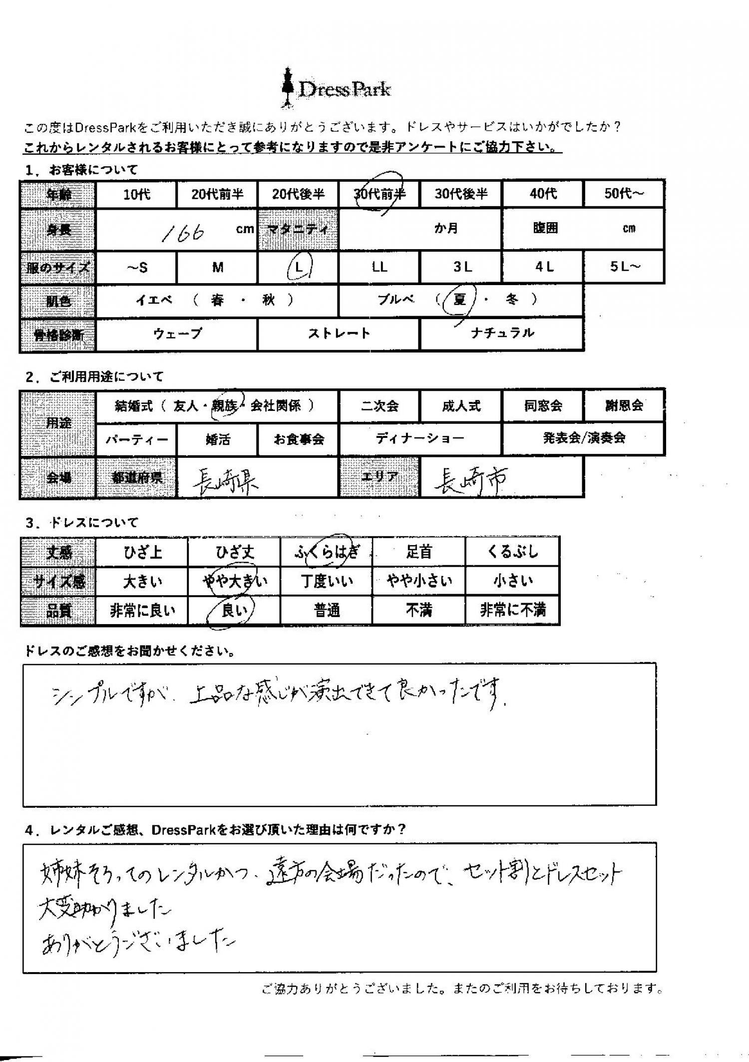 長崎県 Y.M様166㎝ Lサイズ #30代#M/L#165~169㎝#結婚式(親族)#長崎県 ◆レンタルしたドレスはこちら ◆レンタルしたサイズは:L ◆レンタルした日付:2025/11/02 ドレスの着用感 ◆点数: (4点) ◆丈感:ふくらはぎ ◆サイズ感:やや大きい ◆品質:良い ◆肌色:ブルべ ドレスの感想 シンプルですが、上品な感じが演出できてよかったです。 レンタルのご感想、DressParkをお選び頂いた理由 姉妹揃ってのレンタル、かつ遠方の会場だったので、セット割とドレスセット大変助かりました。ありがとうございました。 CUSTOMER REVIEWS お客様の声 気になるカテゴリー別にご利用の感想をチェック! ◆AGE 年代で見る 10代 20代 30代 40代 50代~ ◆SIZE サイズで見る SS/S M/L 大きいサイズLL~ ◆HIGHT 身長で見る 140~149㎝ 150~154㎝ 155~159㎝ 160~164㎝ 165~169㎝ 170㎝以上 ◆マタニティ ~3か月 4~6か月 7~8か月 9~10か月 ◆肌色 イエベ ブルべ ◆骨格診断 ウェーブ ストレート ナチュラル ◆利用シーン 結婚式(友人) 結婚式(親族) 結婚式(会社関係) 二次会 成人式 謝恩会 パーティー その他 CUSTOMER REVIEWS都道府県別お客様の声 都道府県別にのお客様の声をチェック! 北海道 青森県 岩手県 宮城県 秋田県 山形県 福島県 茨城県 栃木県 群馬県 埼玉県 千葉県 東京都 神奈川県 新潟県 富山県 石川県 福井県 山梨県 長野県 岐阜県 静岡県 愛知県 三重県 滋賀県 京都府 大阪府 兵庫県 奈良県 和歌山県 鳥取県 島根県 岡山県 広島県 山口県 徳島県 香川県 愛媛県 高知県 福岡県 佐賀県 長崎県 熊本県 大分県 宮崎県 鹿児島県 沖縄県 CUSTOMER REVIEWSエリア別お客様の声 都道府県別にのお客様の声をチェック! 札幌 仙台 名古屋 軽井沢 金沢 神戸・芦屋 博多 那覇 梅田・新大阪 難波・心斎橋 鎌倉・湘南 横浜・みなとみらい 舞浜・浦安・幕張 大宮・浦和 青山・表参道 六本木・麻布 渋谷・恵比寿 新宿 池袋 銀座・丸の内 お台場・汐留 鹿児島市 郡山市 福島市 東予 甲府・石和 LINEでお問い合わせ このサイトではJavaScriptを使用しています