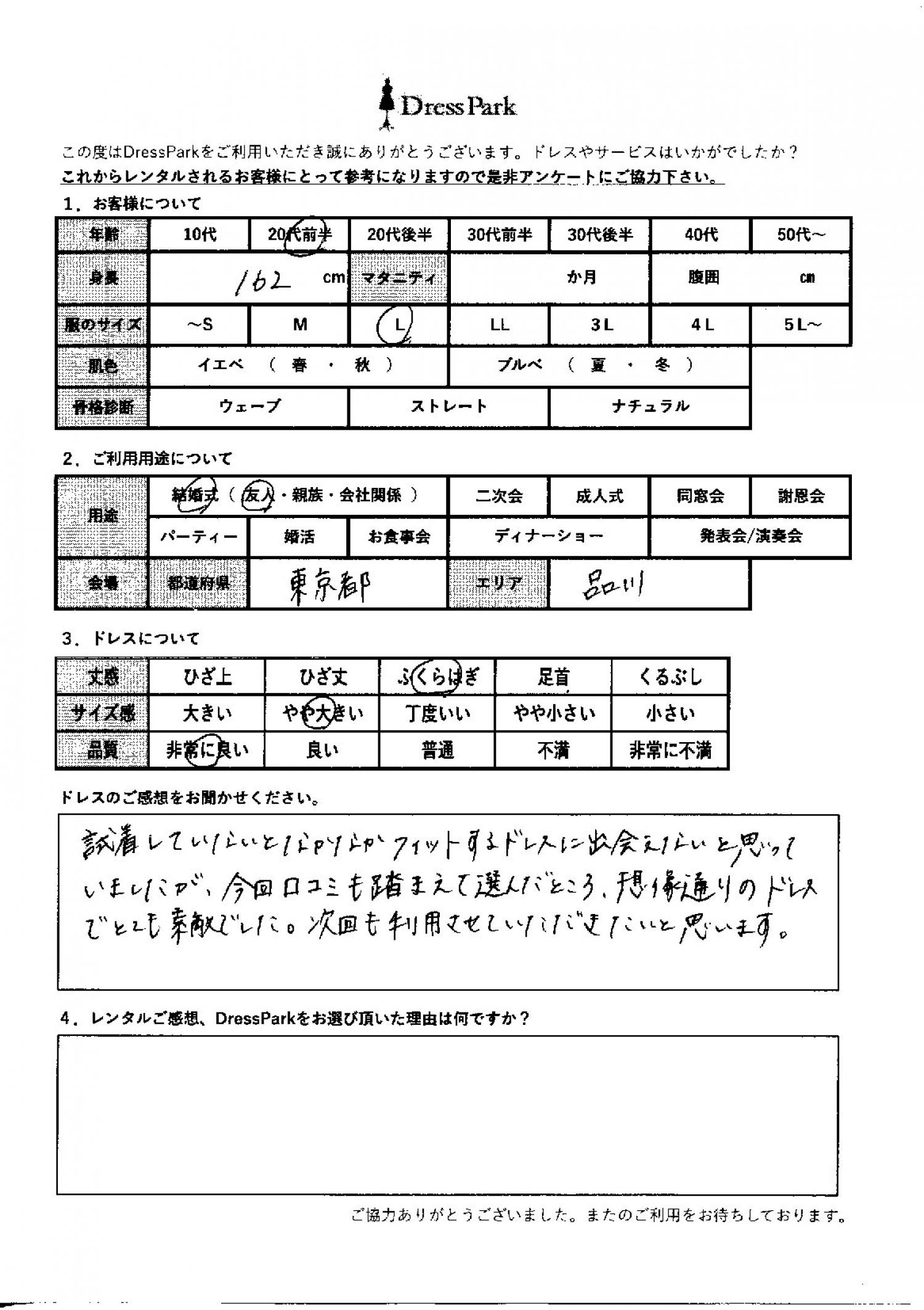 東京都 A.H様162㎝ Lサイズ #20代#M/L#160~164㎝#結婚式(友人)#東京都 ◆レンタルしたドレスはこちら ◆レンタルしたサイズは:L ◆レンタルした日付:2025/11/03 ドレスの着用感 ◆点数: (5点) ◆丈感:ふくらはぎ ◆サイズ感:やや大きい ◆品質:非常に良い ドレスの感想 試着していないとなかなかフィットするドレスに出会えないと思っていましたが、今回口コミも踏まえて選んだところ、想像通りのドレスでとても素敵でした。次回も利用させていただきたいと思います。 CUSTOMER REVIEWS お客様の声 気になるカテゴリー別にご利用の感想をチェック! ◆AGE 年代で見る 10代 20代 30代 40代 50代~ ◆SIZE サイズで見る SS/S M/L 大きいサイズLL~ ◆HIGHT 身長で見る 140~149㎝ 150~154㎝ 155~159㎝ 160~164㎝ 165~169㎝ 170㎝以上 ◆マタニティ ~3か月 4~6か月 7~8か月 9~10か月 ◆肌色 イエベ ブルべ ◆骨格診断 ウェーブ ストレート ナチュラル ◆利用シーン 結婚式(友人) 結婚式(親族) 結婚式(会社関係) 二次会 成人式 謝恩会 パーティー その他 CUSTOMER REVIEWS都道府県別お客様の声 都道府県別にのお客様の声をチェック! 北海道 青森県 岩手県 宮城県 秋田県 山形県 福島県 茨城県 栃木県 群馬県 埼玉県 千葉県 東京都 神奈川県 新潟県 富山県 石川県 福井県 山梨県 長野県 岐阜県 静岡県 愛知県 三重県 滋賀県 京都府 大阪府 兵庫県 奈良県 和歌山県 鳥取県 島根県 岡山県 広島県 山口県 徳島県 香川県 愛媛県 高知県 福岡県 佐賀県 長崎県 熊本県 大分県 宮崎県 鹿児島県 沖縄県 CUSTOMER REVIEWSエリア別お客様の声 都道府県別にのお客様の声をチェック! 札幌 仙台 名古屋 軽井沢 金沢 神戸・芦屋 博多 那覇 梅田・新大阪 難波・心斎橋 鎌倉・湘南 横浜・みなとみらい 舞浜・浦安・幕張 大宮・浦和 青山・表参道 六本木・麻布 渋谷・恵比寿 新宿 池袋 銀座・丸の内 お台場・汐留 鹿児島市 郡山市 福島市 東予 甲府・石和 LINEでお問い合わせ このサイトではJavaScriptを使用しています