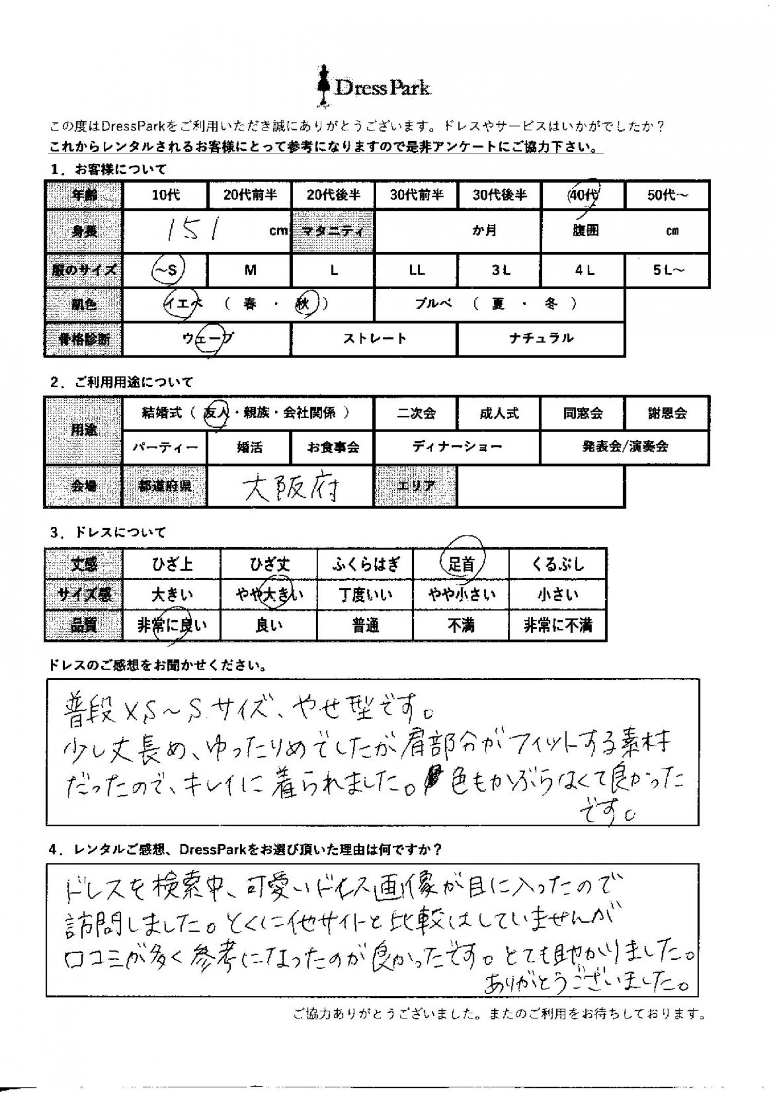 ドレスを検索中、かわいいドレス画像が目に入ったので訪問しました。特に他サイトと比較していませんが、口コミが多く参考になったのがよかったです。とても助かりました。ありがとうございました。