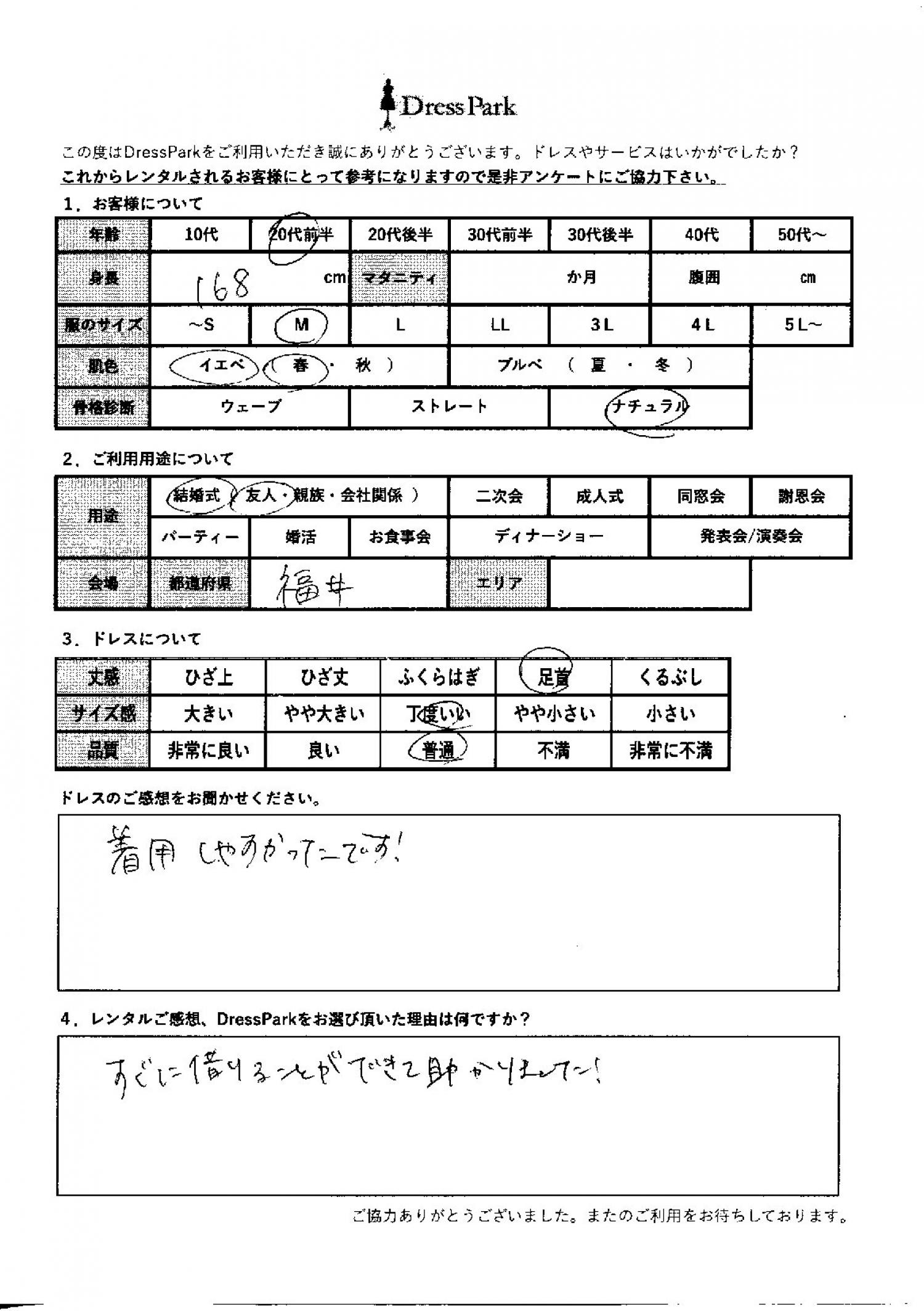 福井県 Y.O様168㎝ Mサイズ #20代#M/L#165~169㎝#結婚式(友人)#福井県 ◆レンタルしたドレスはこちら ◆レンタルしたサイズは:M ◆レンタルした日付:2025/11/03 ドレスの着用感 ◆点数: (4点) ◆丈感:足首 ◆サイズ感:丁度いい ◆品質:普通 ◆肌色:イエベ ◆骨格診断:ナチュラル ドレスの感想 着用しやすかったです! レンタルのご感想、DressParkをお選び頂いた理由 すぐに借りることができて助かりました! CUSTOMER REVIEWS お客様の声 気になるカテゴリー別にご利用の感想をチェック! ◆AGE 年代で見る 10代 20代 30代 40代 50代~ ◆SIZE サイズで見る SS/S M/L 大きいサイズLL~ ◆HIGHT 身長で見る 140~149㎝ 150~154㎝ 155~159㎝ 160~164㎝ 165~169㎝ 170㎝以上 ◆マタニティ ~3か月 4~6か月 7~8か月 9~10か月 ◆肌色 イエベ ブルべ ◆骨格診断 ウェーブ ストレート ナチュラル ◆利用シーン 結婚式(友人) 結婚式(親族) 結婚式(会社関係) 二次会 成人式 謝恩会 パーティー その他 CUSTOMER REVIEWS都道府県別お客様の声 都道府県別にのお客様の声をチェック! 北海道 青森県 岩手県 宮城県 秋田県 山形県 福島県 茨城県 栃木県 群馬県 埼玉県 千葉県 東京都 神奈川県 新潟県 富山県 石川県 福井県 山梨県 長野県 岐阜県 静岡県 愛知県 三重県 滋賀県 京都府 大阪府 兵庫県 奈良県 和歌山県 鳥取県 島根県 岡山県 広島県 山口県 徳島県 香川県 愛媛県 高知県 福岡県 佐賀県 長崎県 熊本県 大分県 宮崎県 鹿児島県 沖縄県 CUSTOMER REVIEWSエリア別お客様の声 都道府県別にのお客様の声をチェック! 札幌 仙台 名古屋 軽井沢 金沢 神戸・芦屋 博多 那覇 梅田・新大阪 難波・心斎橋 鎌倉・湘南 横浜・みなとみらい 舞浜・浦安・幕張 大宮・浦和 青山・表参道 六本木・麻布 渋谷・恵比寿 新宿 池袋 銀座・丸の内 お台場・汐留 鹿児島市 郡山市 福島市 東予 甲府・石和 LINEでお問い合わせ このサイトではJavaScriptを使用しています