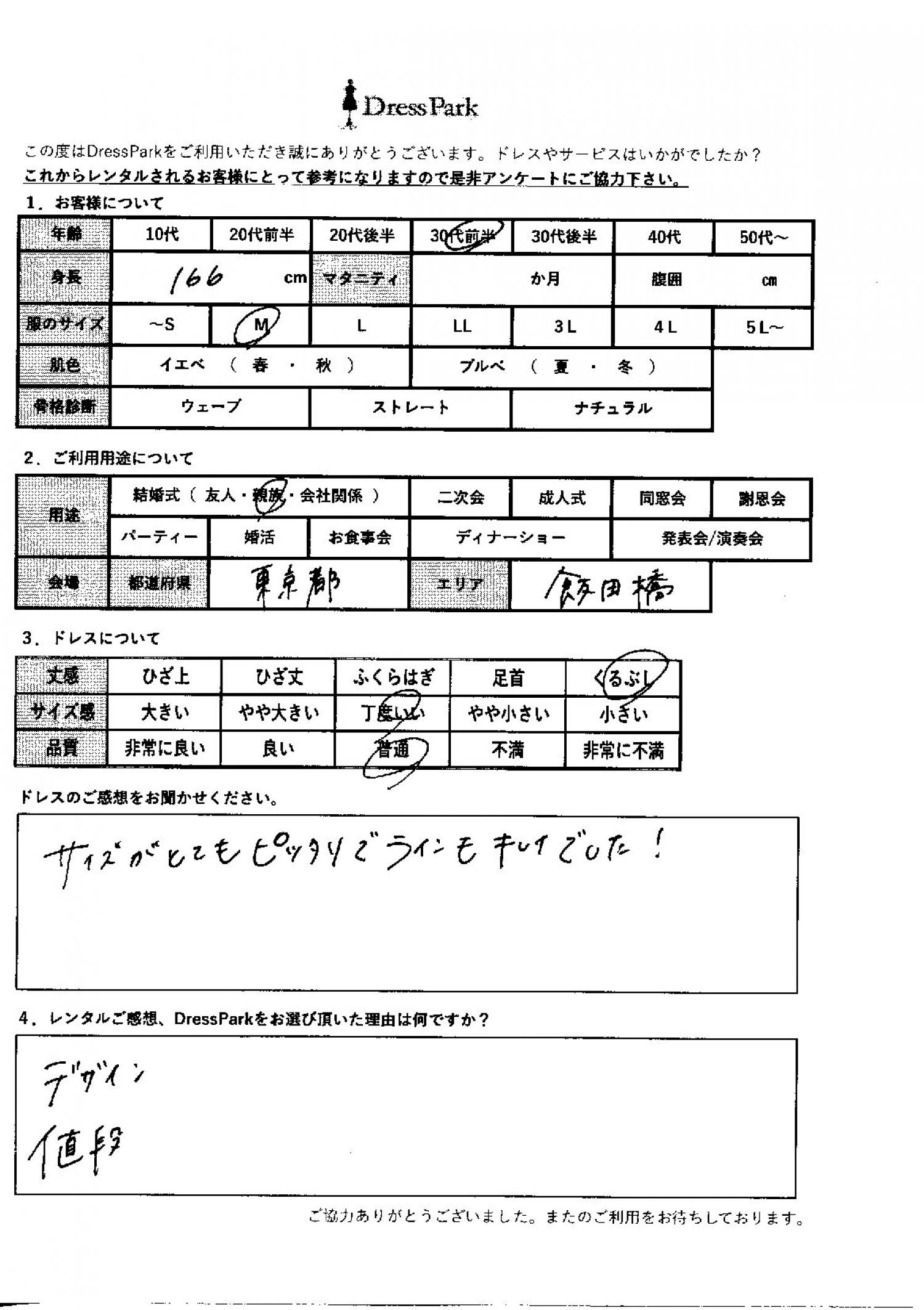 東京都 M.K様166㎝ Mサイズ #30代#M/L#165~169㎝#結婚式(親族)#東京都 ◆レンタルしたドレスはこちら ◆レンタルしたサイズは:M ◆レンタルした日付:2025/11/03 ドレスの着用感 ◆点数: (4点) ◆丈感:くるぶし ◆サイズ感:丁度いい ◆品質:普通 ドレスの感想 サイズがとてもぴったりで、ラインも綺麗でした! レンタルのご感想、DressParkをお選び頂いた理由 デザイン、値段 CUSTOMER REVIEWS お客様の声 気になるカテゴリー別にご利用の感想をチェック! ◆AGE 年代で見る 10代 20代 30代 40代 50代~ ◆SIZE サイズで見る SS/S M/L 大きいサイズLL~ ◆HIGHT 身長で見る 140~149㎝ 150~154㎝ 155~159㎝ 160~164㎝ 165~169㎝ 170㎝以上 ◆マタニティ ~3か月 4~6か月 7~8か月 9~10か月 ◆肌色 イエベ ブルべ ◆骨格診断 ウェーブ ストレート ナチュラル ◆利用シーン 結婚式(友人) 結婚式(親族) 結婚式(会社関係) 二次会 成人式 謝恩会 パーティー その他 CUSTOMER REVIEWS都道府県別お客様の声 都道府県別にのお客様の声をチェック! 北海道 青森県 岩手県 宮城県 秋田県 山形県 福島県 茨城県 栃木県 群馬県 埼玉県 千葉県 東京都 神奈川県 新潟県 富山県 石川県 福井県 山梨県 長野県 岐阜県 静岡県 愛知県 三重県 滋賀県 京都府 大阪府 兵庫県 奈良県 和歌山県 鳥取県 島根県 岡山県 広島県 山口県 徳島県 香川県 愛媛県 高知県 福岡県 佐賀県 長崎県 熊本県 大分県 宮崎県 鹿児島県 沖縄県 CUSTOMER REVIEWSエリア別お客様の声 都道府県別にのお客様の声をチェック! 札幌 仙台 名古屋 軽井沢 金沢 神戸・芦屋 博多 那覇 梅田・新大阪 難波・心斎橋 鎌倉・湘南 横浜・みなとみらい 舞浜・浦安・幕張 大宮・浦和 青山・表参道 六本木・麻布 渋谷・恵比寿 新宿 池袋 銀座・丸の内 お台場・汐留 鹿児島市 郡山市 福島市 東予 甲府・石和 LINEでお問い合わせ このサイトではJavaScriptを使用しています