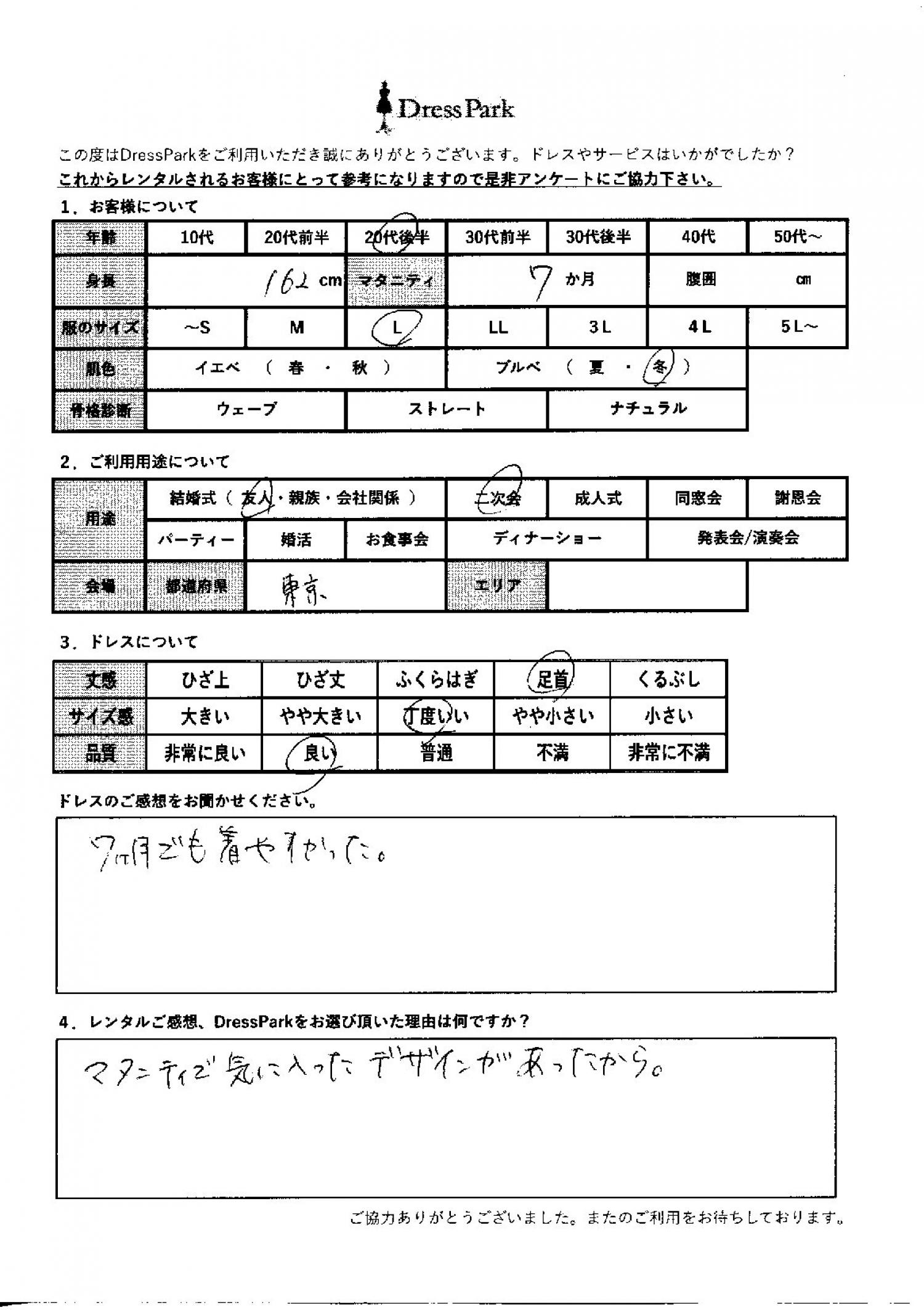 東京都 K.I様162㎝ Lサイズ マタニティ #20代#M/L#160~164㎝#結婚式(友人)#東京都 ◆レンタルしたドレスはこちら ◆レンタルしたサイズは:M ◆レンタルした日付:2025/11/03 ドレスの着用感 ◆点数: (4点) ◆丈感:足首 ◆サイズ感:丁度いい ◆品質:良い ◆マタニティ: ◆肌色:ブルべ ドレスの感想 7ヶ月でも着やすかった。 レンタルのご感想、DressParkをお選び頂いた理由 マタニティーで気に入ったデザインがあったから。 CUSTOMER REVIEWS お客様の声 気になるカテゴリー別にご利用の感想をチェック! ◆AGE 年代で見る 10代 20代 30代 40代 50代~ ◆SIZE サイズで見る SS/S M/L 大きいサイズLL~ ◆HIGHT 身長で見る 140~149㎝ 150~154㎝ 155~159㎝ 160~164㎝ 165~169㎝ 170㎝以上 ◆マタニティ ~3か月 4~6か月 7~8か月 9~10か月 ◆肌色 イエベ ブルべ ◆骨格診断 ウェーブ ストレート ナチュラル ◆利用シーン 結婚式(友人) 結婚式(親族) 結婚式(会社関係) 二次会 成人式 謝恩会 パーティー その他 CUSTOMER REVIEWS都道府県別お客様の声 都道府県別にのお客様の声をチェック! 北海道 青森県 岩手県 宮城県 秋田県 山形県 福島県 茨城県 栃木県 群馬県 埼玉県 千葉県 東京都 神奈川県 新潟県 富山県 石川県 福井県 山梨県 長野県 岐阜県 静岡県 愛知県 三重県 滋賀県 京都府 大阪府 兵庫県 奈良県 和歌山県 鳥取県 島根県 岡山県 広島県 山口県 徳島県 香川県 愛媛県 高知県 福岡県 佐賀県 長崎県 熊本県 大分県 宮崎県 鹿児島県 沖縄県 CUSTOMER REVIEWSエリア別お客様の声 都道府県別にのお客様の声をチェック! 札幌 仙台 名古屋 軽井沢 金沢 神戸・芦屋 博多 那覇 梅田・新大阪 難波・心斎橋 鎌倉・湘南 横浜・みなとみらい 舞浜・浦安・幕張 大宮・浦和 青山・表参道 六本木・麻布 渋谷・恵比寿 新宿 池袋 銀座・丸の内 お台場・汐留 鹿児島市 郡山市 福島市 東予 甲府・石和 LINEでお問い合わせ このサイトではJavaScriptを使用しています