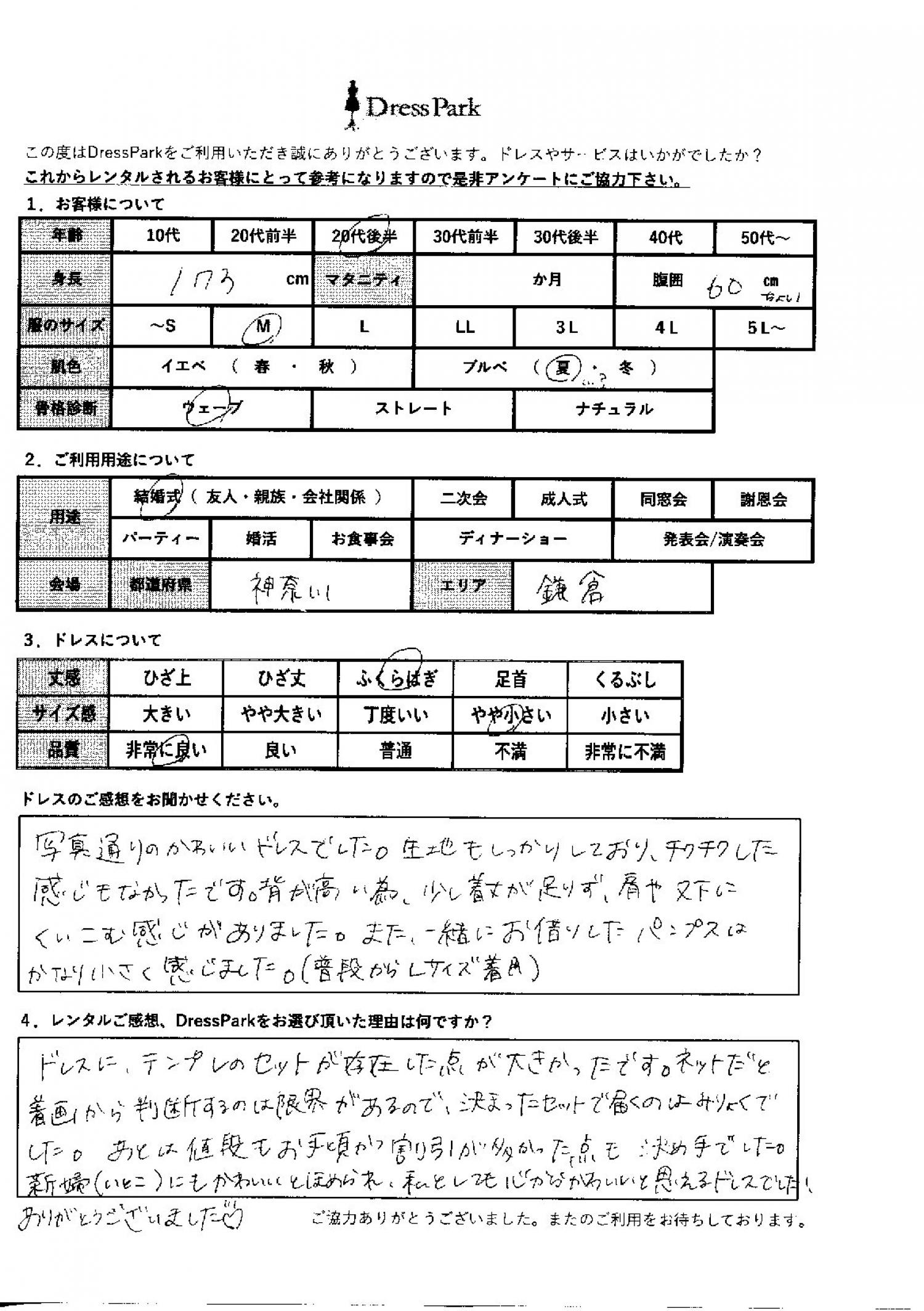 写真通りのかわいいドレスでした。生地もしっかりしており、チクチクした感じもなかったです。背が高いため、少し着丈が足りず、肩や股下に食い込む感じがありました。また一緒にお借りしたパンプスはかなり小さく感じました。(普段からLサイズ着用)【スタッフより】