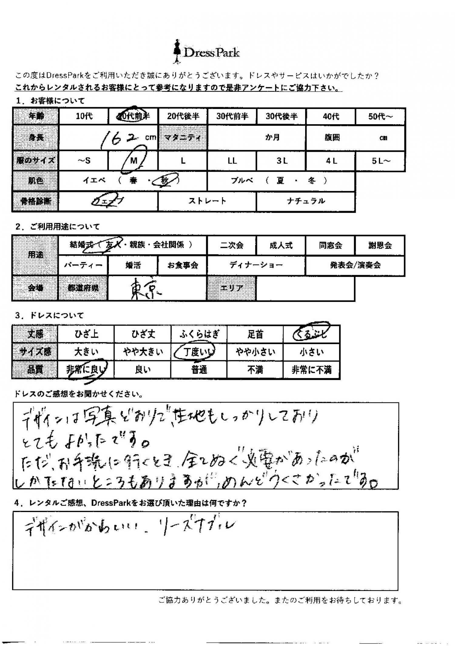 東京都 K.N様162㎝ Mサイズ #20代#M/L#160~164㎝#結婚式(友人)#東京都 ◆レンタルしたドレスはこちら ◆レンタルしたサイズは:M ◆レンタルした日付:2025/11/08 ドレスの着用感 ◆点数: (5点) ◆丈感:くるぶし ◆サイズ感:丁度いい ◆品質:非常に良い ◆肌色:イエベ ◆骨格診断:ウェーブ ドレスの感想 デザインは写真通りで、生地もしっかりしておりとても良かったです。ただ、お手洗いに行く時、全て脱ぐ必要があったのが仕方がないところもありますが、めんどくさかったです。 レンタルのご感想、DressParkをお選び頂いた理由 デザインがかわいい、リーズナブル CUSTOMER REVIEWS お客様の声 気になるカテゴリー別にご利用の感想をチェック! ◆AGE 年代で見る 10代 20代 30代 40代 50代~ ◆SIZE サイズで見る SS/S M/L 大きいサイズLL~ ◆HIGHT 身長で見る 140~149㎝ 150~154㎝ 155~159㎝ 160~164㎝ 165~169㎝ 170㎝以上 ◆マタニティ ~3か月 4~6か月 7~8か月 9~10か月 ◆肌色 イエベ ブルべ ◆骨格診断 ウェーブ ストレート ナチュラル ◆利用シーン 結婚式(友人) 結婚式(親族) 結婚式(会社関係) 二次会 成人式 謝恩会 パーティー その他 CUSTOMER REVIEWS都道府県別お客様の声 都道府県別にのお客様の声をチェック! 北海道 青森県 岩手県 宮城県 秋田県 山形県 福島県 茨城県 栃木県 群馬県 埼玉県 千葉県 東京都 神奈川県 新潟県 富山県 石川県 福井県 山梨県 長野県 岐阜県 静岡県 愛知県 三重県 滋賀県 京都府 大阪府 兵庫県 奈良県 和歌山県 鳥取県 島根県 岡山県 広島県 山口県 徳島県 香川県 愛媛県 高知県 福岡県 佐賀県 長崎県 熊本県 大分県 宮崎県 鹿児島県 沖縄県 CUSTOMER REVIEWSエリア別お客様の声 都道府県別にのお客様の声をチェック! 札幌 仙台 名古屋 軽井沢 金沢 神戸・芦屋 博多 那覇 梅田・新大阪 難波・心斎橋 鎌倉・湘南 横浜・みなとみらい 舞浜・浦安・幕張 大宮・浦和 青山・表参道 六本木・麻布 渋谷・恵比寿 新宿 池袋 銀座・丸の内 お台場・汐留 鹿児島市 郡山市 福島市 東予 甲府・石和 LINEでお問い合わせ このサイトではJavaScriptを使用しています