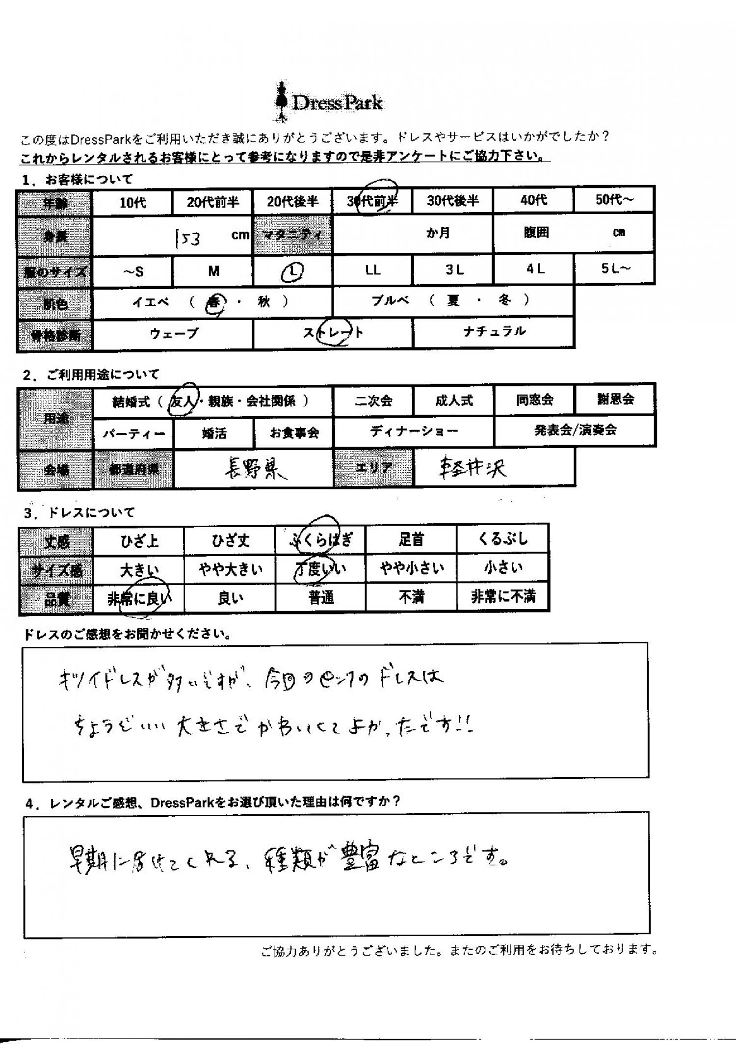 長野県 R.M様153㎝ Lサイズ軽井沢 #30代#M/L#150~154㎝#結婚式(友人)#長野県#軽井沢 ◆レンタルしたドレスはこちら ◆レンタルしたサイズは:LL ◆レンタルした日付:2025/11/08 ドレスの着用感 ◆点数: (5点) ◆丈感:ふくらはぎ ◆サイズ感:丁度いい ◆品質:非常に良い ◆肌色:イエベ ◆骨格診断:ストレート ドレスの感想 きついドレスが多いですが、今回のピンクのドレスはちょうどいい大きさで可愛くてよかったです! レンタルのご感想、DressParkをお選び頂いた理由 早期に届けてくれる、種類が豊富なところです。 CUSTOMER REVIEWS お客様の声 気になるカテゴリー別にご利用の感想をチェック! ◆AGE 年代で見る 10代 20代 30代 40代 50代~ ◆SIZE サイズで見る SS/S M/L 大きいサイズLL~ ◆HIGHT 身長で見る 140~149㎝ 150~154㎝ 155~159㎝ 160~164㎝ 165~169㎝ 170㎝以上 ◆マタニティ ~3か月 4~6か月 7~8か月 9~10か月 ◆肌色 イエベ ブルべ ◆骨格診断 ウェーブ ストレート ナチュラル ◆利用シーン 結婚式(友人) 結婚式(親族) 結婚式(会社関係) 二次会 成人式 謝恩会 パーティー その他 CUSTOMER REVIEWS都道府県別お客様の声 都道府県別にのお客様の声をチェック! 北海道 青森県 岩手県 宮城県 秋田県 山形県 福島県 茨城県 栃木県 群馬県 埼玉県 千葉県 東京都 神奈川県 新潟県 富山県 石川県 福井県 山梨県 長野県 岐阜県 静岡県 愛知県 三重県 滋賀県 京都府 大阪府 兵庫県 奈良県 和歌山県 鳥取県 島根県 岡山県 広島県 山口県 徳島県 香川県 愛媛県 高知県 福岡県 佐賀県 長崎県 熊本県 大分県 宮崎県 鹿児島県 沖縄県 CUSTOMER REVIEWSエリア別お客様の声 都道府県別にのお客様の声をチェック! 札幌 仙台 名古屋 軽井沢 金沢 神戸・芦屋 博多 那覇 梅田・新大阪 難波・心斎橋 鎌倉・湘南 横浜・みなとみらい 舞浜・浦安・幕張 大宮・浦和 青山・表参道 六本木・麻布 渋谷・恵比寿 新宿 池袋 銀座・丸の内 お台場・汐留 鹿児島市 郡山市 福島市 東予 甲府・石和 LINEでお問い合わせ このサイトではJavaScriptを使用しています