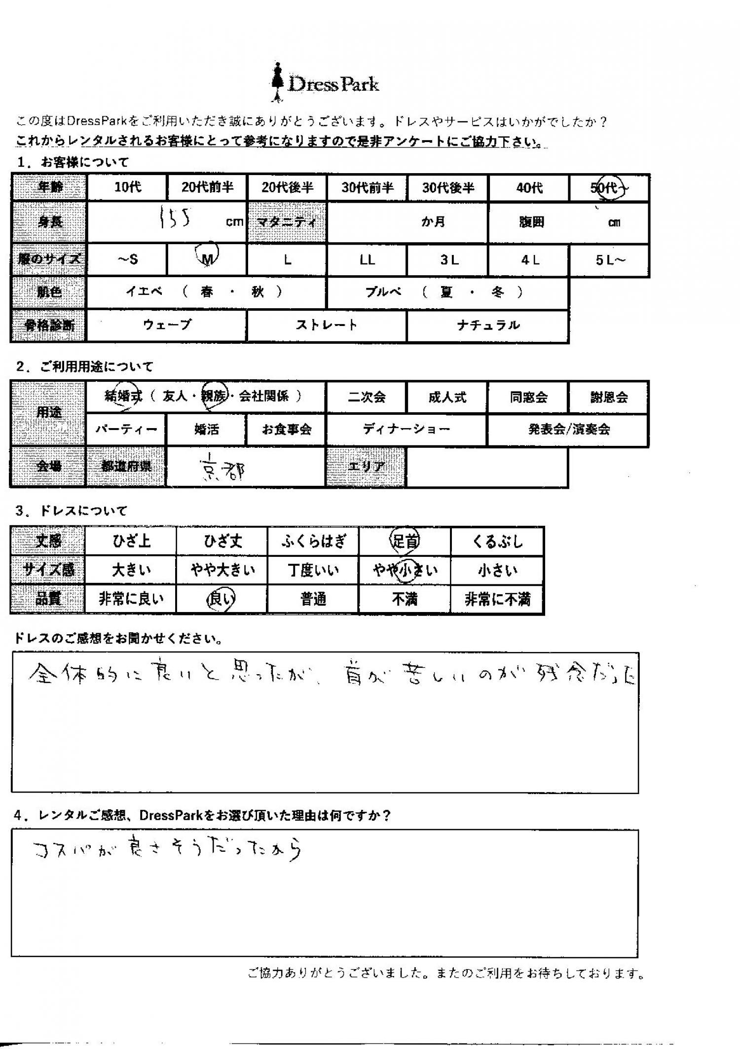 京都府 M.M様155㎝ Mサイズ #50代~#M/L#155~159㎝#結婚式(親族)#京都府 ◆レンタルしたドレスはこちら ◆レンタルしたサイズは:M ◆レンタルした日付:2025/11/08 ドレスの着用感 ◆点数: (4点) ◆丈感:足首 ◆サイズ感:やや小さい ◆品質:良い ドレスの感想 全体的に良いと思ったが、首が苦しいのが残念だった。 レンタルのご感想、DressParkをお選び頂いた理由 コスパが良さそうだったから。 CUSTOMER REVIEWS お客様の声 気になるカテゴリー別にご利用の感想をチェック! ◆AGE 年代で見る 10代 20代 30代 40代 50代~ ◆SIZE サイズで見る SS/S M/L 大きいサイズLL~ ◆HIGHT 身長で見る 140~149㎝ 150~154㎝ 155~159㎝ 160~164㎝ 165~169㎝ 170㎝以上 ◆マタニティ ~3か月 4~6か月 7~8か月 9~10か月 ◆肌色 イエベ ブルべ ◆骨格診断 ウェーブ ストレート ナチュラル ◆利用シーン 結婚式(友人) 結婚式(親族) 結婚式(会社関係) 二次会 成人式 謝恩会 パーティー その他 CUSTOMER REVIEWS都道府県別お客様の声 都道府県別にのお客様の声をチェック! 北海道 青森県 岩手県 宮城県 秋田県 山形県 福島県 茨城県 栃木県 群馬県 埼玉県 千葉県 東京都 神奈川県 新潟県 富山県 石川県 福井県 山梨県 長野県 岐阜県 静岡県 愛知県 三重県 滋賀県 京都府 大阪府 兵庫県 奈良県 和歌山県 鳥取県 島根県 岡山県 広島県 山口県 徳島県 香川県 愛媛県 高知県 福岡県 佐賀県 長崎県 熊本県 大分県 宮崎県 鹿児島県 沖縄県 CUSTOMER REVIEWSエリア別お客様の声 都道府県別にのお客様の声をチェック! 札幌 仙台 名古屋 軽井沢 金沢 神戸・芦屋 博多 那覇 梅田・新大阪 難波・心斎橋 鎌倉・湘南 横浜・みなとみらい 舞浜・浦安・幕張 大宮・浦和 青山・表参道 六本木・麻布 渋谷・恵比寿 新宿 池袋 銀座・丸の内 お台場・汐留 鹿児島市 郡山市 福島市 東予 甲府・石和 LINEでお問い合わせ このサイトではJavaScriptを使用しています