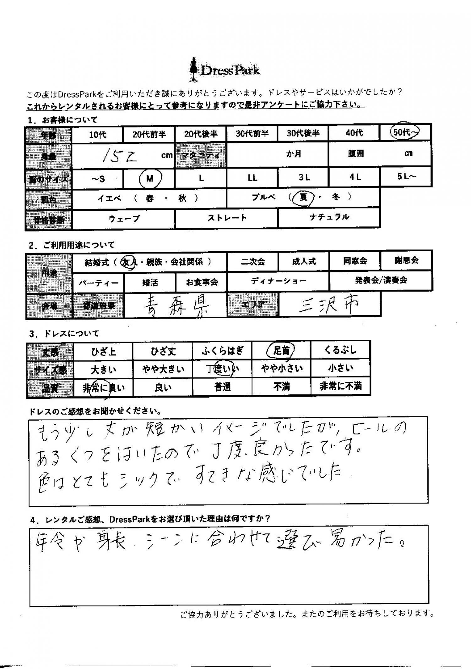 青森県 S.I様152㎝ Mサイズ #50代~#M/L#150~154㎝#結婚式(友人)#青森県 ◆レンタルしたドレスはこちら ◆レンタルしたサイズは:M ◆レンタルした日付:2025/11/09 ドレスの着用感 ◆点数: (5点) ◆丈感:足首 ◆サイズ感:丁度いい ◆品質:非常に良い ◆肌色:ブルべ ドレスの感想 もう少し丈が短いイメージでしたが、ヒールのある靴を履いたので、ちょうど良かったです。色はとてもシックで素敵な感じでした。 レンタルのご感想、DressParkをお選び頂いた理由 年齢や身長、シーンに合わせて選びやすかった。 CUSTOMER REVIEWS お客様の声 気になるカテゴリー別にご利用の感想をチェック! ◆AGE 年代で見る 10代 20代 30代 40代 50代~ ◆SIZE サイズで見る SS/S M/L 大きいサイズLL~ ◆HIGHT 身長で見る 140~149㎝ 150~154㎝ 155~159㎝ 160~164㎝ 165~169㎝ 170㎝以上 ◆マタニティ ~3か月 4~6か月 7~8か月 9~10か月 ◆肌色 イエベ ブルべ ◆骨格診断 ウェーブ ストレート ナチュラル ◆利用シーン 結婚式(友人) 結婚式(親族) 結婚式(会社関係) 二次会 成人式 謝恩会 パーティー その他 CUSTOMER REVIEWS都道府県別お客様の声 都道府県別にのお客様の声をチェック! 北海道 青森県 岩手県 宮城県 秋田県 山形県 福島県 茨城県 栃木県 群馬県 埼玉県 千葉県 東京都 神奈川県 新潟県 富山県 石川県 福井県 山梨県 長野県 岐阜県 静岡県 愛知県 三重県 滋賀県 京都府 大阪府 兵庫県 奈良県 和歌山県 鳥取県 島根県 岡山県 広島県 山口県 徳島県 香川県 愛媛県 高知県 福岡県 佐賀県 長崎県 熊本県 大分県 宮崎県 鹿児島県 沖縄県 CUSTOMER REVIEWSエリア別お客様の声 都道府県別にのお客様の声をチェック! 札幌 仙台 名古屋 軽井沢 金沢 神戸・芦屋 博多 那覇 梅田・新大阪 難波・心斎橋 鎌倉・湘南 横浜・みなとみらい 舞浜・浦安・幕張 大宮・浦和 青山・表参道 六本木・麻布 渋谷・恵比寿 新宿 池袋 銀座・丸の内 お台場・汐留 鹿児島市 郡山市 福島市 東予 甲府・石和 LINEでお問い合わせ このサイトではJavaScriptを使用しています