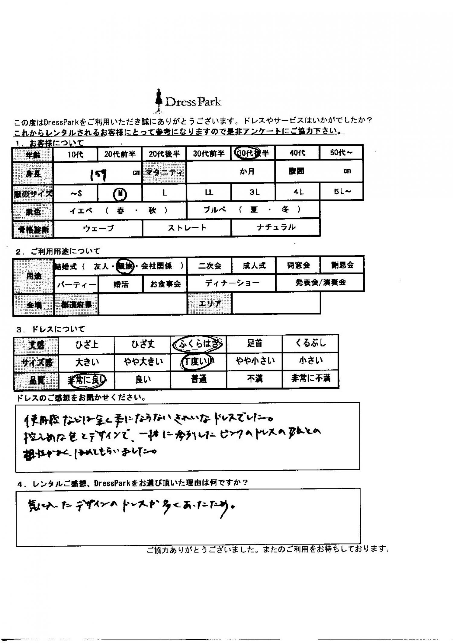 東京都 M.N様159㎝ Mサイズ #30代#M/L#155~159㎝#結婚式(親族)#東京都 ◆レンタルしたドレスはこちら ◆レンタルしたサイズは:M ◆レンタルした日付:2025/11/08 ドレスの着用感 ◆点数: (5点) ◆丈感:ふくらはぎ ◆サイズ感:丁度いい ◆品質:非常に良い ドレスの感想 使用感などは全く気にならない綺麗なドレスでした。控えめな色とデザインで、一緒に参列したピンクのドレスの娘との相性が良く、褒めてもらいました。 レンタルのご感想、DressParkをお選び頂いた理由 気に入ったデザインのドレスが多くあったため。 CUSTOMER REVIEWS お客様の声 気になるカテゴリー別にご利用の感想をチェック! ◆AGE 年代で見る 10代 20代 30代 40代 50代~ ◆SIZE サイズで見る SS/S M/L 大きいサイズLL~ ◆HIGHT 身長で見る 140~149㎝ 150~154㎝ 155~159㎝ 160~164㎝ 165~169㎝ 170㎝以上 ◆マタニティ ~3か月 4~6か月 7~8か月 9~10か月 ◆肌色 イエベ ブルべ ◆骨格診断 ウェーブ ストレート ナチュラル ◆利用シーン 結婚式(友人) 結婚式(親族) 結婚式(会社関係) 二次会 成人式 謝恩会 パーティー その他 CUSTOMER REVIEWS都道府県別お客様の声 都道府県別にのお客様の声をチェック! 北海道 青森県 岩手県 宮城県 秋田県 山形県 福島県 茨城県 栃木県 群馬県 埼玉県 千葉県 東京都 神奈川県 新潟県 富山県 石川県 福井県 山梨県 長野県 岐阜県 静岡県 愛知県 三重県 滋賀県 京都府 大阪府 兵庫県 奈良県 和歌山県 鳥取県 島根県 岡山県 広島県 山口県 徳島県 香川県 愛媛県 高知県 福岡県 佐賀県 長崎県 熊本県 大分県 宮崎県 鹿児島県 沖縄県 CUSTOMER REVIEWSエリア別お客様の声 都道府県別にのお客様の声をチェック! 札幌 仙台 名古屋 軽井沢 金沢 神戸・芦屋 博多 那覇 梅田・新大阪 難波・心斎橋 鎌倉・湘南 横浜・みなとみらい 舞浜・浦安・幕張 大宮・浦和 青山・表参道 六本木・麻布 渋谷・恵比寿 新宿 池袋 銀座・丸の内 お台場・汐留 鹿児島市 郡山市 福島市 東予 甲府・石和 LINEでお問い合わせ このサイトではJavaScriptを使用しています