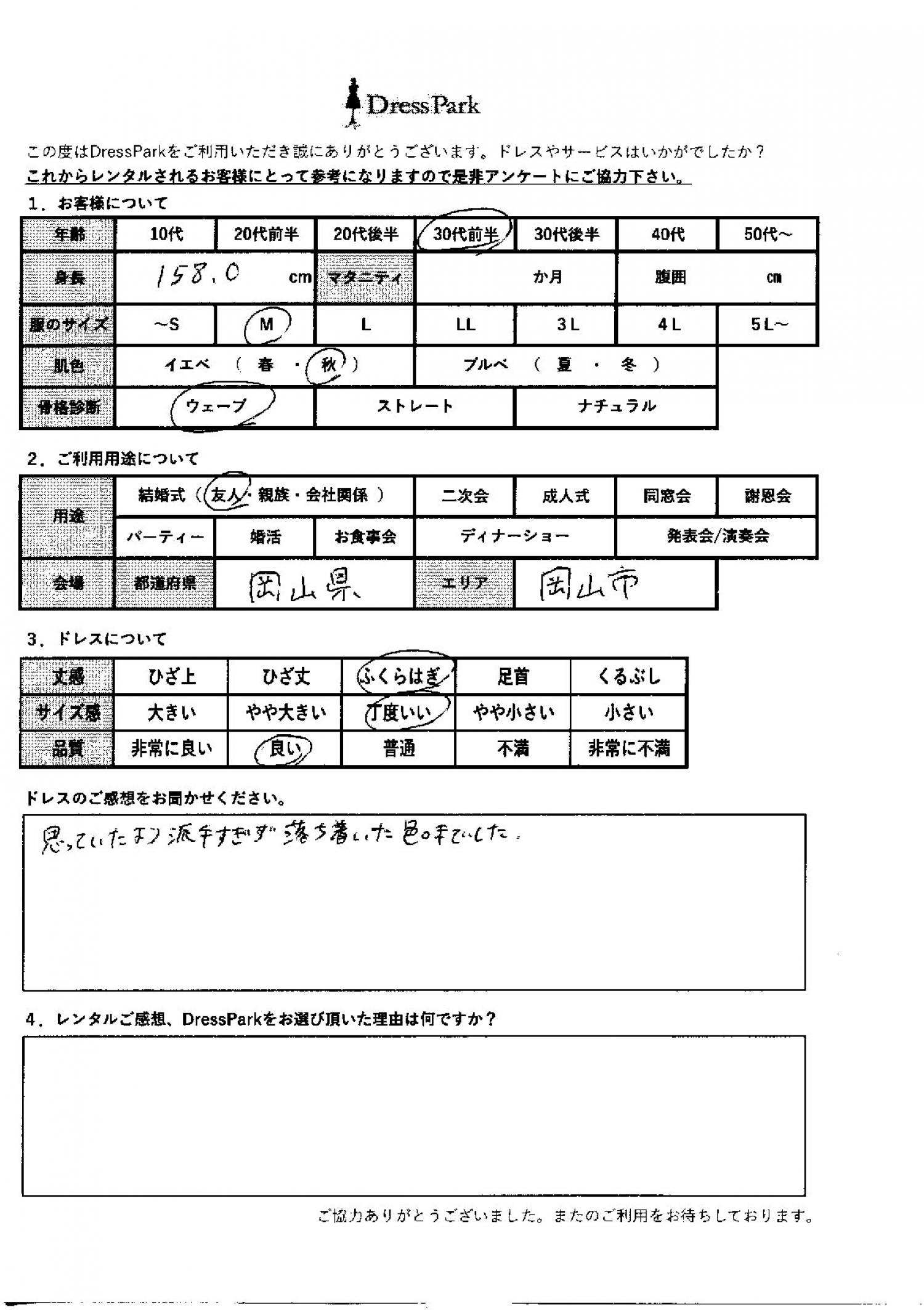 岡山県 M.Y様158㎝ Mサイズ #30代#M/L#155~159㎝#結婚式(友人)#岡山県 ◆レンタルしたドレスはこちら ◆レンタルしたサイズは:M ◆レンタルした日付:2025/11/08 ドレスの着用感 ◆点数: (4点) ◆丈感:ふくらはぎ ◆サイズ感:丁度いい ◆品質:良い ◆肌色:イエベ ◆骨格診断:ウェーブ ドレスの感想 思っていたより、派手すぎず、落ち着いた色味でした。 CUSTOMER REVIEWS お客様の声 気になるカテゴリー別にご利用の感想をチェック! ◆AGE 年代で見る 10代 20代 30代 40代 50代~ ◆SIZE サイズで見る SS/S M/L 大きいサイズLL~ ◆HIGHT 身長で見る 140~149㎝ 150~154㎝ 155~159㎝ 160~164㎝ 165~169㎝ 170㎝以上 ◆マタニティ ~3か月 4~6か月 7~8か月 9~10か月 ◆肌色 イエベ ブルべ ◆骨格診断 ウェーブ ストレート ナチュラル ◆利用シーン 結婚式(友人) 結婚式(親族) 結婚式(会社関係) 二次会 成人式 謝恩会 パーティー その他 CUSTOMER REVIEWS都道府県別お客様の声 都道府県別にのお客様の声をチェック! 北海道 青森県 岩手県 宮城県 秋田県 山形県 福島県 茨城県 栃木県 群馬県 埼玉県 千葉県 東京都 神奈川県 新潟県 富山県 石川県 福井県 山梨県 長野県 岐阜県 静岡県 愛知県 三重県 滋賀県 京都府 大阪府 兵庫県 奈良県 和歌山県 鳥取県 島根県 岡山県 広島県 山口県 徳島県 香川県 愛媛県 高知県 福岡県 佐賀県 長崎県 熊本県 大分県 宮崎県 鹿児島県 沖縄県 CUSTOMER REVIEWSエリア別お客様の声 都道府県別にのお客様の声をチェック! 札幌 仙台 名古屋 軽井沢 金沢 神戸・芦屋 博多 那覇 梅田・新大阪 難波・心斎橋 鎌倉・湘南 横浜・みなとみらい 舞浜・浦安・幕張 大宮・浦和 青山・表参道 六本木・麻布 渋谷・恵比寿 新宿 池袋 銀座・丸の内 お台場・汐留 鹿児島市 郡山市 福島市 東予 甲府・石和 LINEでお問い合わせ このサイトではJavaScriptを使用しています