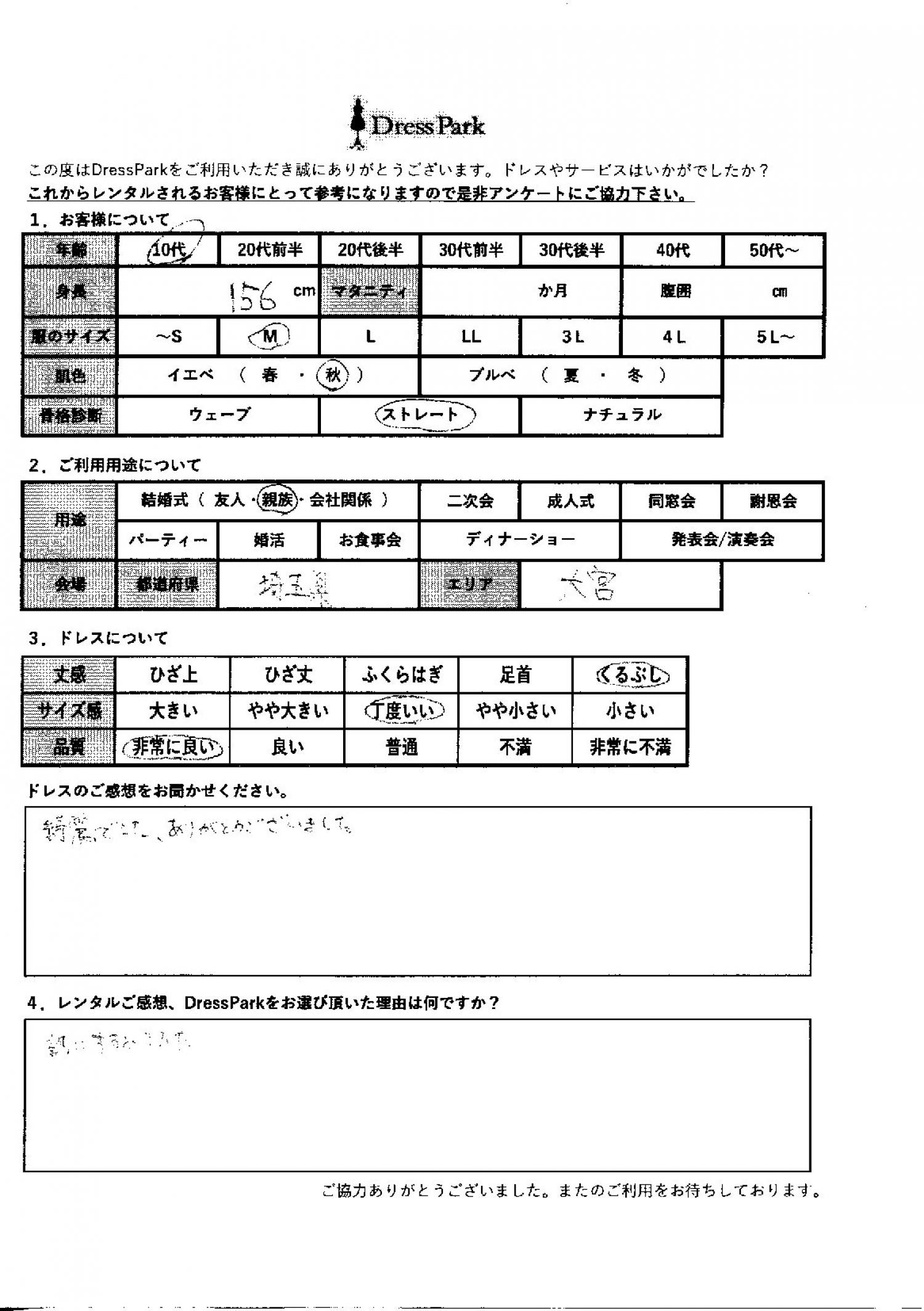 埼玉県 A.N様156㎝ Mサイズ大宮・浦和 #10代#M/L#155~159㎝#結婚式(親族)#埼玉県#大宮・浦和 ◆レンタルしたドレスはこちら ◆レンタルしたサイズは:S ◆レンタルした日付:2025/11/09 ドレスの着用感 ◆点数: (5点) ◆丈感:くるぶし ◆サイズ感:丁度いい ◆品質:非常に良い ◆肌色:イエベ ◆骨格診断:ストレート ドレスの感想 きれいでした。ありがとうございました。 レンタルのご感想、DressParkをお選び頂いた理由 親に勧められた。 CUSTOMER REVIEWS お客様の声 気になるカテゴリー別にご利用の感想をチェック! ◆AGE 年代で見る 10代 20代 30代 40代 50代~ ◆SIZE サイズで見る SS/S M/L 大きいサイズLL~ ◆HIGHT 身長で見る 140~149㎝ 150~154㎝ 155~159㎝ 160~164㎝ 165~169㎝ 170㎝以上 ◆マタニティ ~3か月 4~6か月 7~8か月 9~10か月 ◆肌色 イエベ ブルべ ◆骨格診断 ウェーブ ストレート ナチュラル ◆利用シーン 結婚式(友人) 結婚式(親族) 結婚式(会社関係) 二次会 成人式 謝恩会 パーティー その他 CUSTOMER REVIEWS都道府県別お客様の声 都道府県別にのお客様の声をチェック! 北海道 青森県 岩手県 宮城県 秋田県 山形県 福島県 茨城県 栃木県 群馬県 埼玉県 千葉県 東京都 神奈川県 新潟県 富山県 石川県 福井県 山梨県 長野県 岐阜県 静岡県 愛知県 三重県 滋賀県 京都府 大阪府 兵庫県 奈良県 和歌山県 鳥取県 島根県 岡山県 広島県 山口県 徳島県 香川県 愛媛県 高知県 福岡県 佐賀県 長崎県 熊本県 大分県 宮崎県 鹿児島県 沖縄県 CUSTOMER REVIEWSエリア別お客様の声 都道府県別にのお客様の声をチェック! 札幌 仙台 名古屋 軽井沢 金沢 神戸・芦屋 博多 那覇 梅田・新大阪 難波・心斎橋 鎌倉・湘南 横浜・みなとみらい 舞浜・浦安・幕張 大宮・浦和 青山・表参道 六本木・麻布 渋谷・恵比寿 新宿 池袋 銀座・丸の内 お台場・汐留 鹿児島市 郡山市 福島市 東予 甲府・石和 LINEでお問い合わせ このサイトではJavaScriptを使用しています