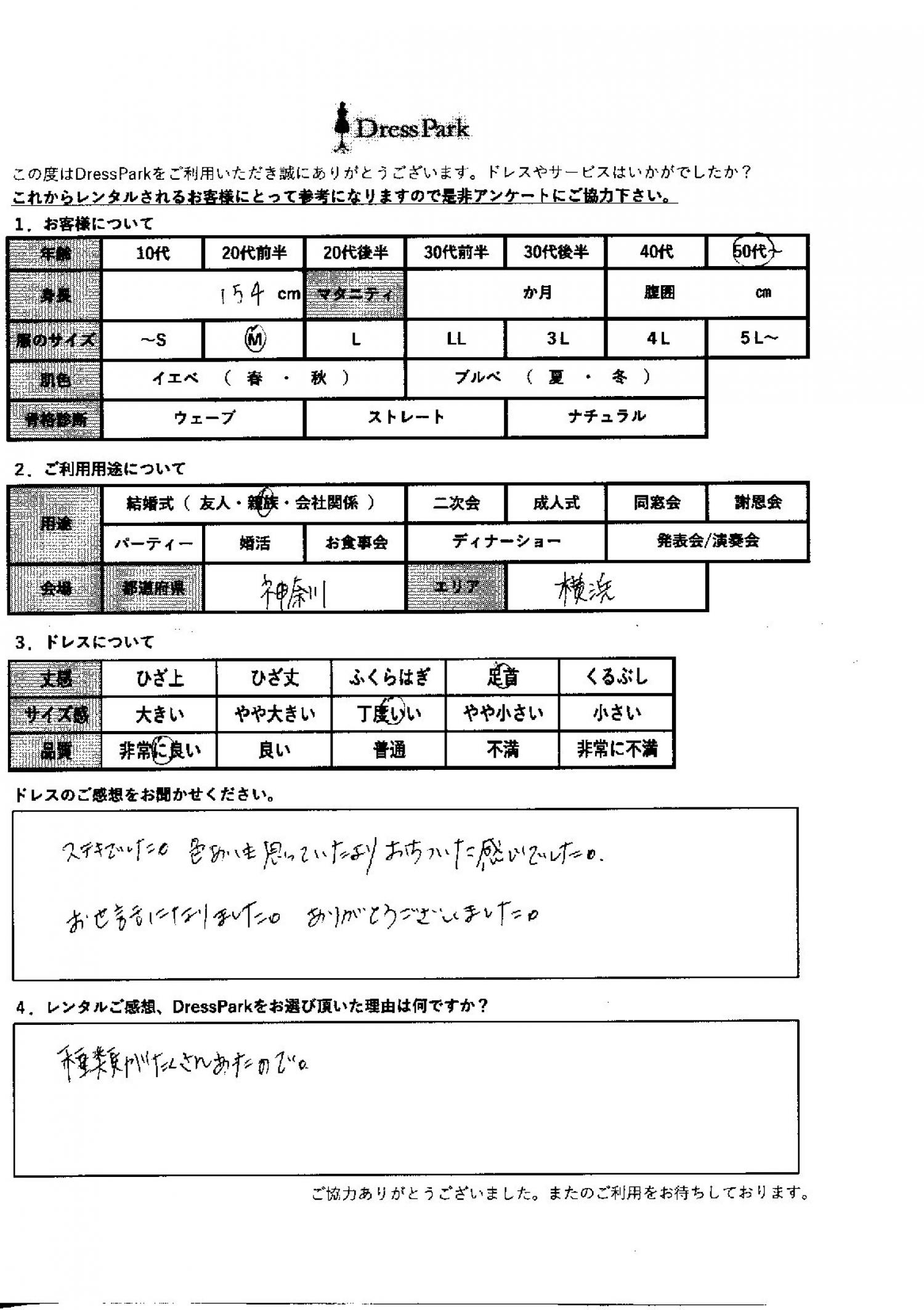神奈川県 K.S様154㎝ Mサイズ横浜・みなとみらい #50代~#M/L#150~154㎝#結婚式(親族)#神奈川県#横浜・みなとみらい ◆レンタルしたドレスはこちら ◆レンタルしたサイズは:M ◆レンタルした日付:2025/11/09 ドレスの着用感 ◆点数: (5点) ◆丈感:足首 ◆サイズ感:丁度いい ◆品質:非常に良い ドレスの感想 素敵でした。色合いも思っていたより落ち着いた感じでした。お世話になりました。ありがとうございました。 レンタルのご感想、DressParkをお選び頂いた理由 種類がたくさんあったので。 CUSTOMER REVIEWS お客様の声 気になるカテゴリー別にご利用の感想をチェック! ◆AGE 年代で見る 10代 20代 30代 40代 50代~ ◆SIZE サイズで見る SS/S M/L 大きいサイズLL~ ◆HIGHT 身長で見る 140~149㎝ 150~154㎝ 155~159㎝ 160~164㎝ 165~169㎝ 170㎝以上 ◆マタニティ ~3か月 4~6か月 7~8か月 9~10か月 ◆肌色 イエベ ブルべ ◆骨格診断 ウェーブ ストレート ナチュラル ◆利用シーン 結婚式(友人) 結婚式(親族) 結婚式(会社関係) 二次会 成人式 謝恩会 パーティー その他 CUSTOMER REVIEWS都道府県別お客様の声 都道府県別にのお客様の声をチェック! 北海道 青森県 岩手県 宮城県 秋田県 山形県 福島県 茨城県 栃木県 群馬県 埼玉県 千葉県 東京都 神奈川県 新潟県 富山県 石川県 福井県 山梨県 長野県 岐阜県 静岡県 愛知県 三重県 滋賀県 京都府 大阪府 兵庫県 奈良県 和歌山県 鳥取県 島根県 岡山県 広島県 山口県 徳島県 香川県 愛媛県 高知県 福岡県 佐賀県 長崎県 熊本県 大分県 宮崎県 鹿児島県 沖縄県 CUSTOMER REVIEWSエリア別お客様の声 都道府県別にのお客様の声をチェック! 札幌 仙台 名古屋 軽井沢 金沢 神戸・芦屋 博多 那覇 梅田・新大阪 難波・心斎橋 鎌倉・湘南 横浜・みなとみらい 舞浜・浦安・幕張 大宮・浦和 青山・表参道 六本木・麻布 渋谷・恵比寿 新宿 池袋 銀座・丸の内 お台場・汐留 鹿児島市 郡山市 福島市 東予 甲府・石和 LINEでお問い合わせ このサイトではJavaScriptを使用しています