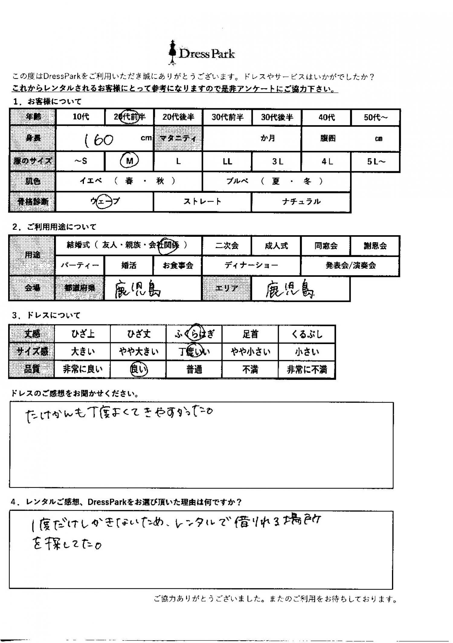 鹿児島県 H.M様160㎝ Mサイズ #20代#M/L#160~164㎝#結婚式(会社関係)#鹿児島県 ◆レンタルしたドレスはこちら ◆レンタルしたサイズは:M ◆レンタルした日付:2025/11/08 ドレスの着用感 ◆点数: (4点) ◆丈感:ふくらはぎ ◆サイズ感:丁度いい ◆品質:良い ◆骨格診断:ウェーブ ドレスの感想 丈感もちょうど良くて着やすかった。 レンタルのご感想、DressParkをお選び頂いた理由 1度だけしか着ないため、レンタルで借りられる場所を探していた。 CUSTOMER REVIEWS お客様の声 気になるカテゴリー別にご利用の感想をチェック! ◆AGE 年代で見る 10代 20代 30代 40代 50代~ ◆SIZE サイズで見る SS/S M/L 大きいサイズLL~ ◆HIGHT 身長で見る 140~149㎝ 150~154㎝ 155~159㎝ 160~164㎝ 165~169㎝ 170㎝以上 ◆マタニティ ~3か月 4~6か月 7~8か月 9~10か月 ◆肌色 イエベ ブルべ ◆骨格診断 ウェーブ ストレート ナチュラル ◆利用シーン 結婚式(友人) 結婚式(親族) 結婚式(会社関係) 二次会 成人式 謝恩会 パーティー その他 CUSTOMER REVIEWS都道府県別お客様の声 都道府県別にのお客様の声をチェック! 北海道 青森県 岩手県 宮城県 秋田県 山形県 福島県 茨城県 栃木県 群馬県 埼玉県 千葉県 東京都 神奈川県 新潟県 富山県 石川県 福井県 山梨県 長野県 岐阜県 静岡県 愛知県 三重県 滋賀県 京都府 大阪府 兵庫県 奈良県 和歌山県 鳥取県 島根県 岡山県 広島県 山口県 徳島県 香川県 愛媛県 高知県 福岡県 佐賀県 長崎県 熊本県 大分県 宮崎県 鹿児島県 沖縄県 CUSTOMER REVIEWSエリア別お客様の声 都道府県別にのお客様の声をチェック! 札幌 仙台 名古屋 軽井沢 金沢 神戸・芦屋 博多 那覇 梅田・新大阪 難波・心斎橋 鎌倉・湘南 横浜・みなとみらい 舞浜・浦安・幕張 大宮・浦和 青山・表参道 六本木・麻布 渋谷・恵比寿 新宿 池袋 銀座・丸の内 お台場・汐留 鹿児島市 郡山市 福島市 東予 甲府・石和 LINEでお問い合わせ このサイトではJavaScriptを使用しています