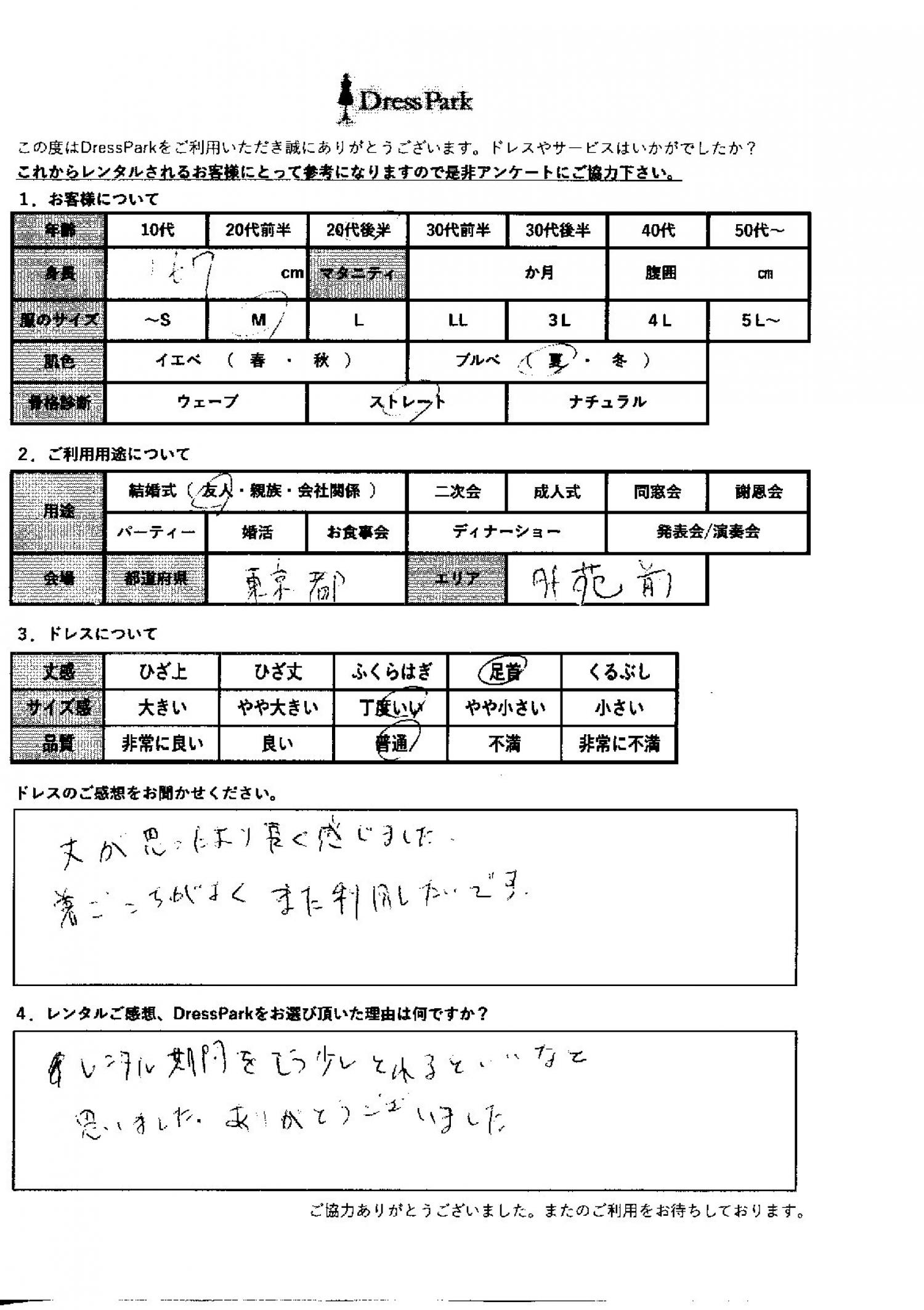 東京都 H.T様167㎝ Mサイズ青山・表参道 #20代#M/L#165~169㎝#結婚式(友人)#東京都#青山・表参道 ◆レンタルしたドレスはこちら ◆レンタルしたサイズは:M ◆レンタルした日付:2025/11/15 ドレスの着用感 ◆点数: (4点) ◆丈感:足首 ◆サイズ感:丁度いい ◆品質:普通 ◆肌色:ブルべ ◆骨格診断:ストレート ドレスの感想 丈が思ったより長く感じました。着心地が良くまた利用したいです。 レンタルのご感想、DressParkをお選び頂いた理由 レンタル期間をもう少し取れるといいなと思いました。ありがとうございました。 CUSTOMER REVIEWS お客様の声 気になるカテゴリー別にご利用の感想をチェック! ◆AGE 年代で見る 10代 20代 30代 40代 50代~ ◆SIZE サイズで見る SS/S M/L 大きいサイズLL~ ◆HIGHT 身長で見る 140~149㎝ 150~154㎝ 155~159㎝ 160~164㎝ 165~169㎝ 170㎝以上 ◆マタニティ ~3か月 4~6か月 7~8か月 9~10か月 ◆肌色 イエベ ブルべ ◆骨格診断 ウェーブ ストレート ナチュラル ◆利用シーン 結婚式(友人) 結婚式(親族) 結婚式(会社関係) 二次会 成人式 謝恩会 パーティー その他 CUSTOMER REVIEWS都道府県別お客様の声 都道府県別にのお客様の声をチェック! 北海道 青森県 岩手県 宮城県 秋田県 山形県 福島県 茨城県 栃木県 群馬県 埼玉県 千葉県 東京都 神奈川県 新潟県 富山県 石川県 福井県 山梨県 長野県 岐阜県 静岡県 愛知県 三重県 滋賀県 京都府 大阪府 兵庫県 奈良県 和歌山県 鳥取県 島根県 岡山県 広島県 山口県 徳島県 香川県 愛媛県 高知県 福岡県 佐賀県 長崎県 熊本県 大分県 宮崎県 鹿児島県 沖縄県 CUSTOMER REVIEWSエリア別お客様の声 都道府県別にのお客様の声をチェック! 札幌 仙台 名古屋 軽井沢 金沢 神戸・芦屋 博多 那覇 梅田・新大阪 難波・心斎橋 鎌倉・湘南 横浜・みなとみらい 舞浜・浦安・幕張 大宮・浦和 青山・表参道 六本木・麻布 渋谷・恵比寿 新宿 池袋 銀座・丸の内 お台場・汐留 鹿児島市 郡山市 福島市 東予 甲府・石和 LINEでお問い合わせ このサイトではJavaScriptを使用しています